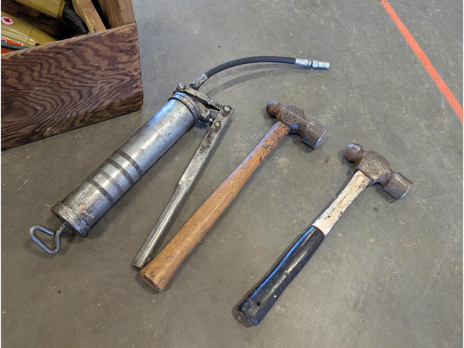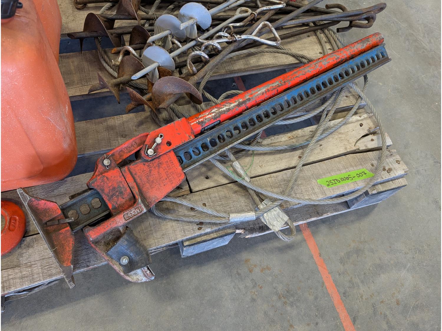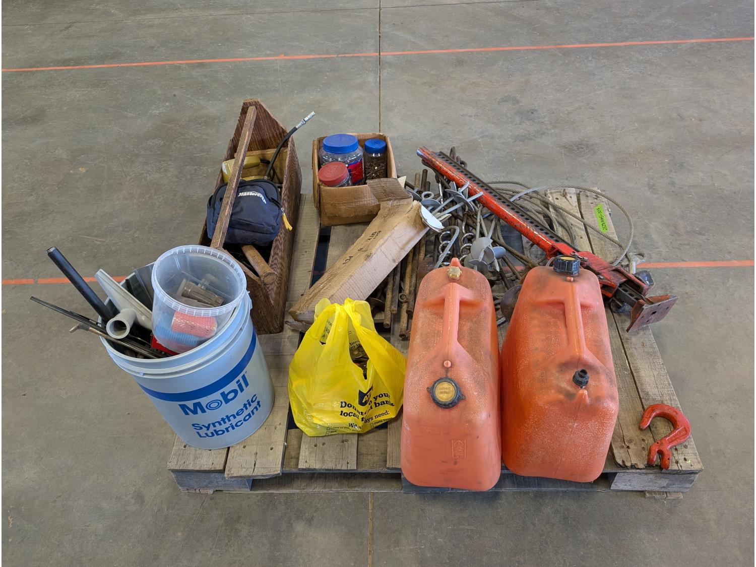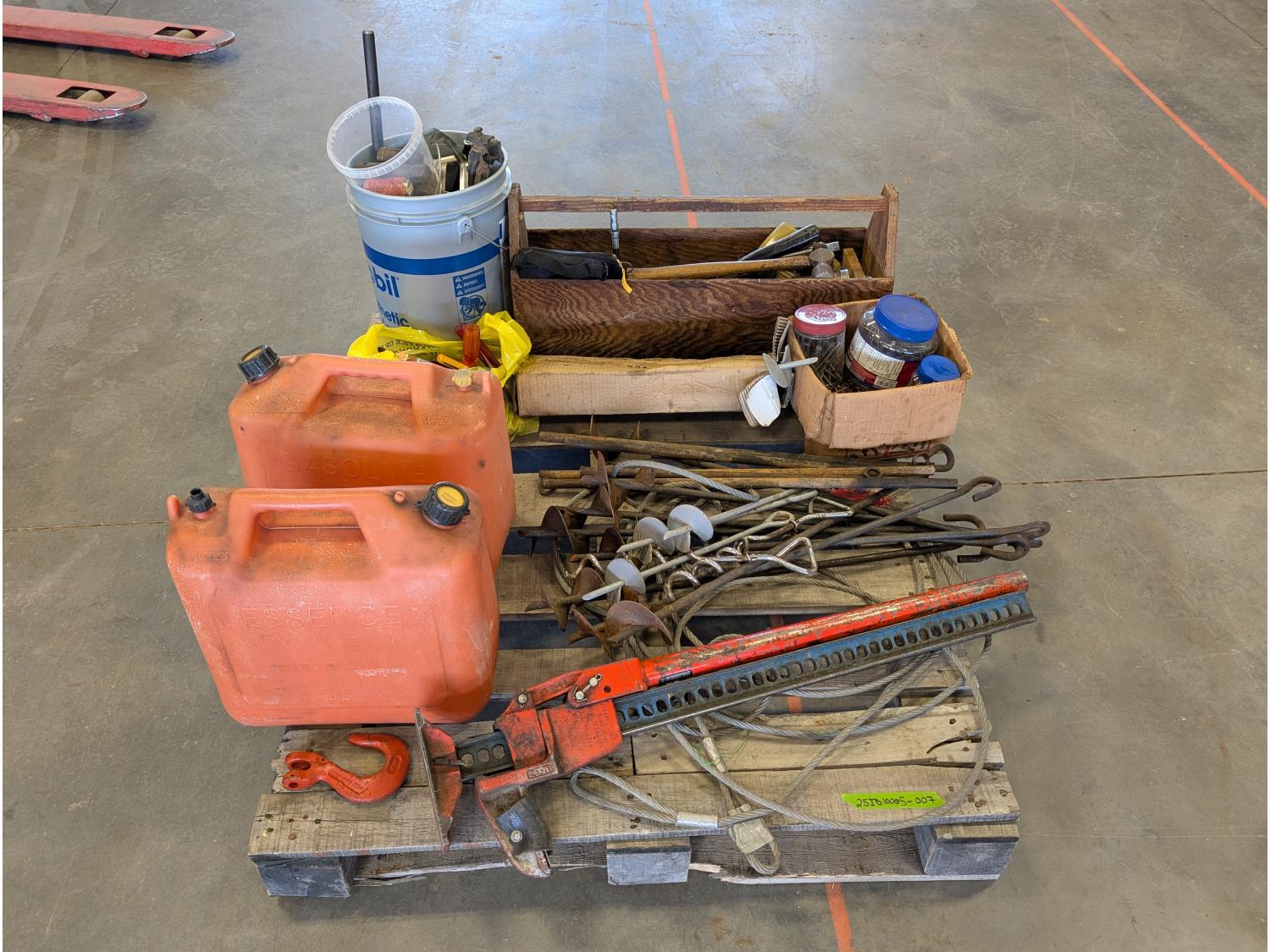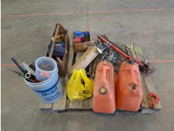 Jack-all, (2) jerry cans, qty of ground anchors, nails, cordless drill, (2) hammers, grease gun, hand tools