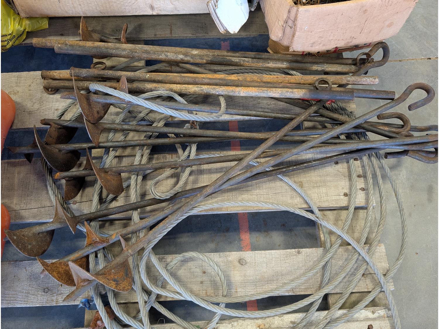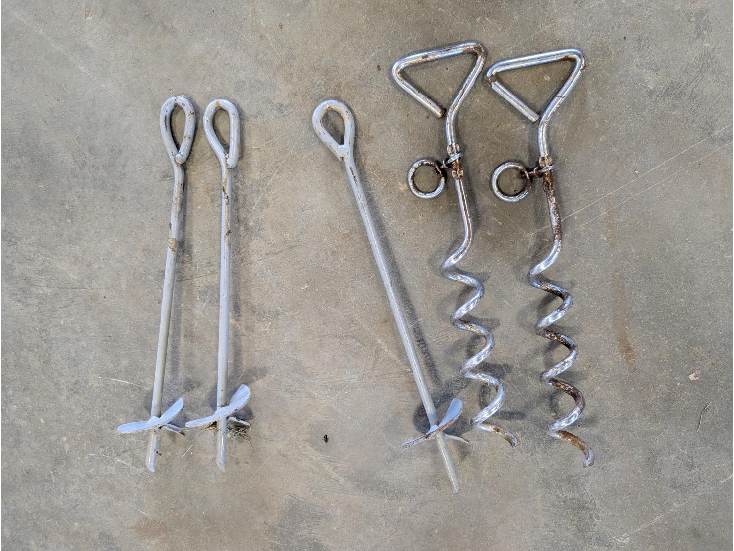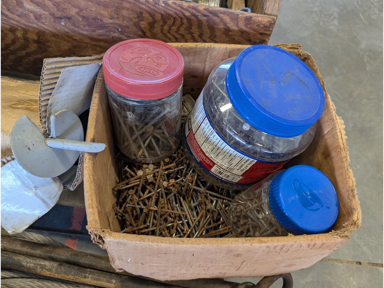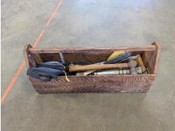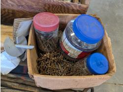 Jack-all, (2) jerry cans, qty of ground anchors, nails, cordless drill, (2) hammers, grease gun, hand tools