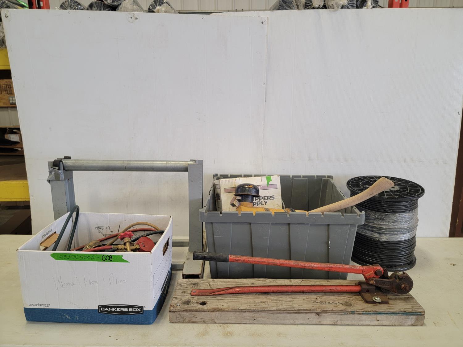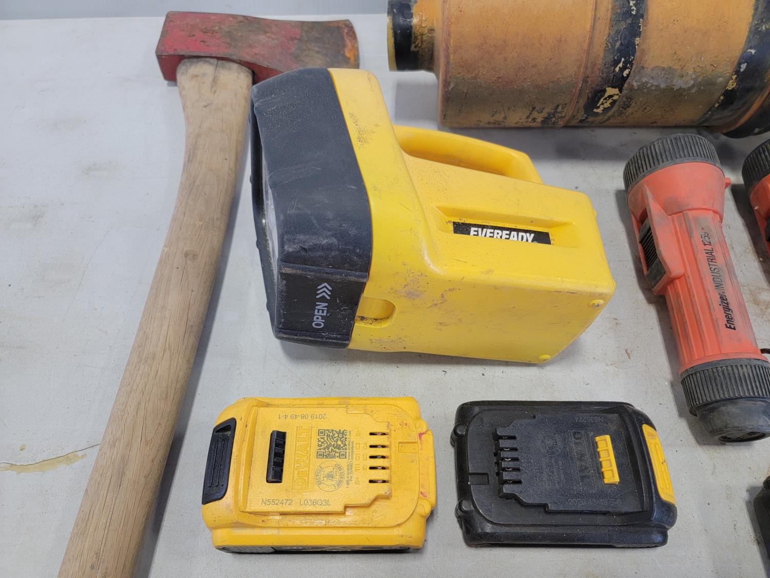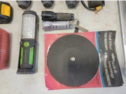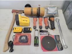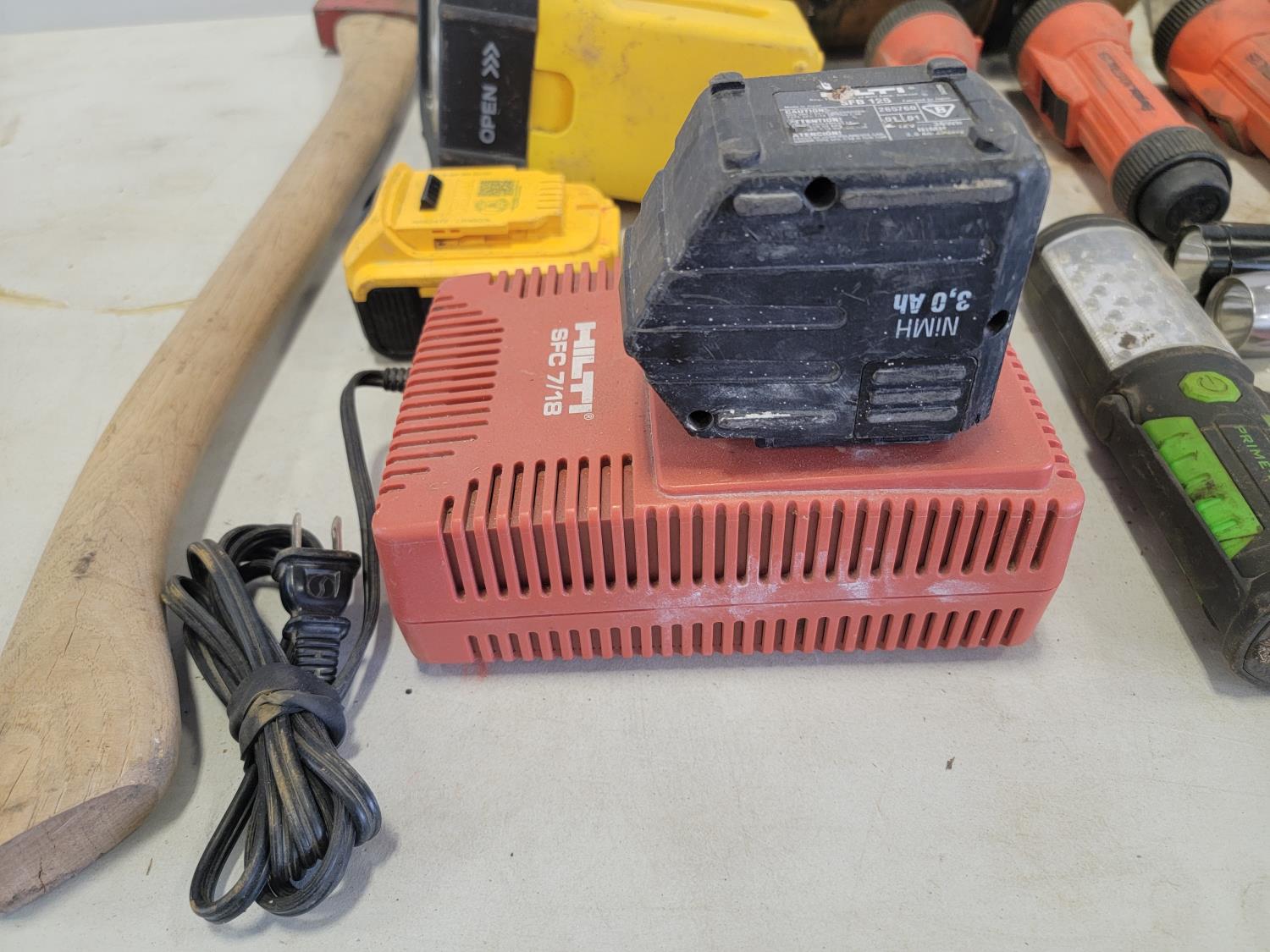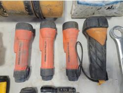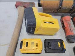 Flashlights, Hilti battery charger, Dewalt batteries, axe, welding rods, gauges, 7/16" threaded rod cutter and portable reel stand