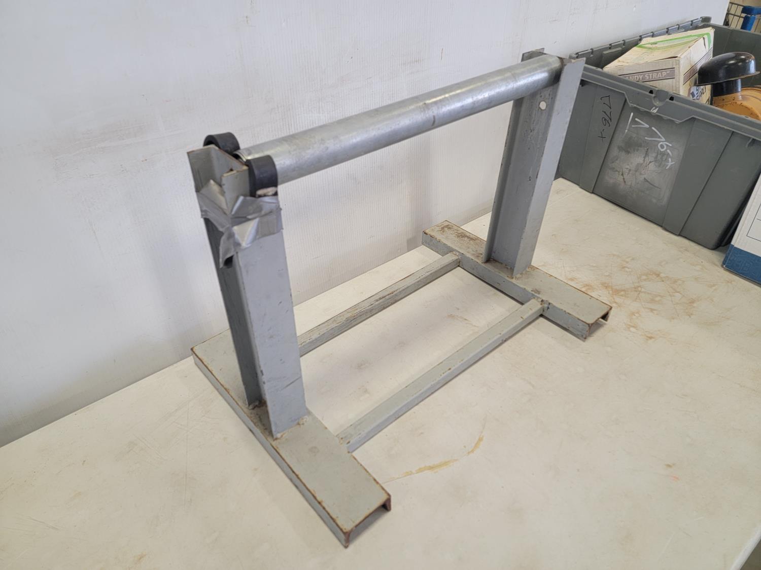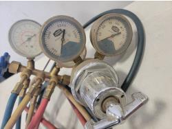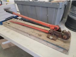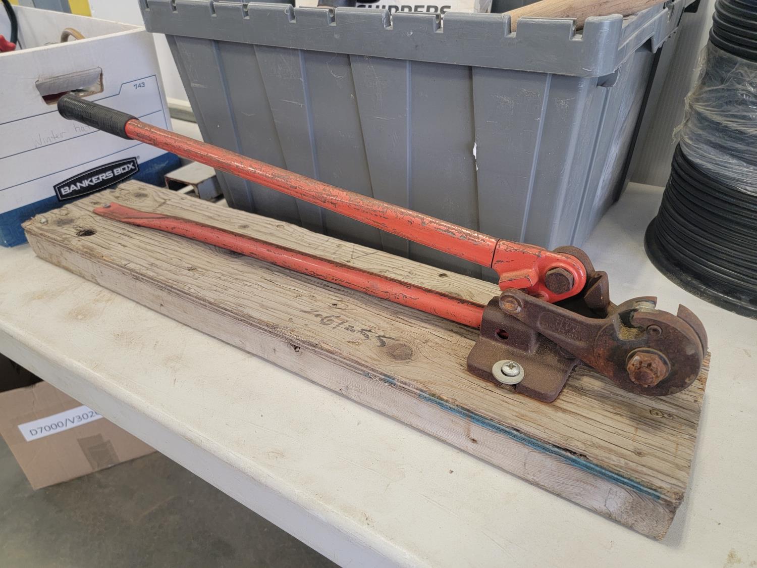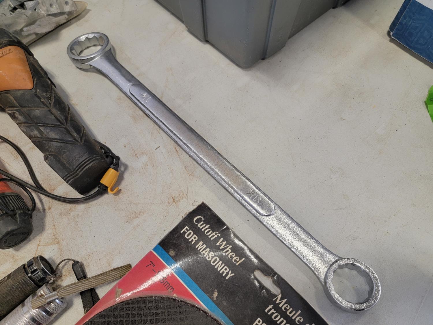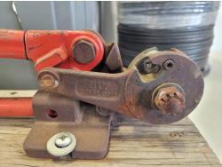 Flashlights, Hilti battery charger, Dewalt batteries, axe, welding rods, gauges, 7/16" threaded rod cutter and portable reel stand