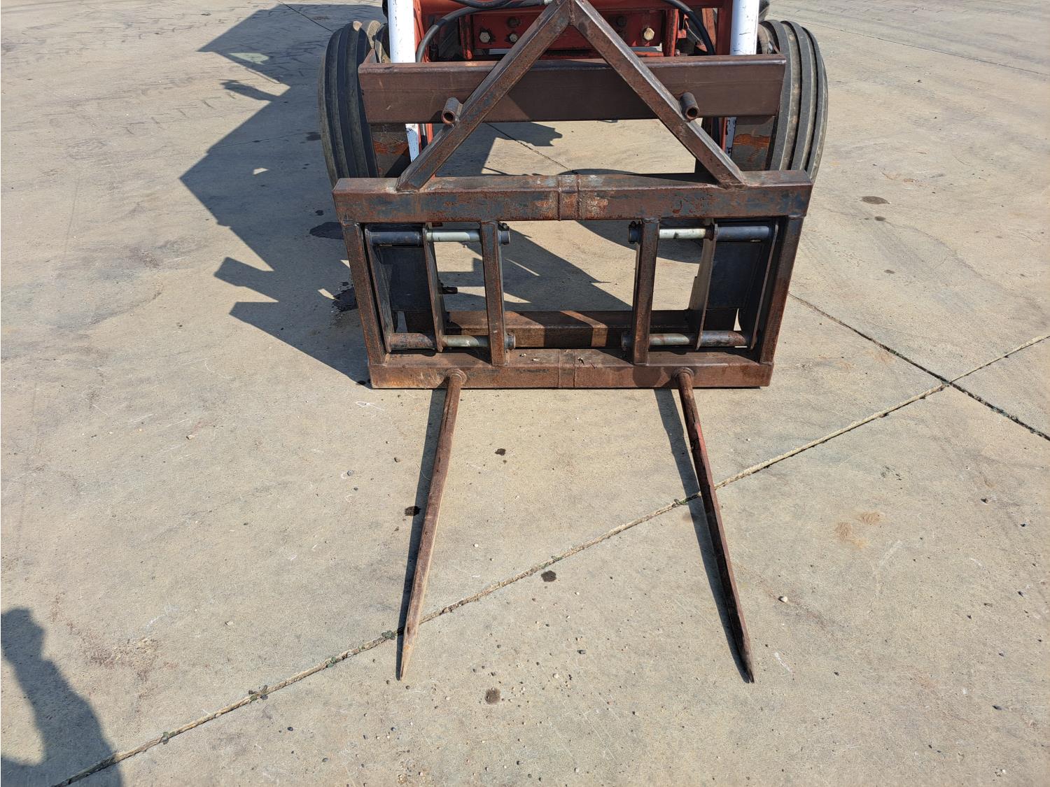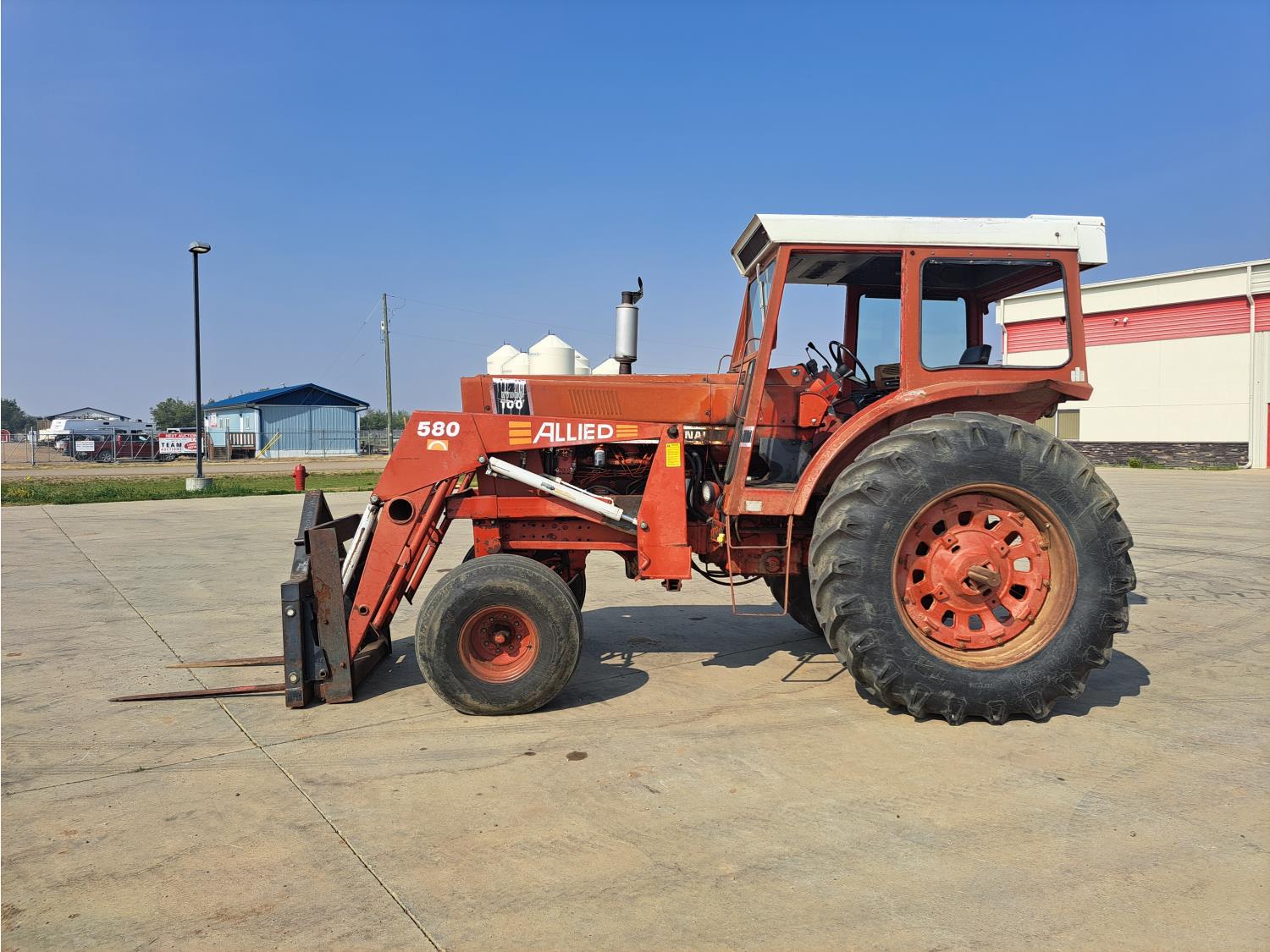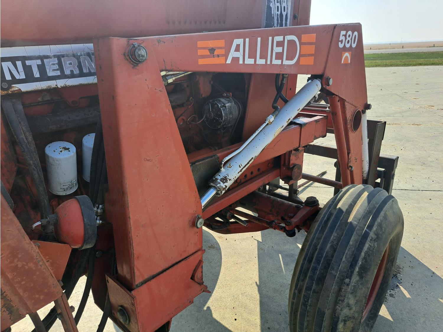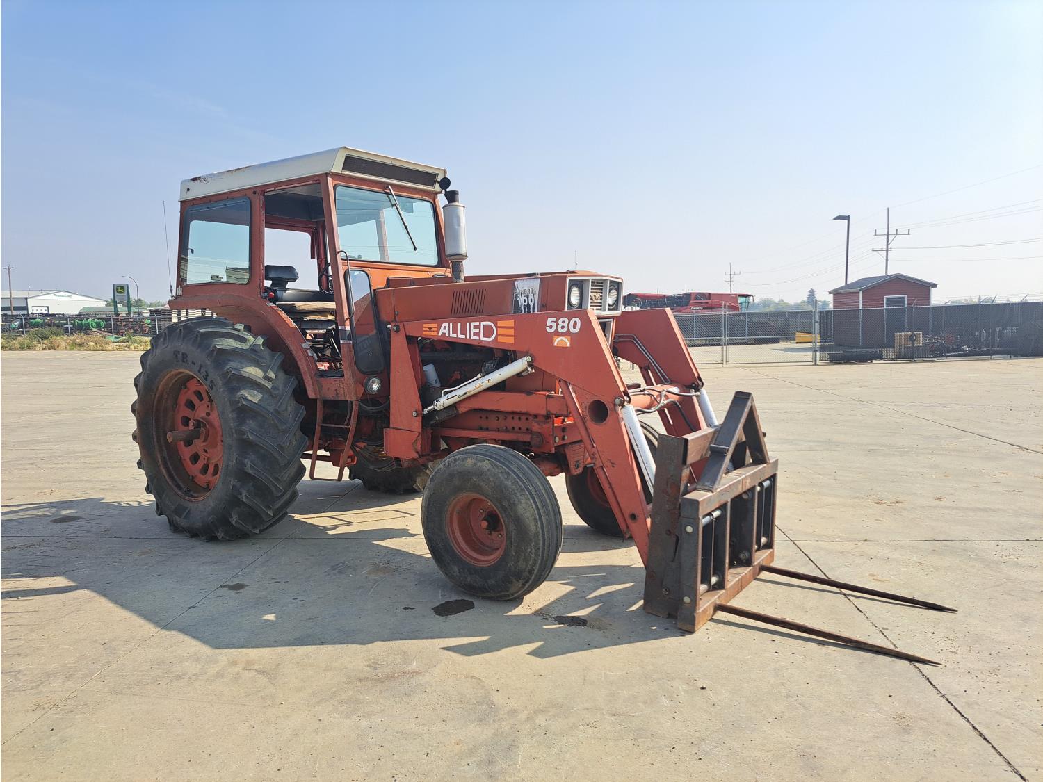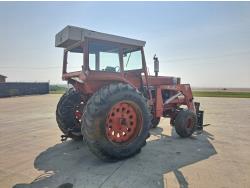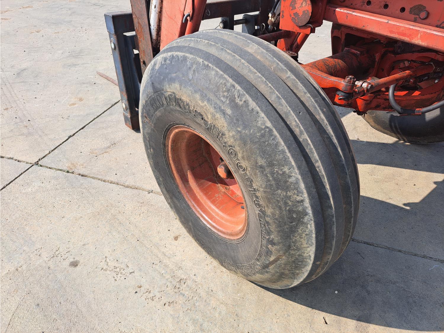 Allied 580 loader, 72 inch bucket, bale forks, International 7.1 L 6 cylinder 115 HP, diesel engine, 104 PTO HP, hydro 2 range transmission, 540/1000 PTO, 2 rear hydraulic outlets, 11.00-16 front tires, 20.8-38 rear tires