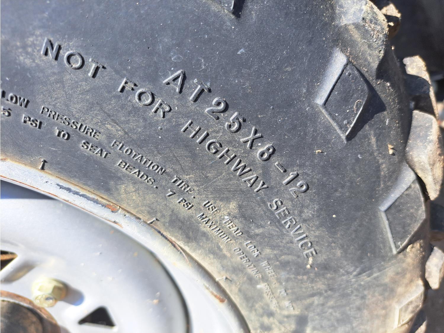 371 cc engine, manual transmission, Hi/Lo range, reverse, hitch, front and rear racks, front winch, 25X8-12 front tires, 25X10-12 rear tires