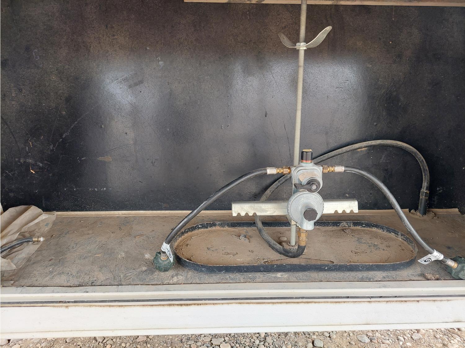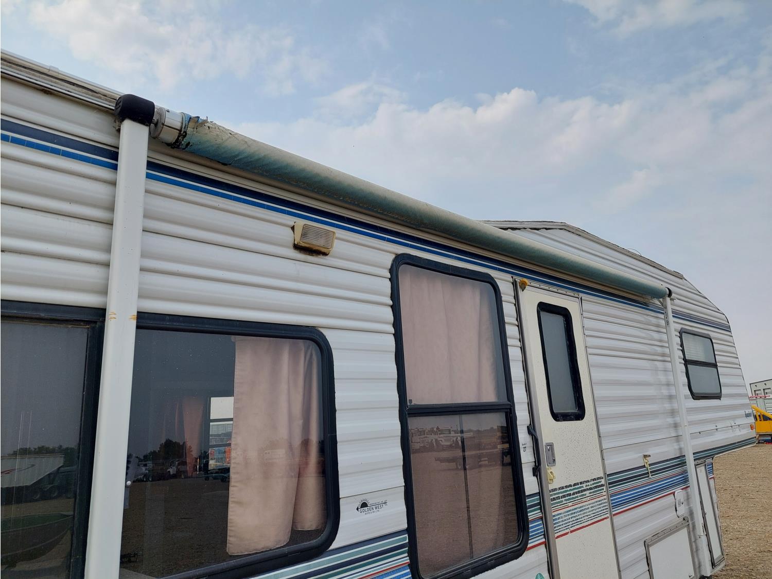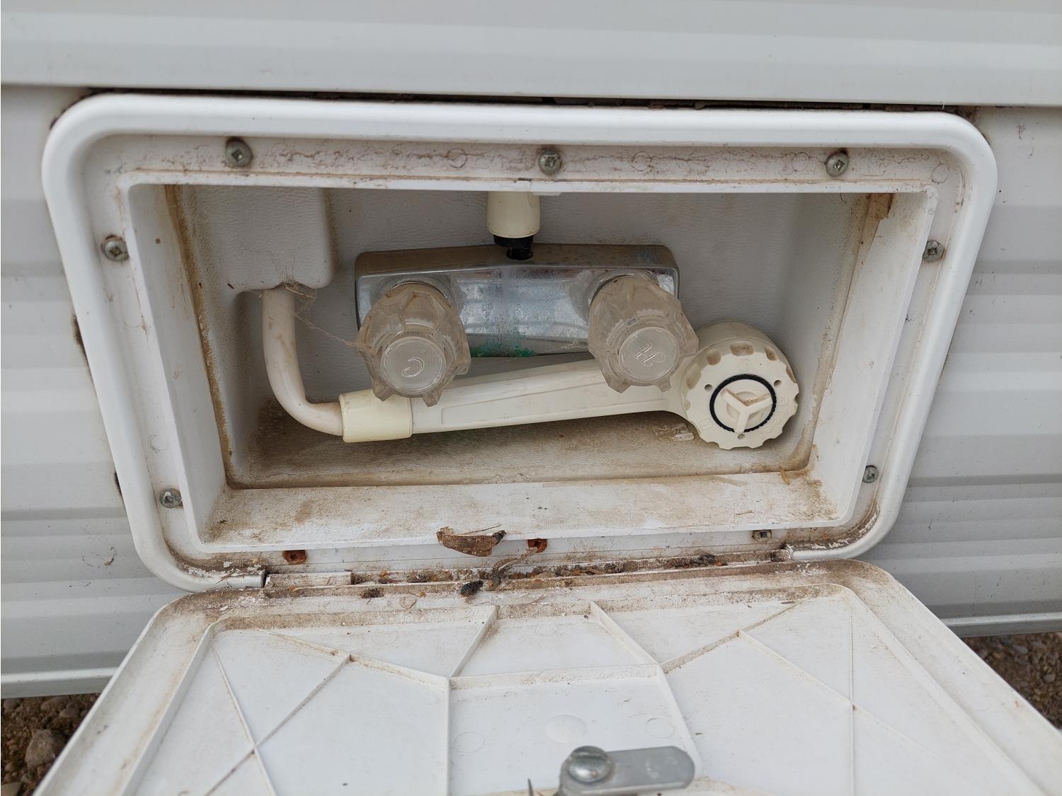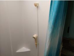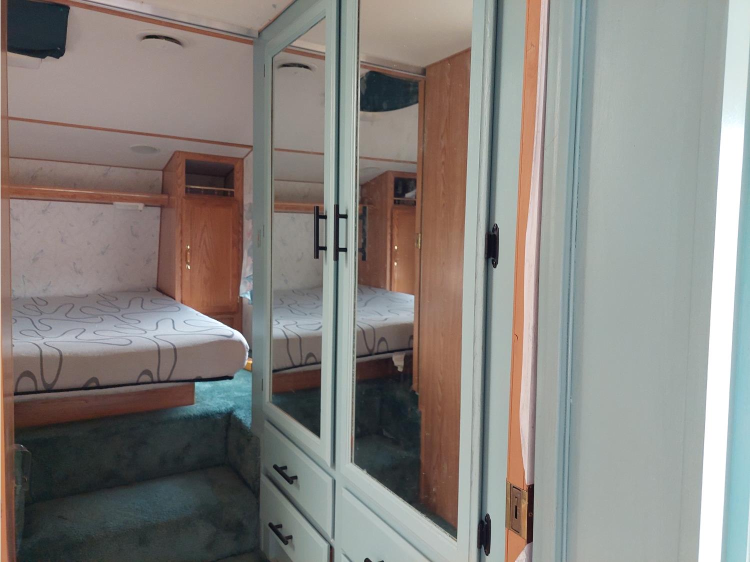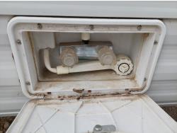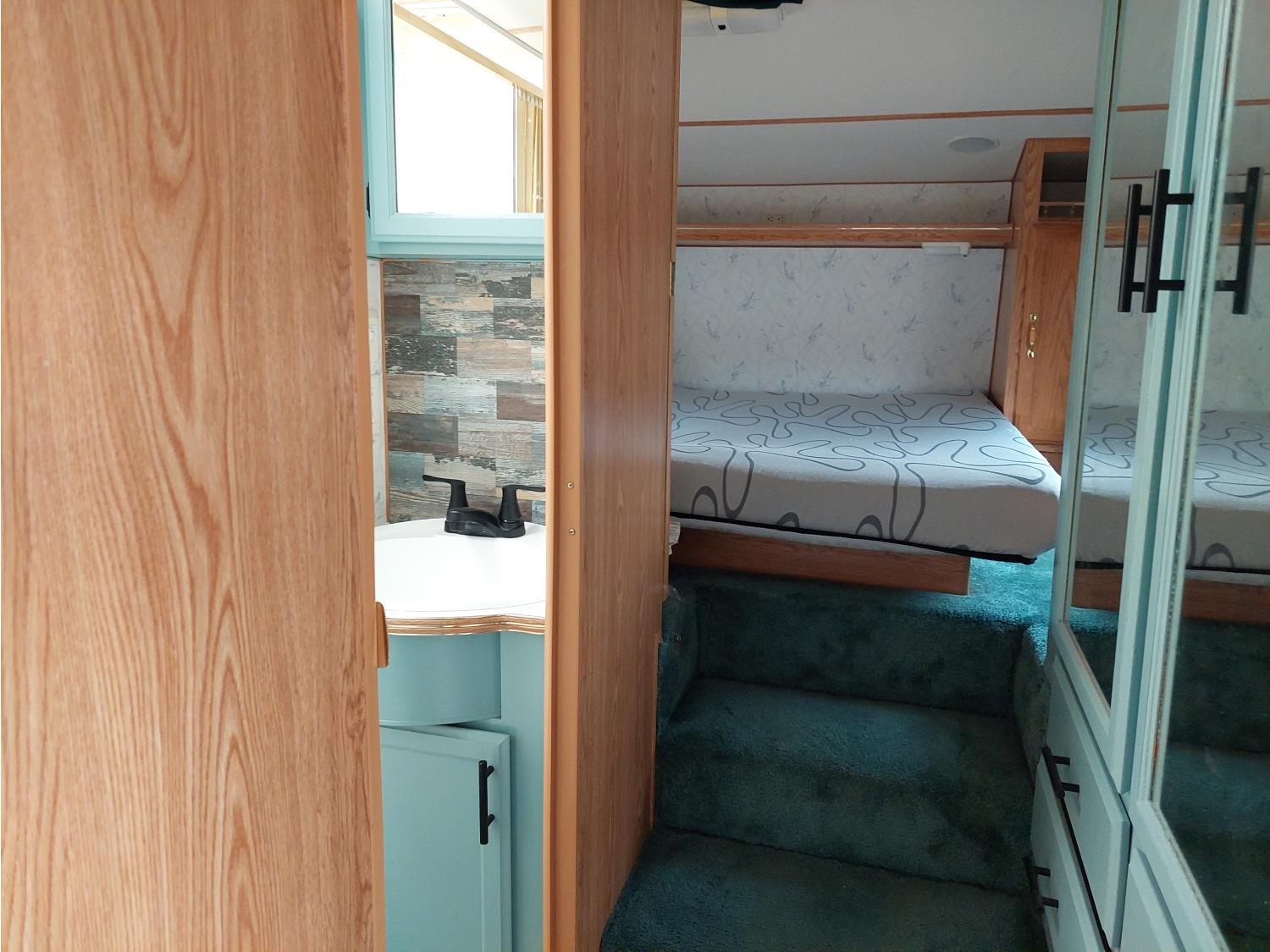 Sleeps 6, stove, fridge, microwave, full bath, master bedroom, A/C, outdoor shower, manual awning, spring suspension, electric brakes, rear scissor jacks, 205/75R15 tires