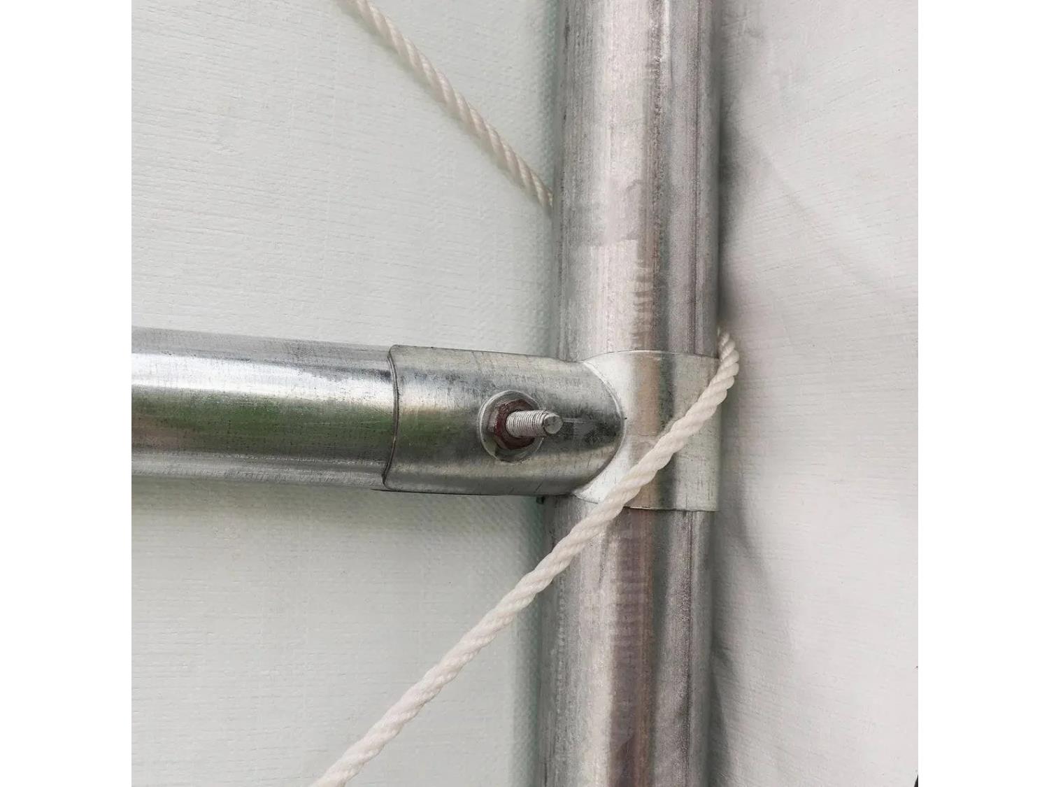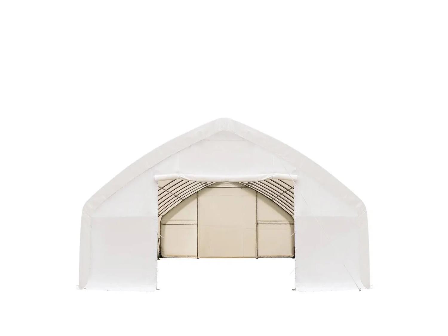 collar beams added on end trusses, dirt skirt, roll-up doors, commercial 3-layer galvanized steel frame structure, commercial triple layer ripstop polyethylene tarpaulin cover.