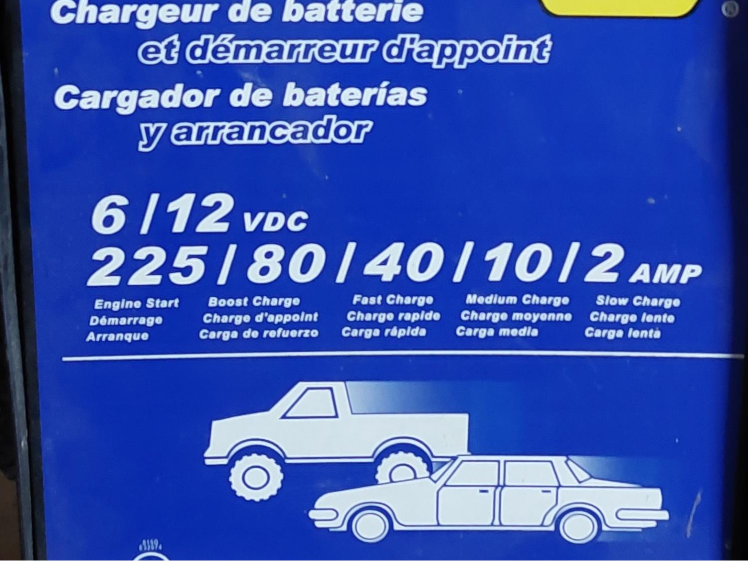 2 amp slow charge, 40 amp fast charge, 225 amp engine start