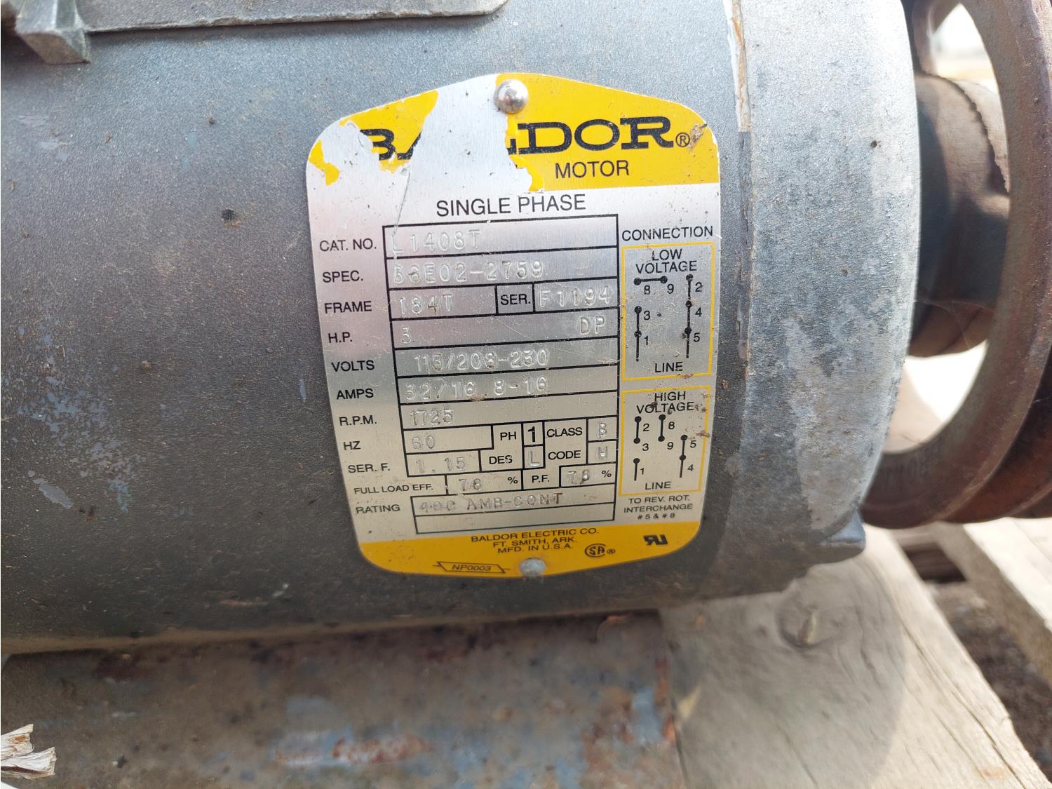 (1) CGE 115/230V, 3/4 HP, single phase, (1) Baldor 115/208-230V, 3HP, single phase, (1) Canadian Westinghouse 110/220V, 1/4HP, single phase, (1) GE 115V, 1/4HP, single phase