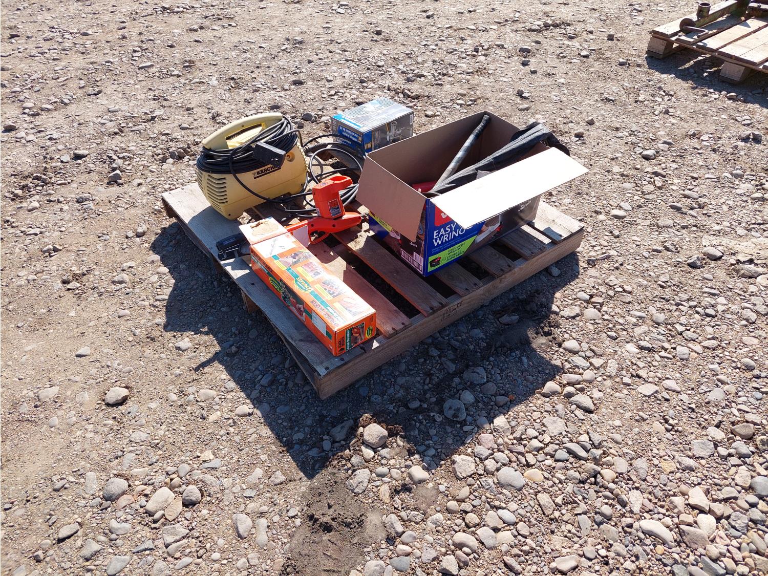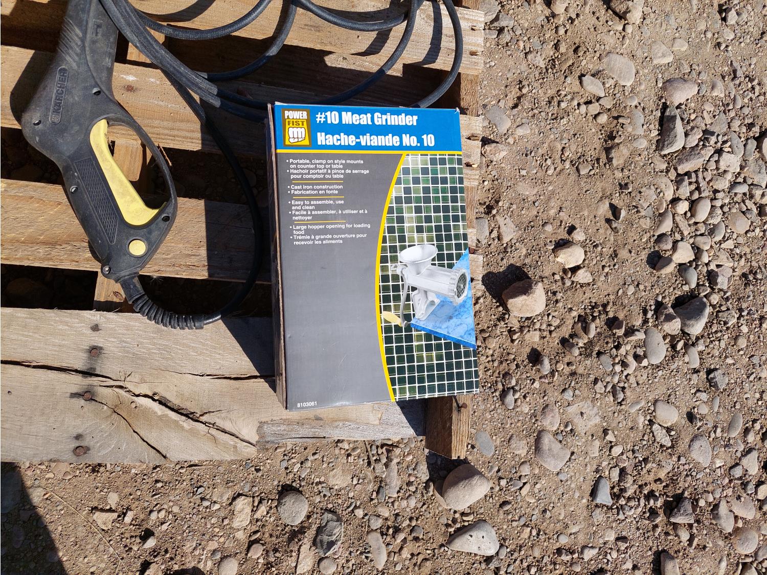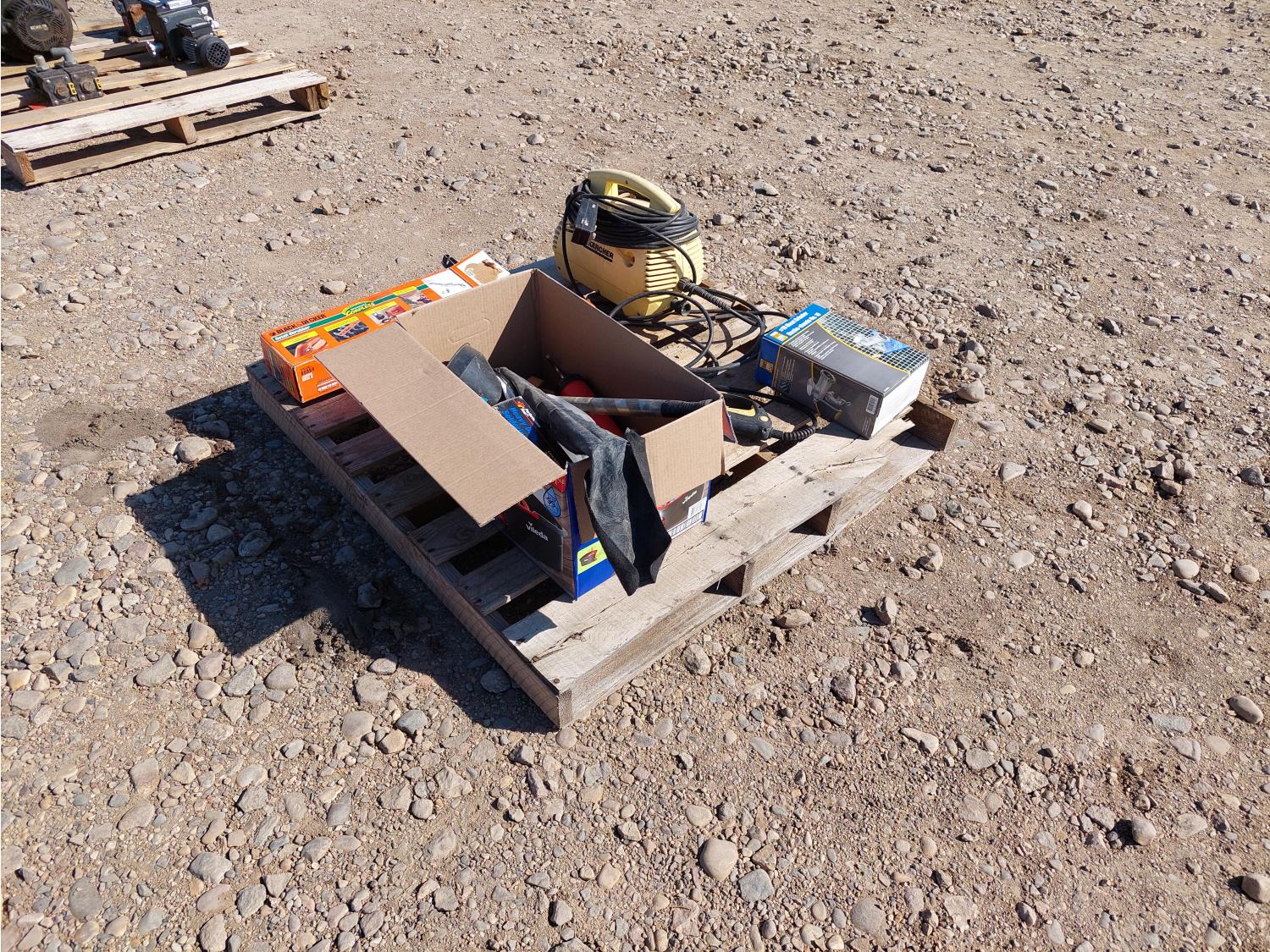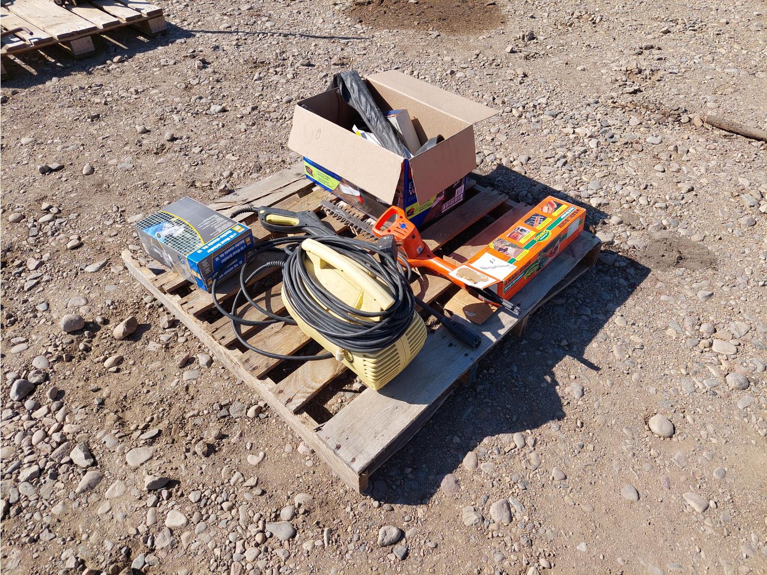 Includes: Karcher 1.3 GPM 120v pressure washer w/ wand, Black & Decker cordless hedge trimmer, Power Fist meat grinder, soldering iron
