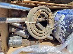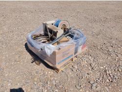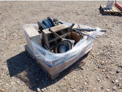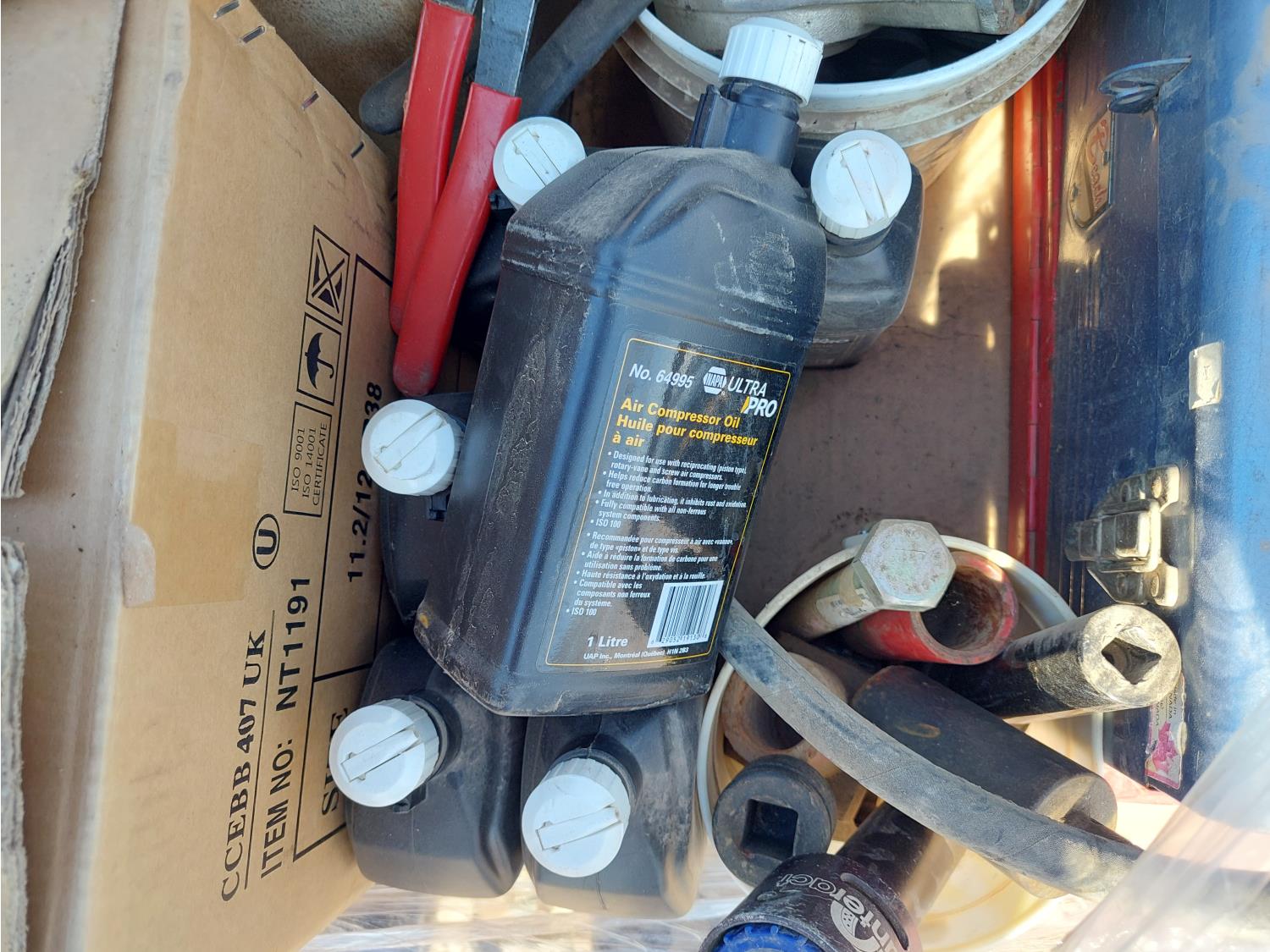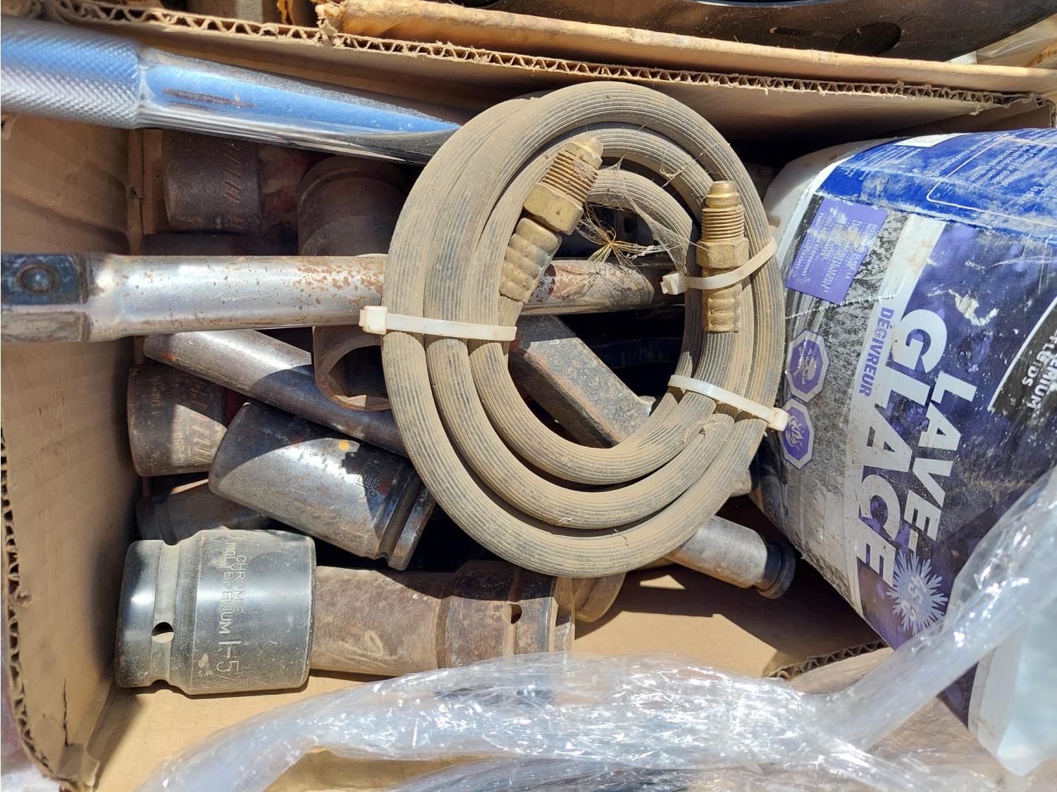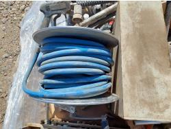 hose reel w/ 1/2 inch air hose, qty of miscellaneous sockets, tire iron, crowbar, pressure washer wand, compressor oil, miscellaneous pulley and hardware