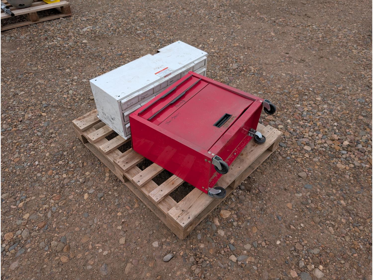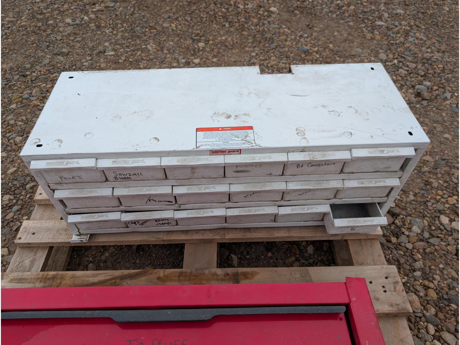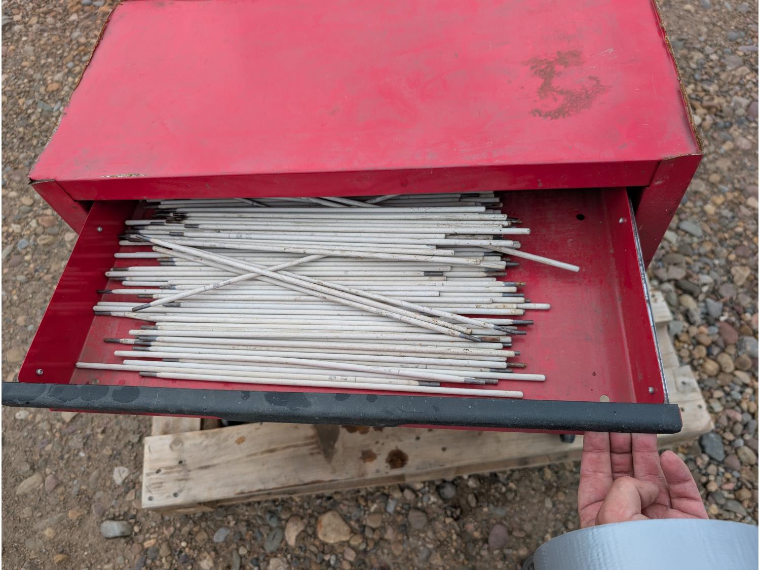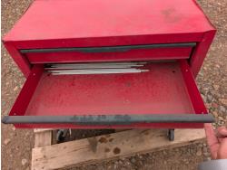 tool cart: 24 inch L x12 inch W x 22 inch H. storage cabinet: 33 inch L x 12 inch W x 13 inch H, holds 18 bins. miscellaneous welding rods.