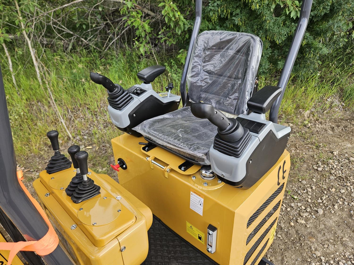 Open station, gas engine, 15 inch dig bucket, manual thumb, 2 Ft 8 inch stick, backfill blade, 7 inch rubber tracks