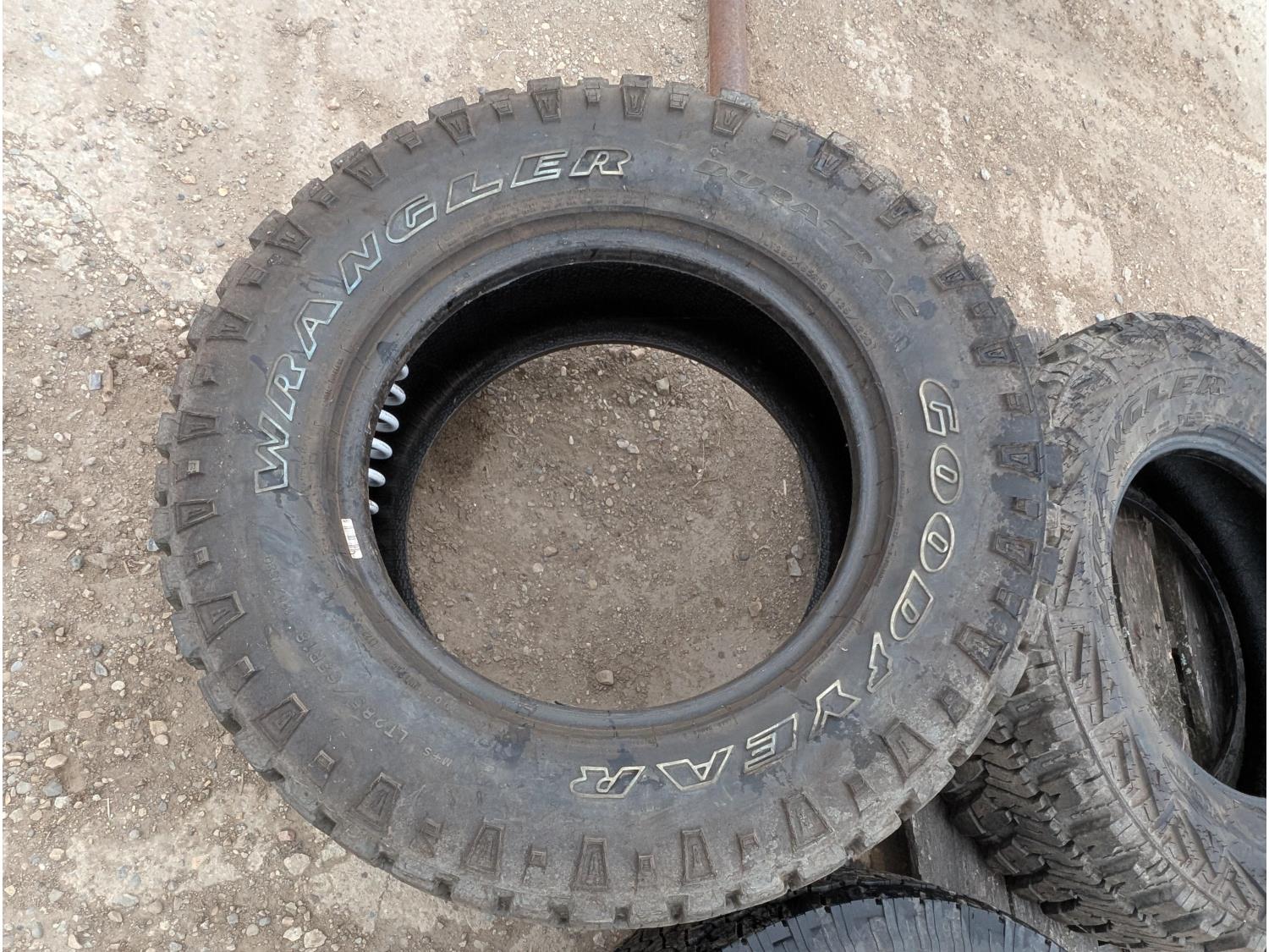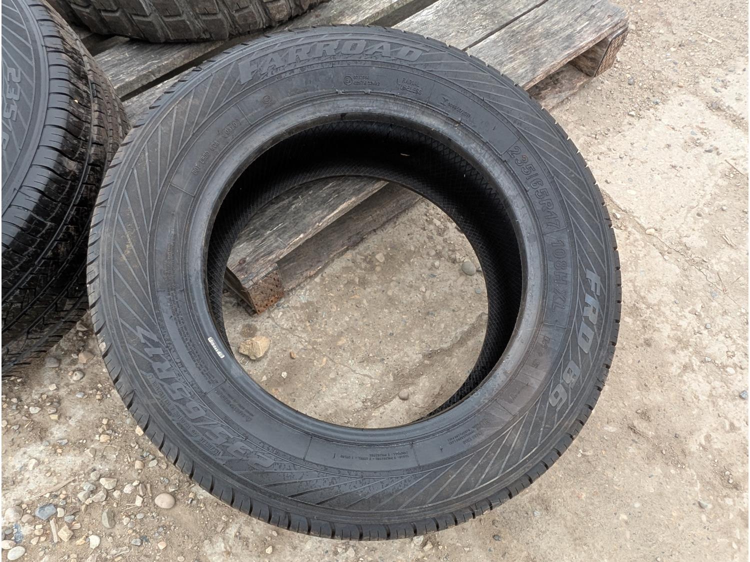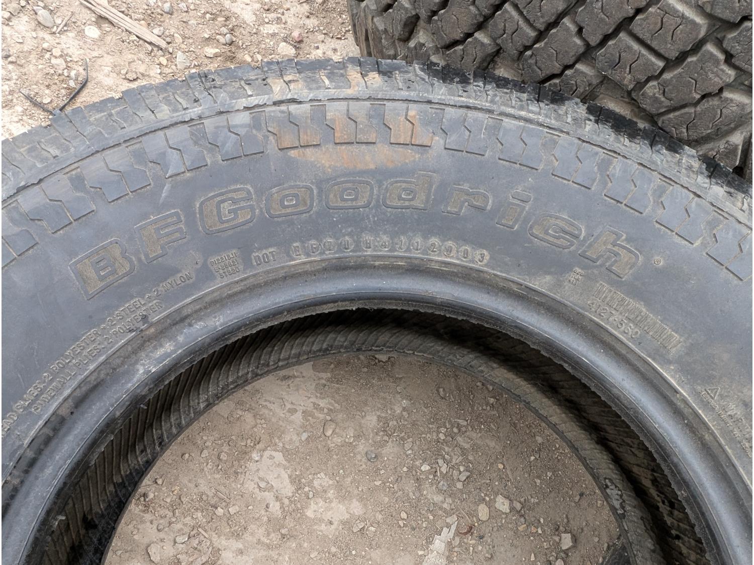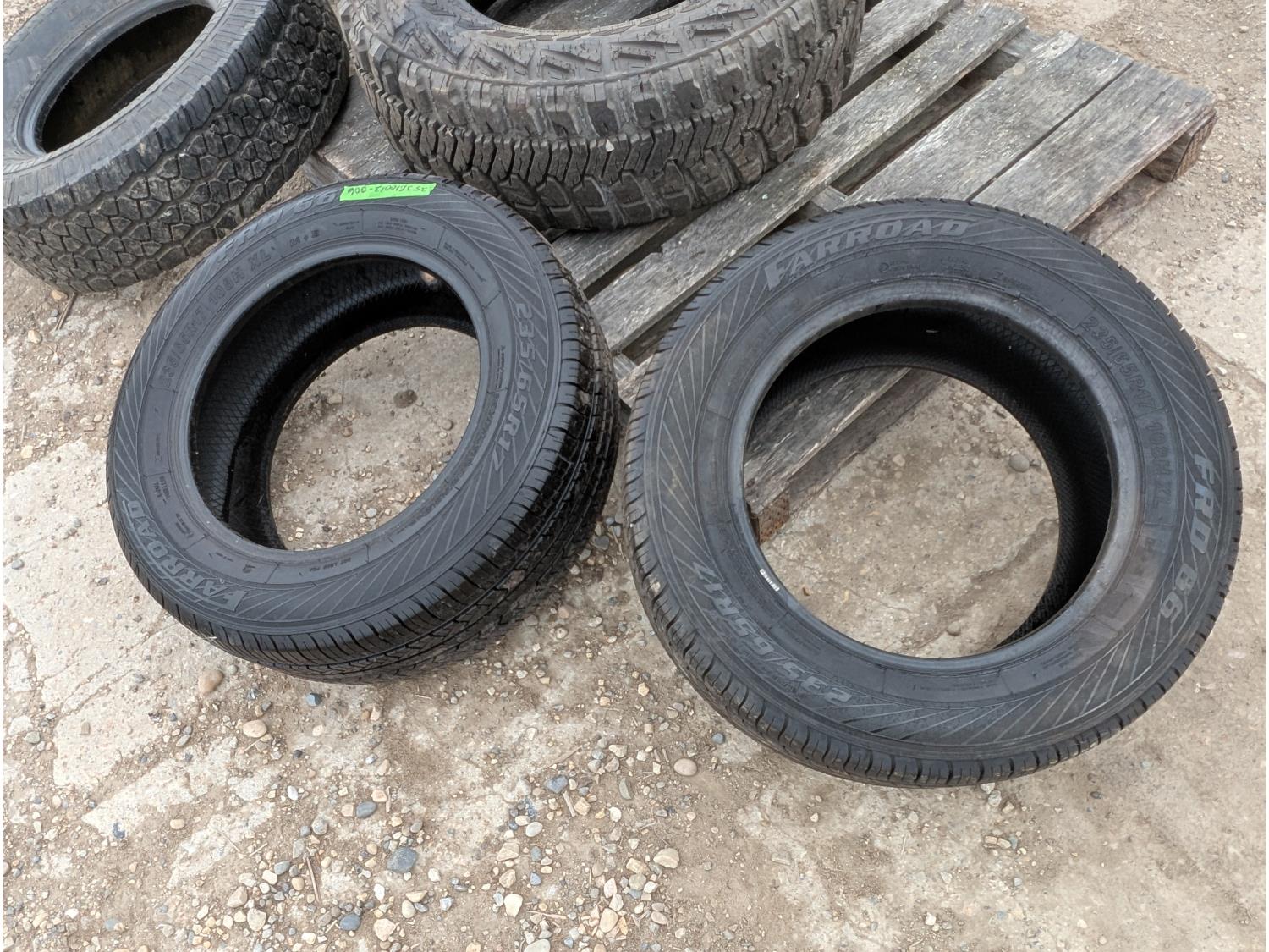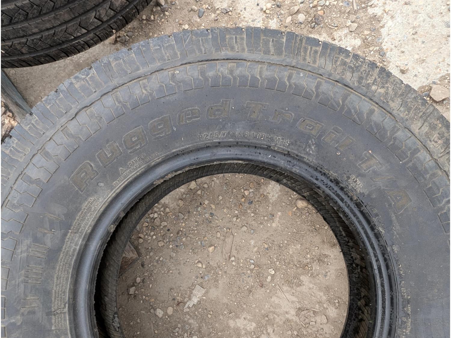 (1) Goodyear Wrangler Duratrac 285/65R18 tire, (1) Goodyear Wrangler 275/70R18 tire, (2) Farroad FRD66 235/65R17 tires, (1) BF Goodrich Rugged Trail 245/75R16 tire