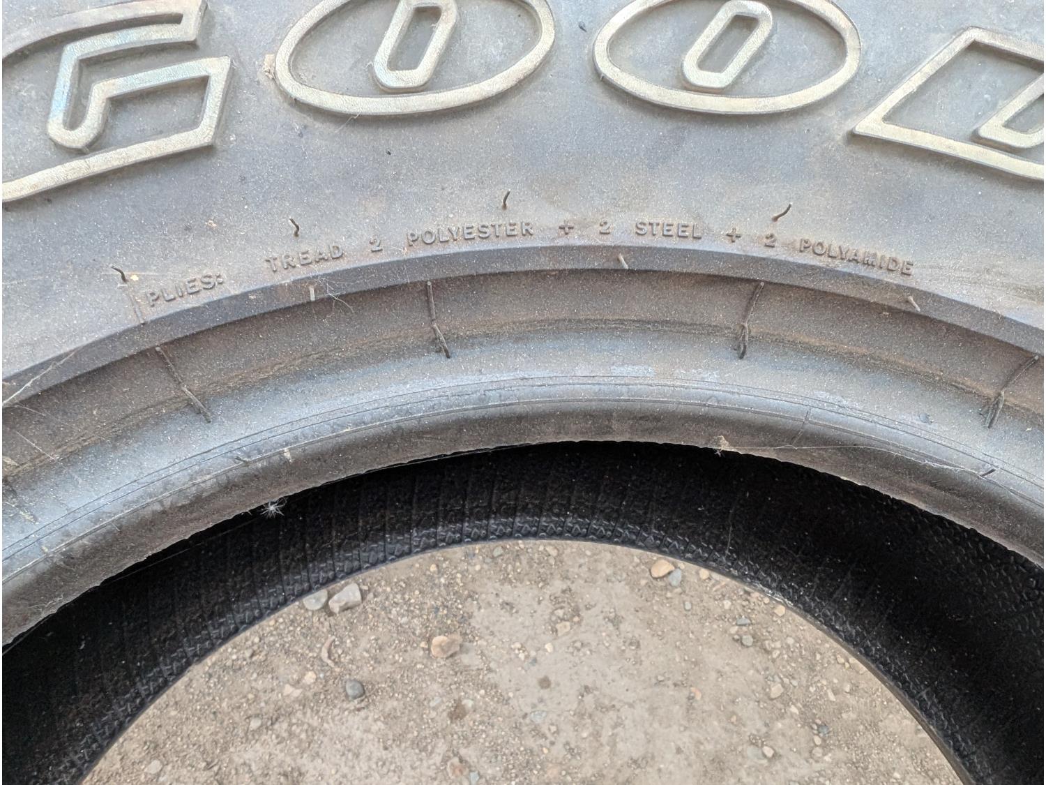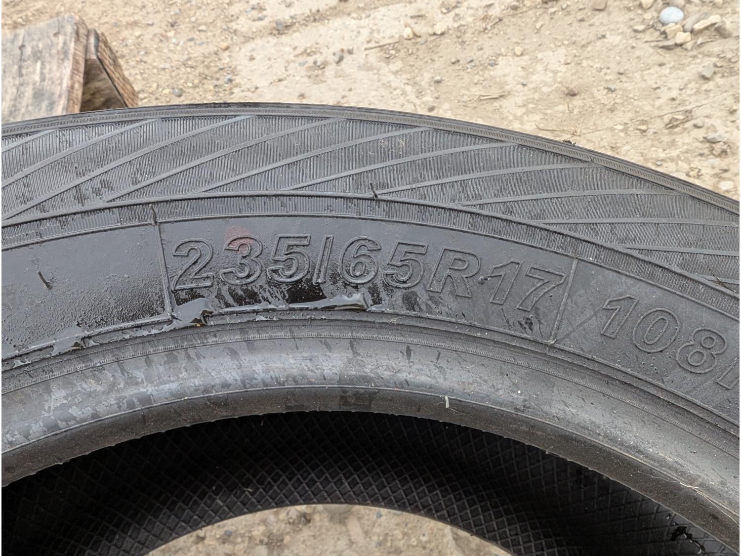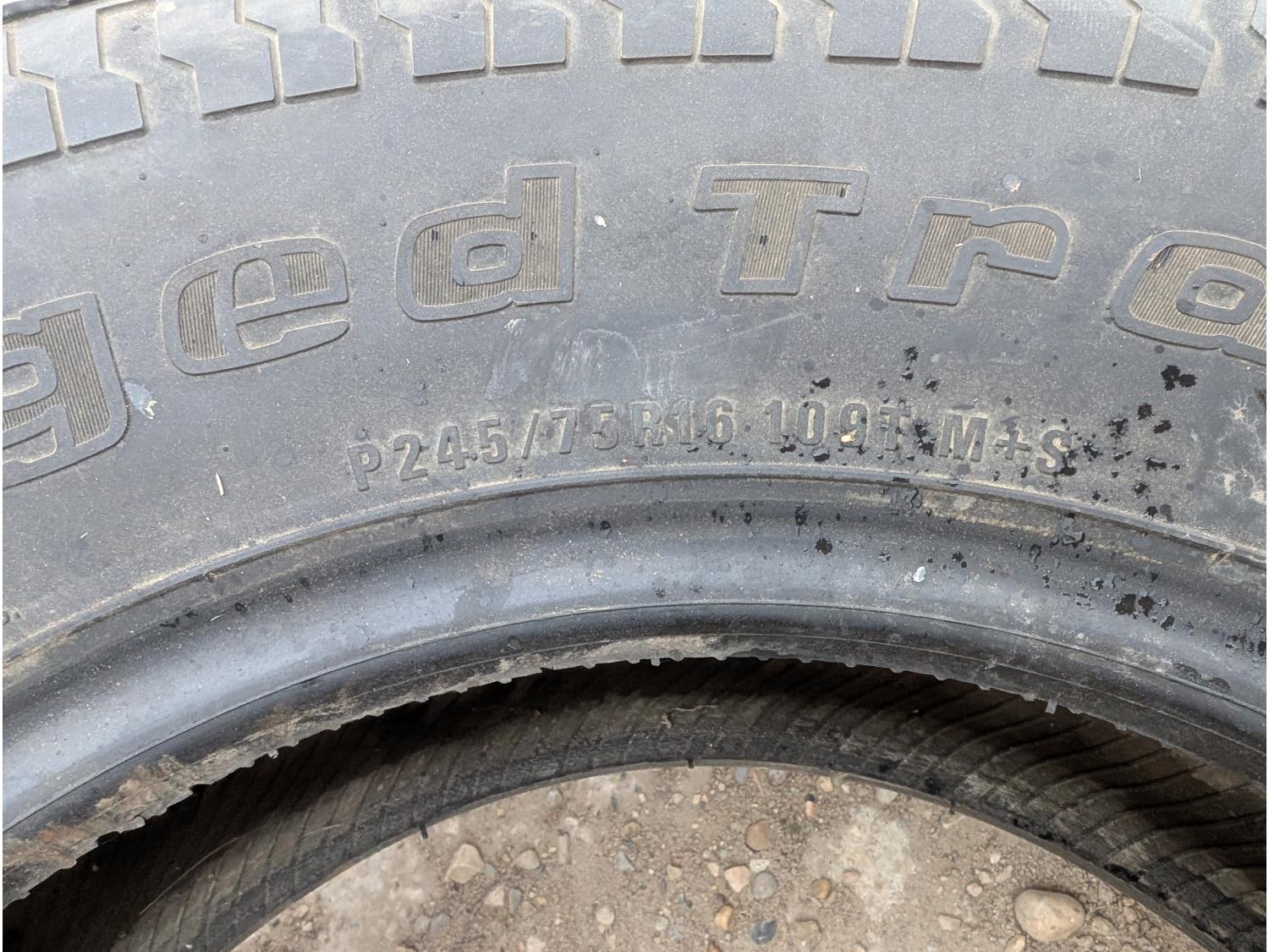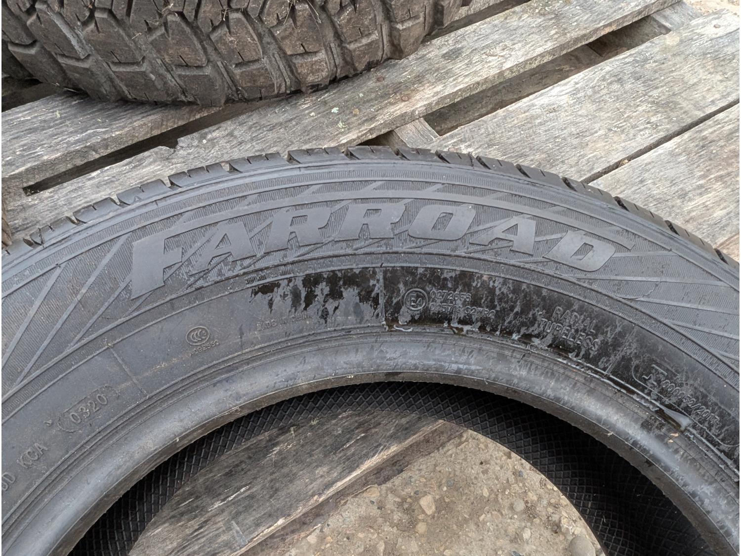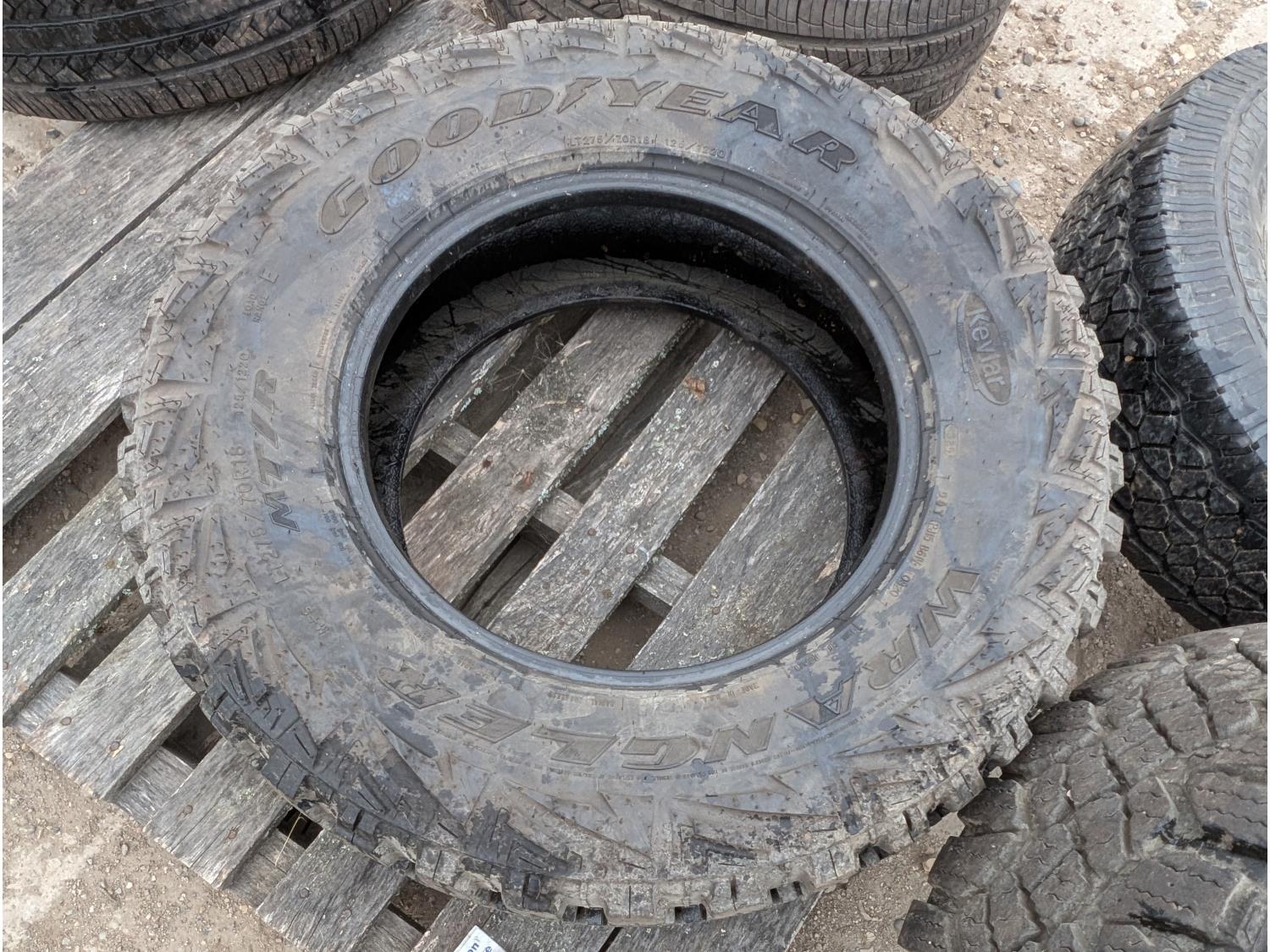 (1) Goodyear Wrangler Duratrac 285/65R18 tire, (1) Goodyear Wrangler 275/70R18 tire, (2) Farroad FRD66 235/65R17 tires, (1) BF Goodrich Rugged Trail 245/75R16 tire
