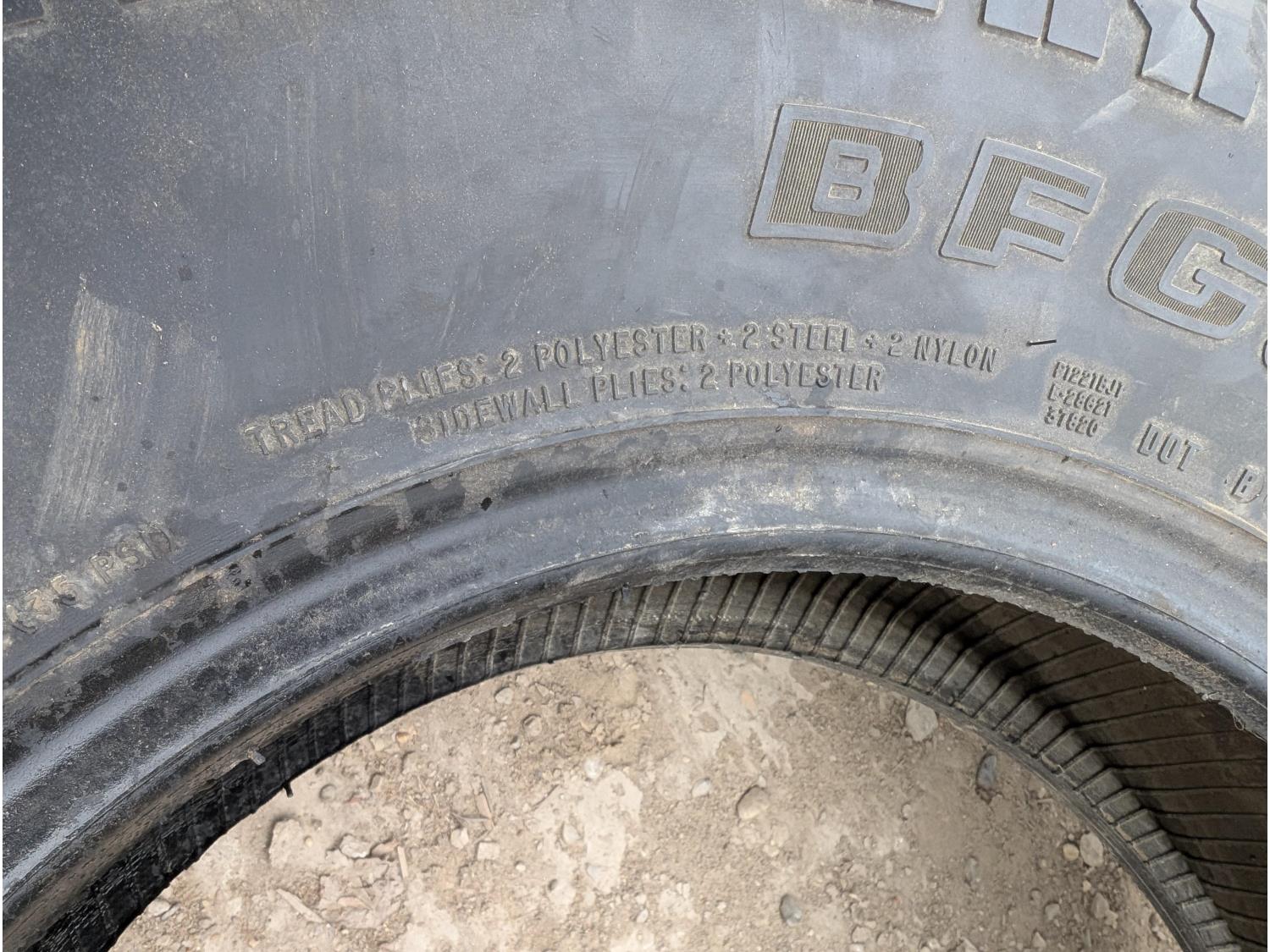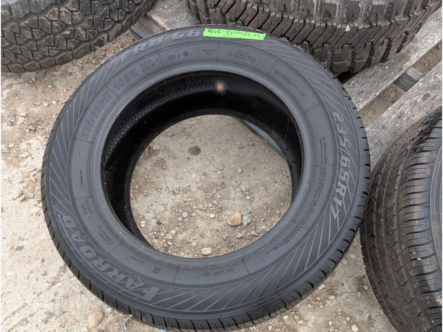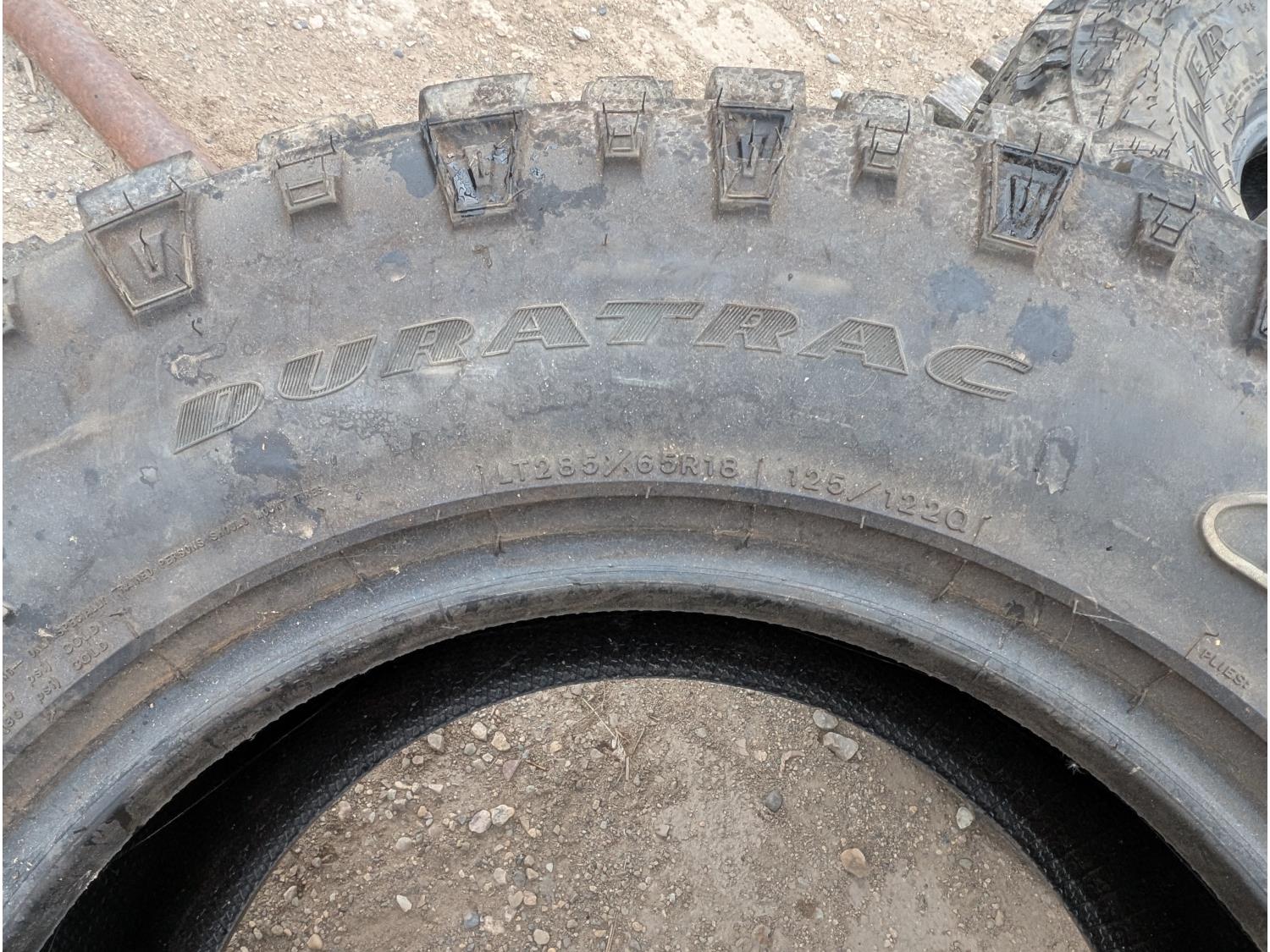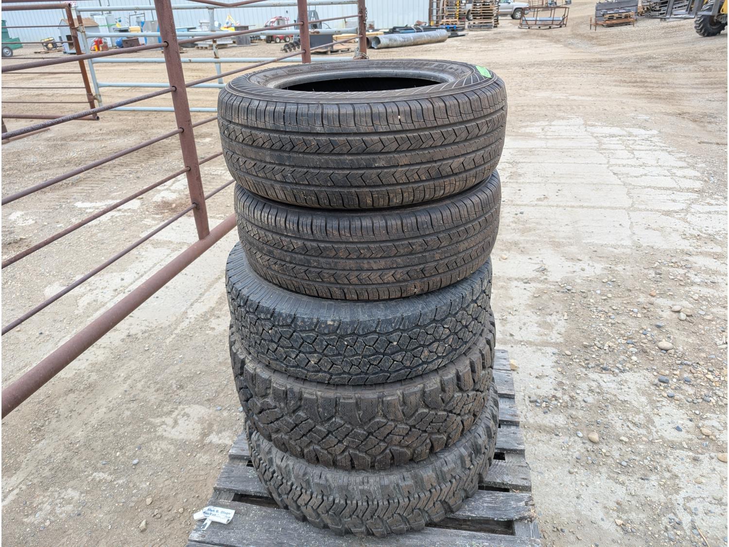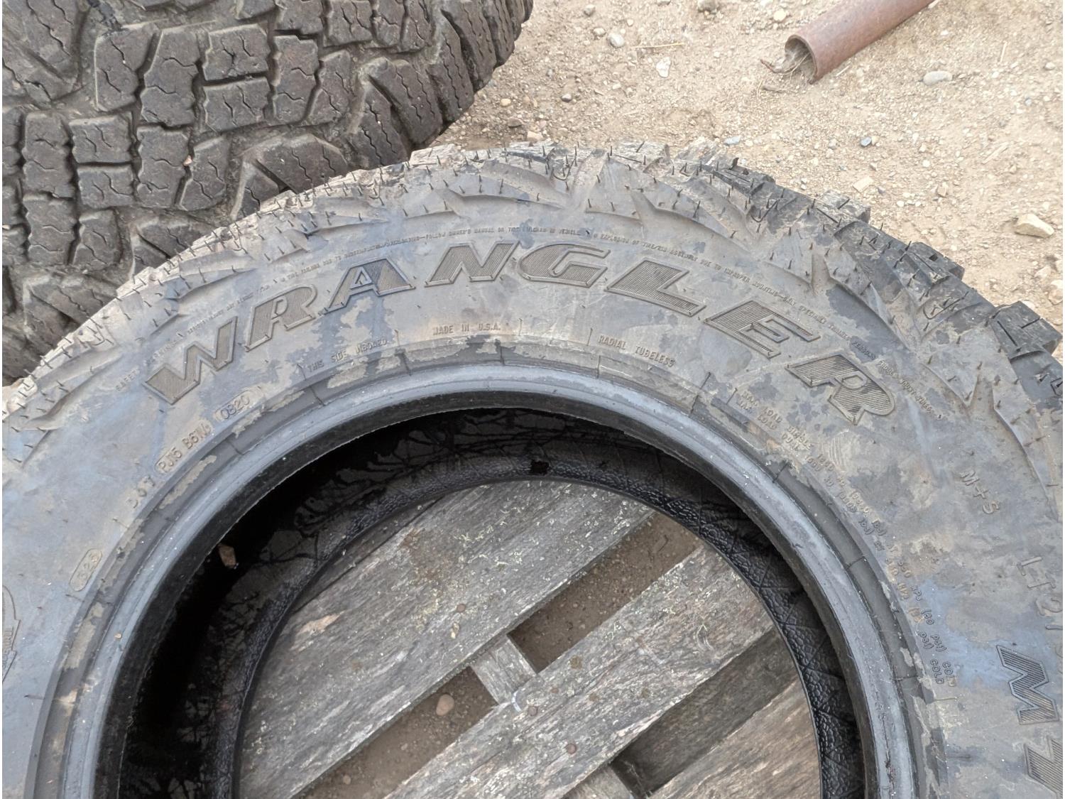 (1) Goodyear Wrangler Duratrac 285/65R18 tire, (1) Goodyear Wrangler 275/70R18 tire, (2) Farroad FRD66 235/65R17 tires, (1) BF Goodrich Rugged Trail 245/75R16 tire