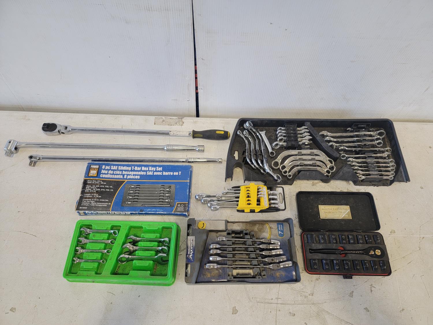Combination wrenches, flex head ratchet wrenches, sliding T-bar hex key set, breaker bars