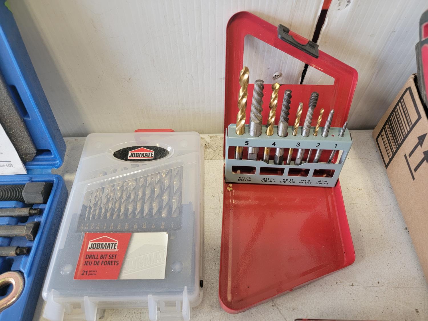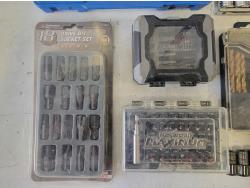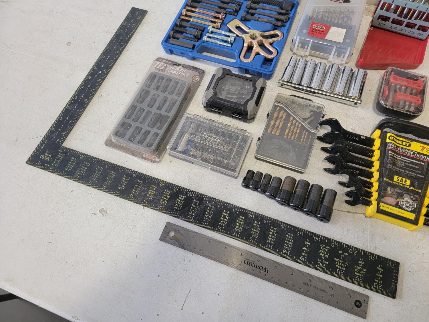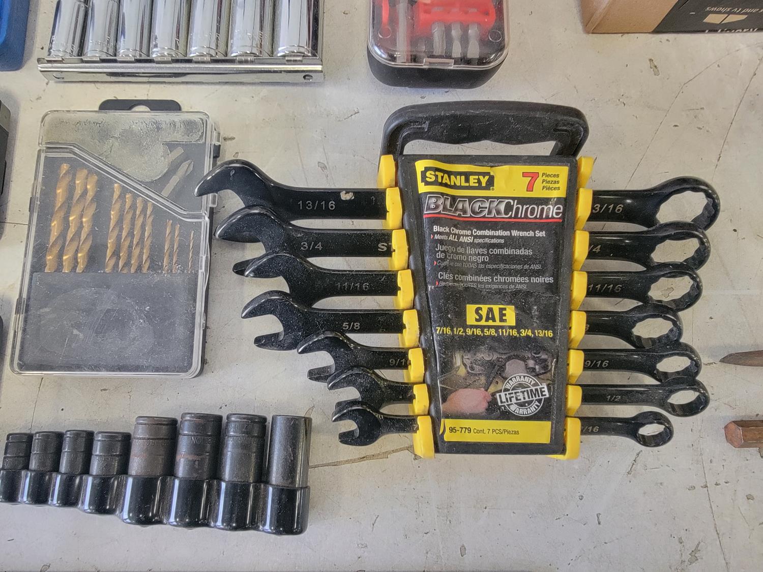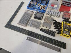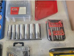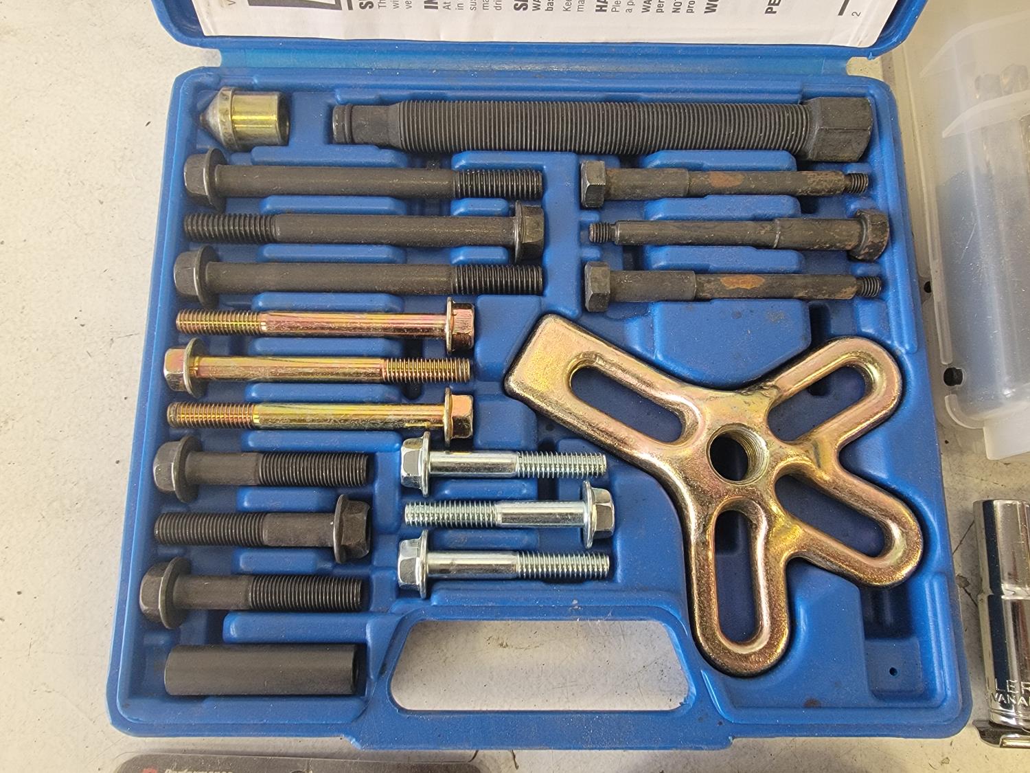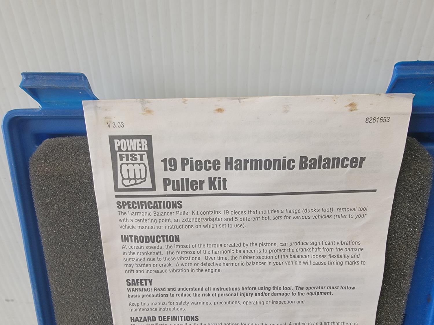 Powerfist harmonic balancer puller kit, drill bits, sockets, hex bits, combination wrenches, screwdrivers
