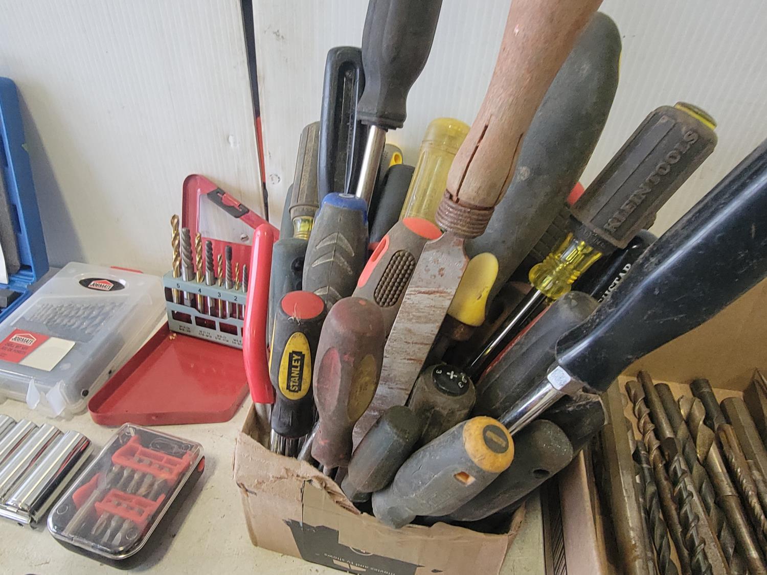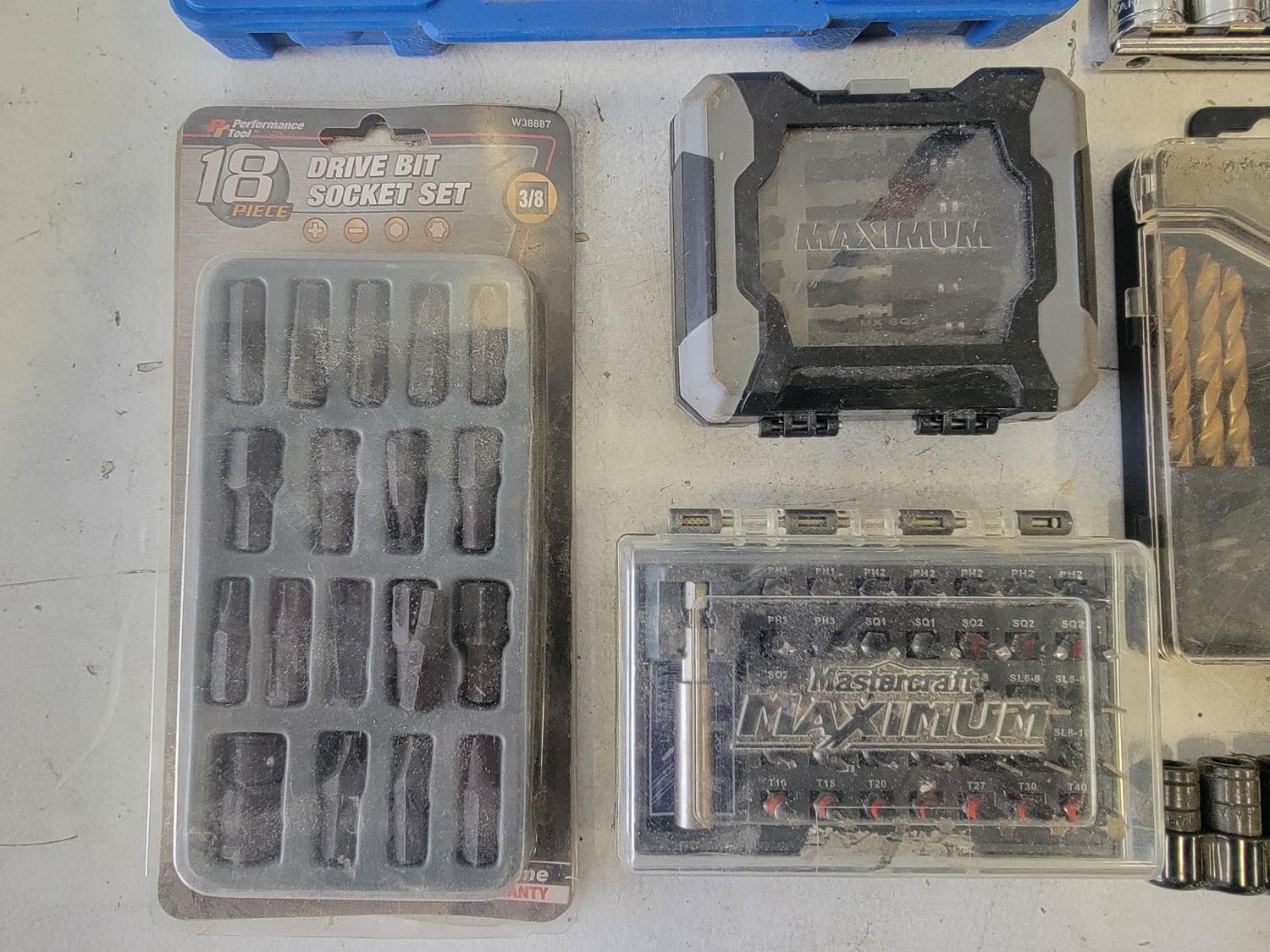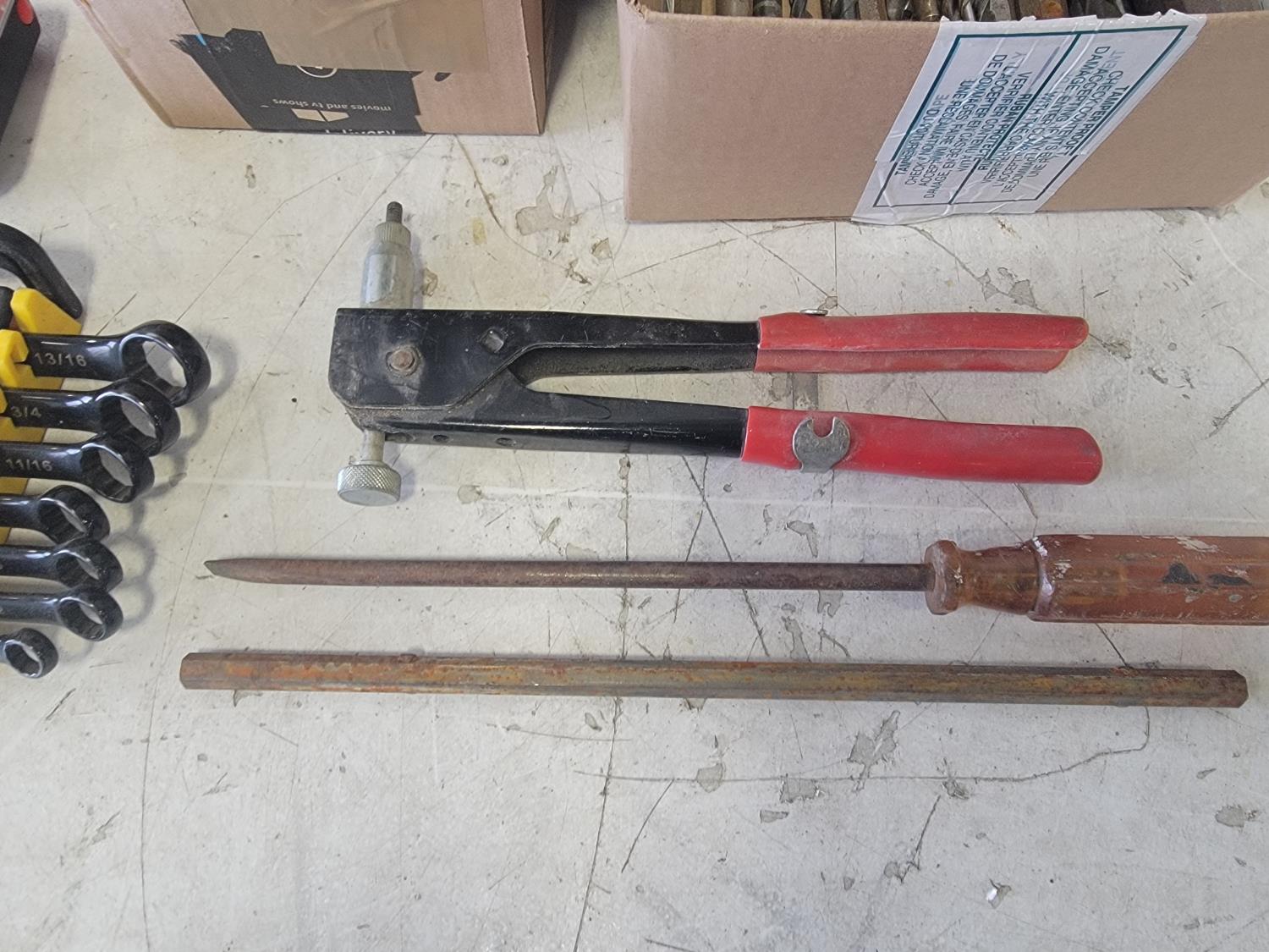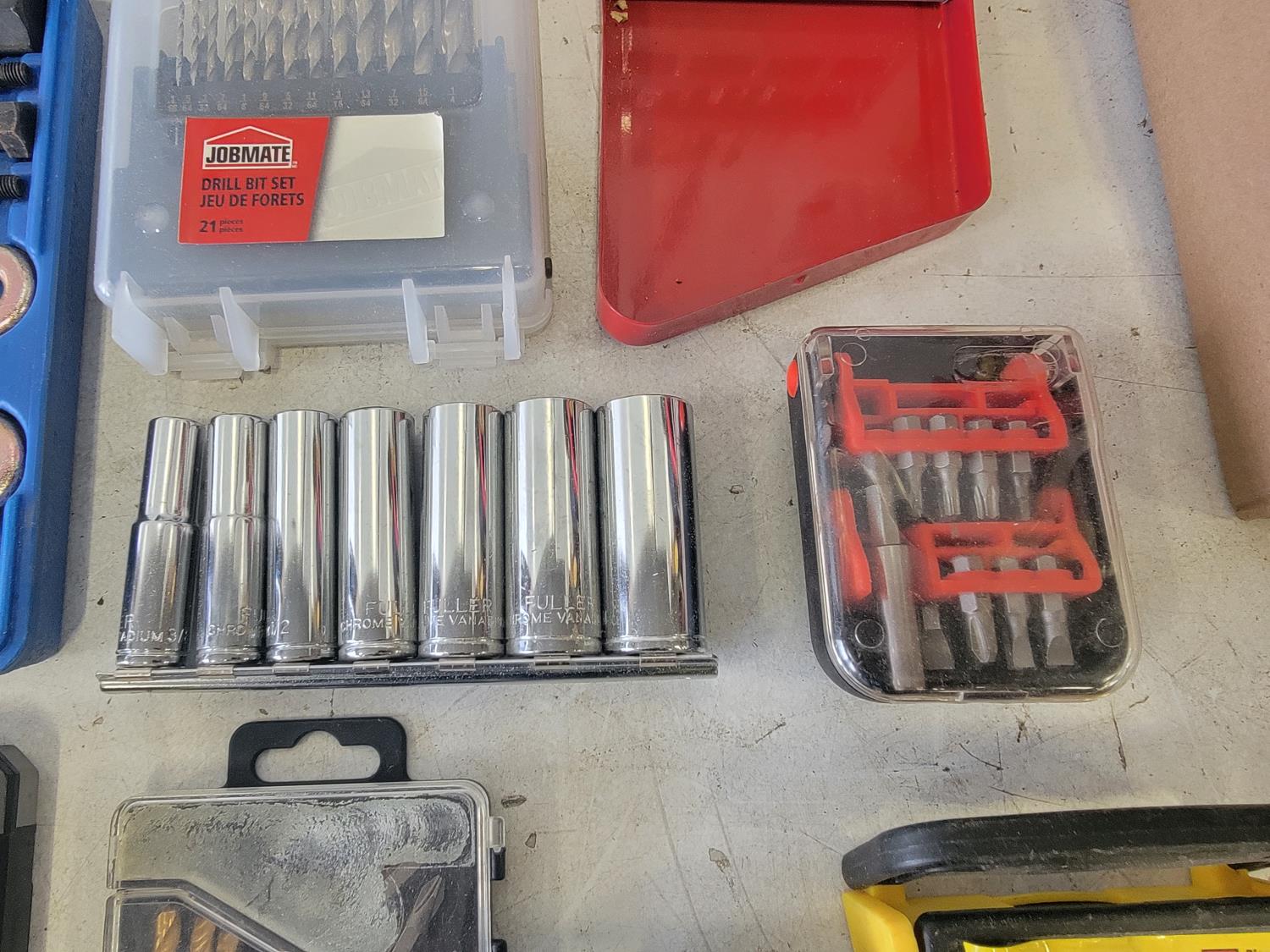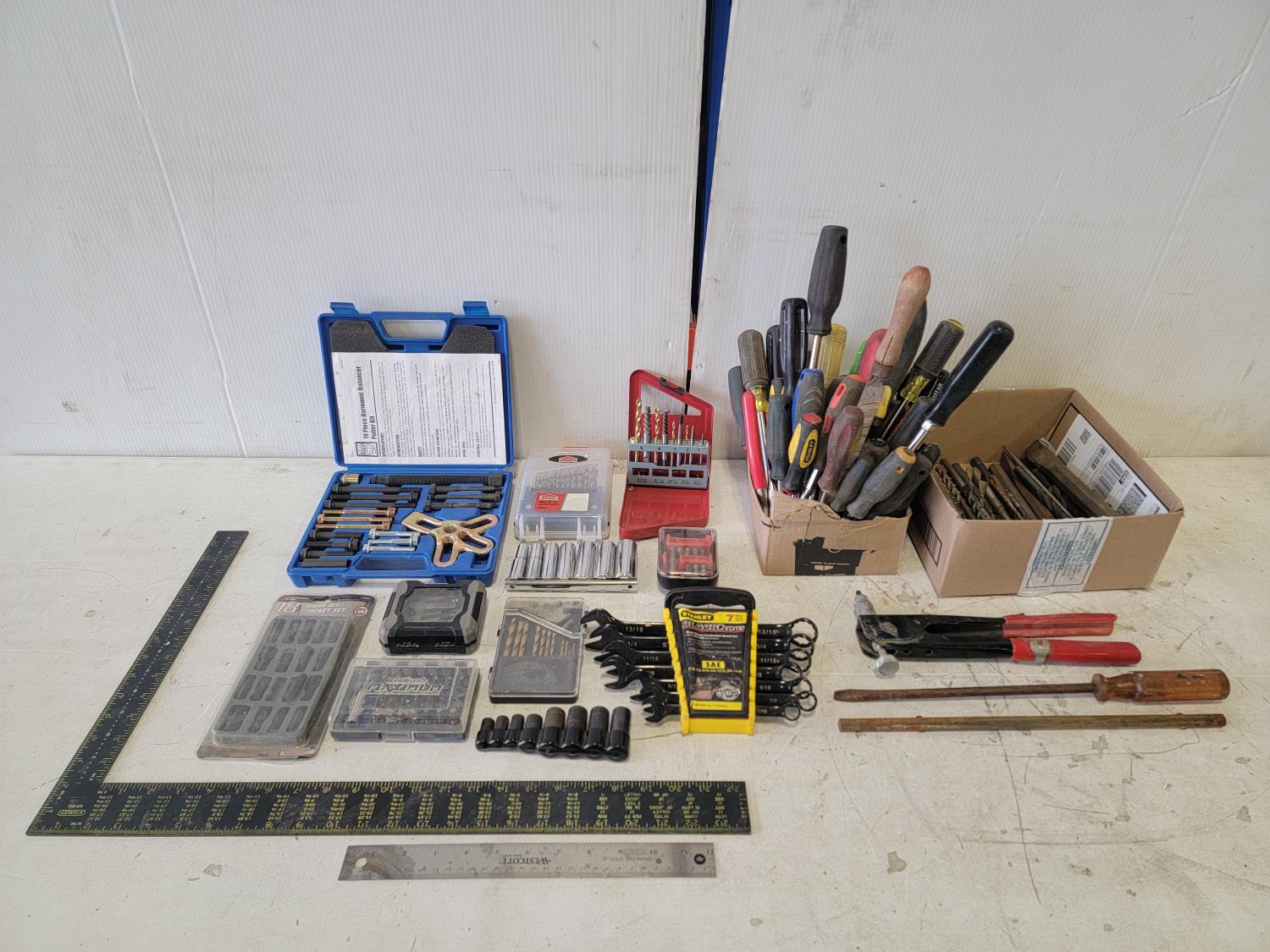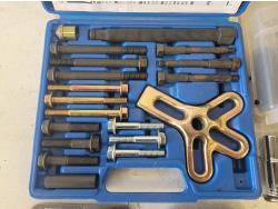 Powerfist harmonic balancer puller kit, drill bits, sockets, hex bits, combination wrenches, screwdrivers