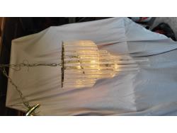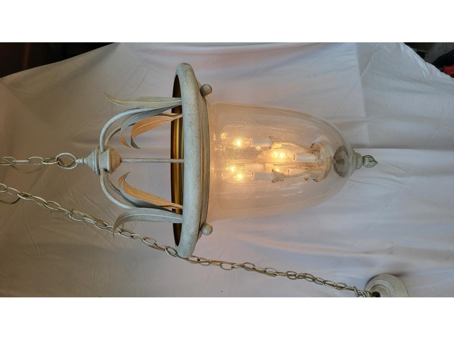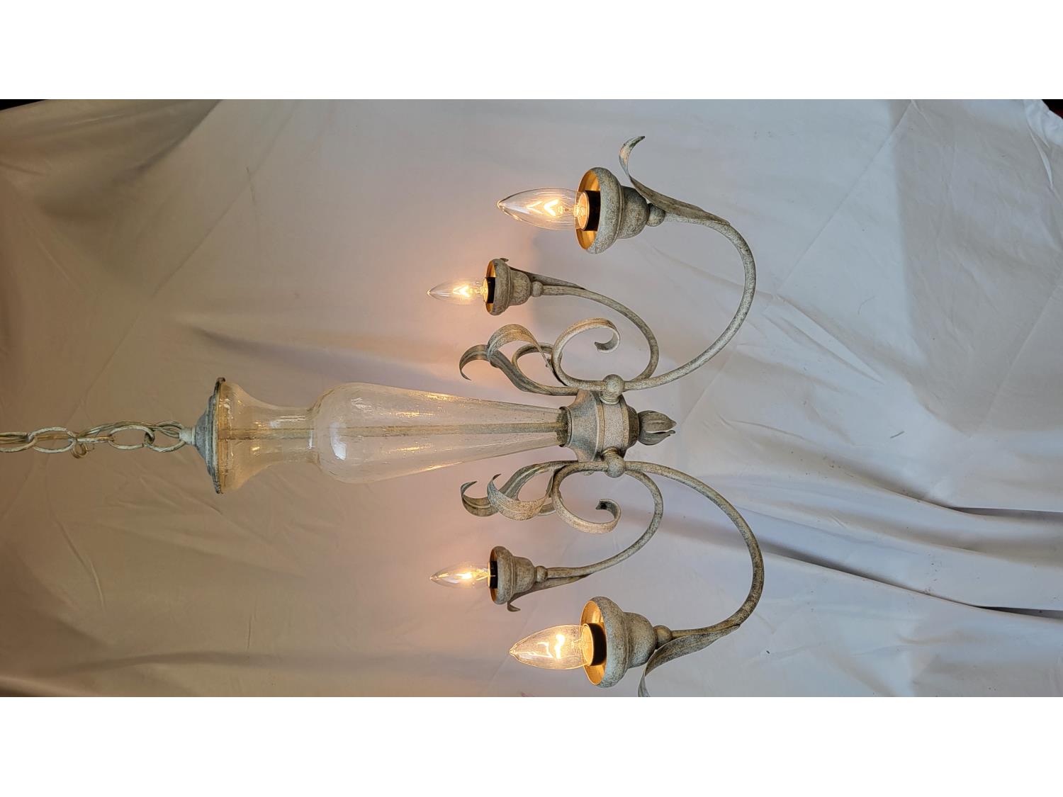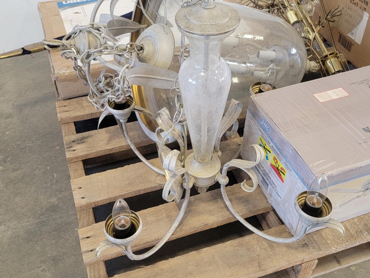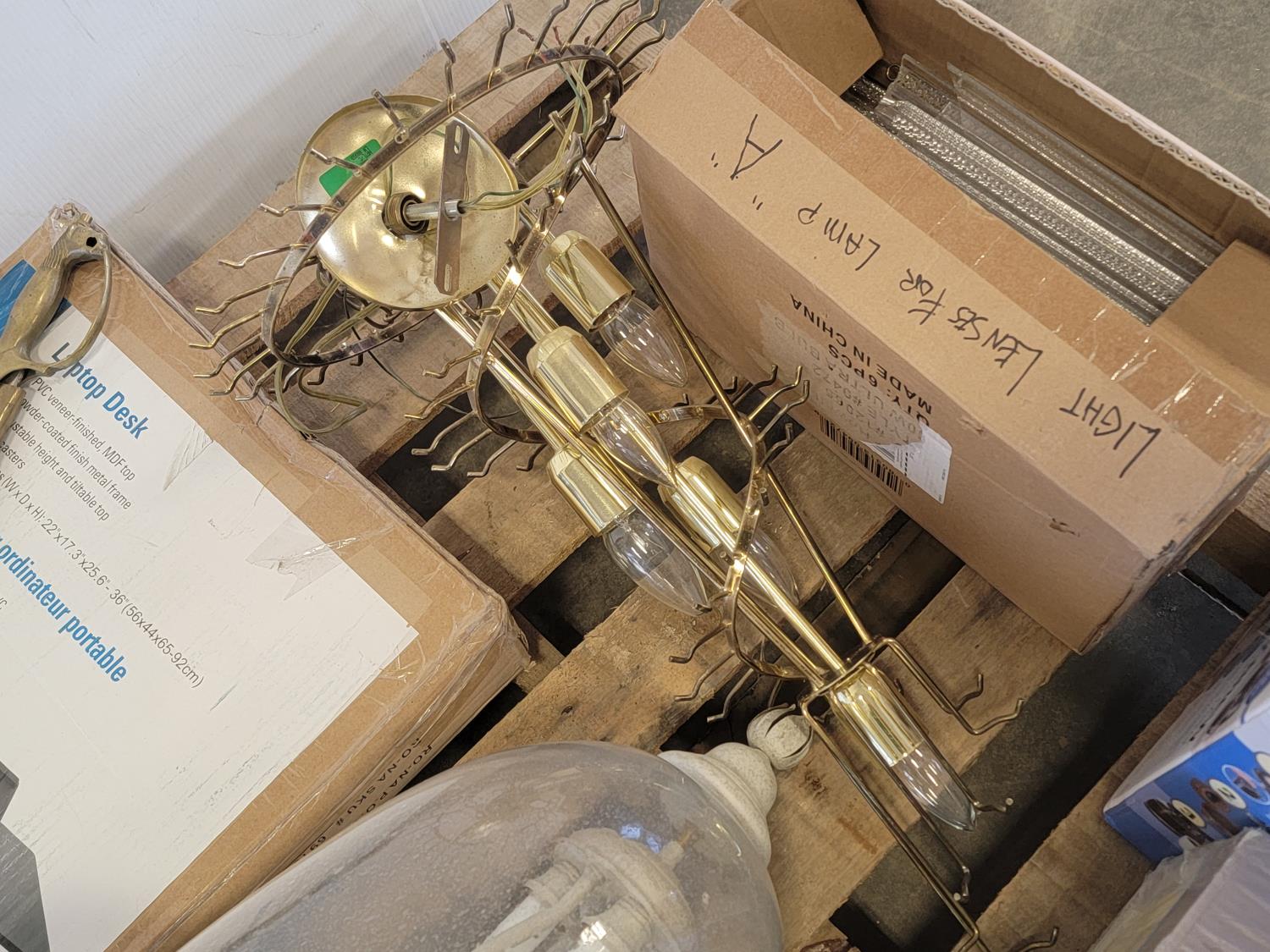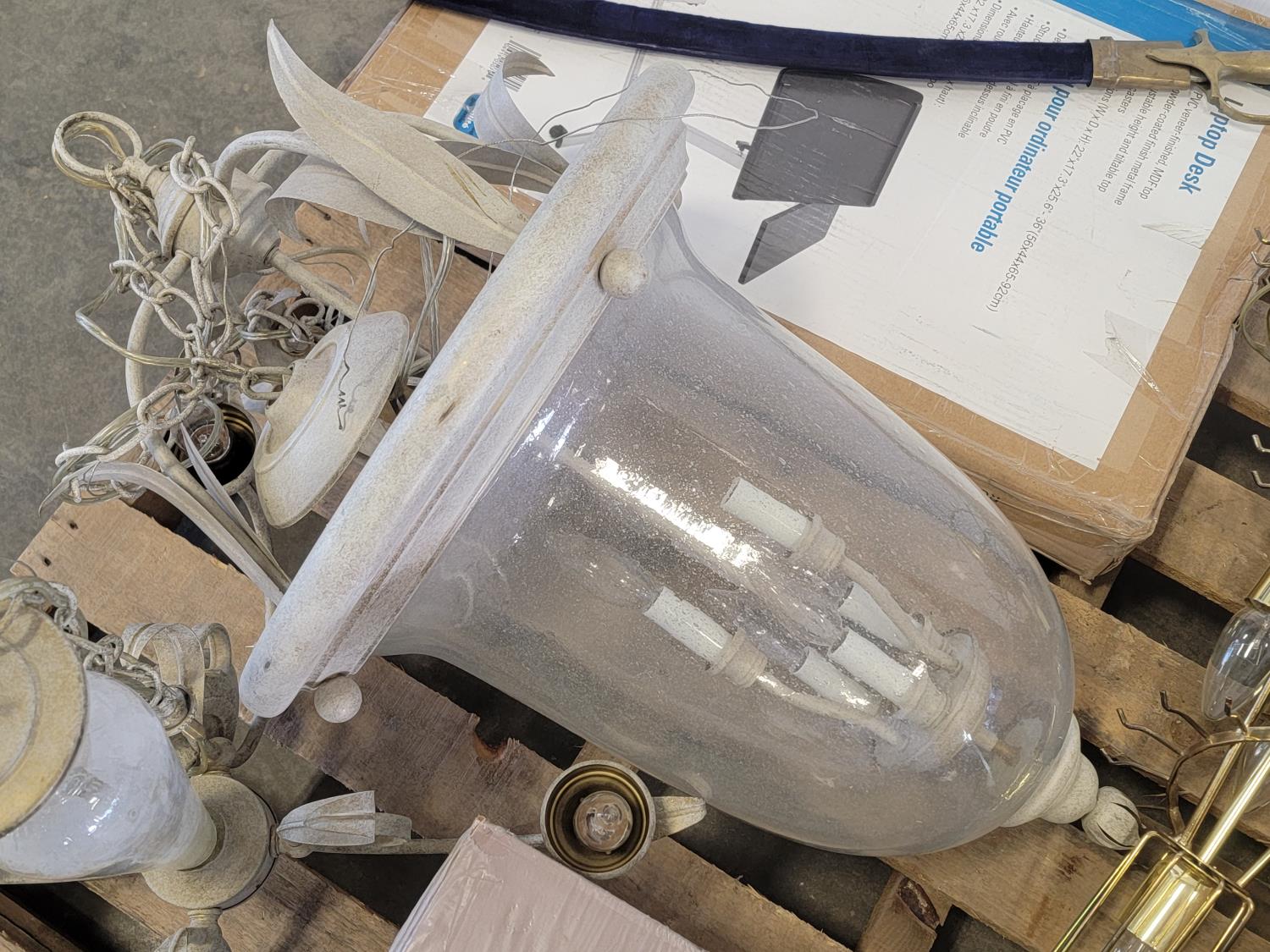 (2) glass globe hanging lamps, imitation glass chandelier hanging lamp, cascading imitation glass chandelier hanging lamp, adjustable laptop desk 22 inch w x 17 inch d x 25-36 inch h (unused), 42 inch ceiling fan (unused), decorative sword
