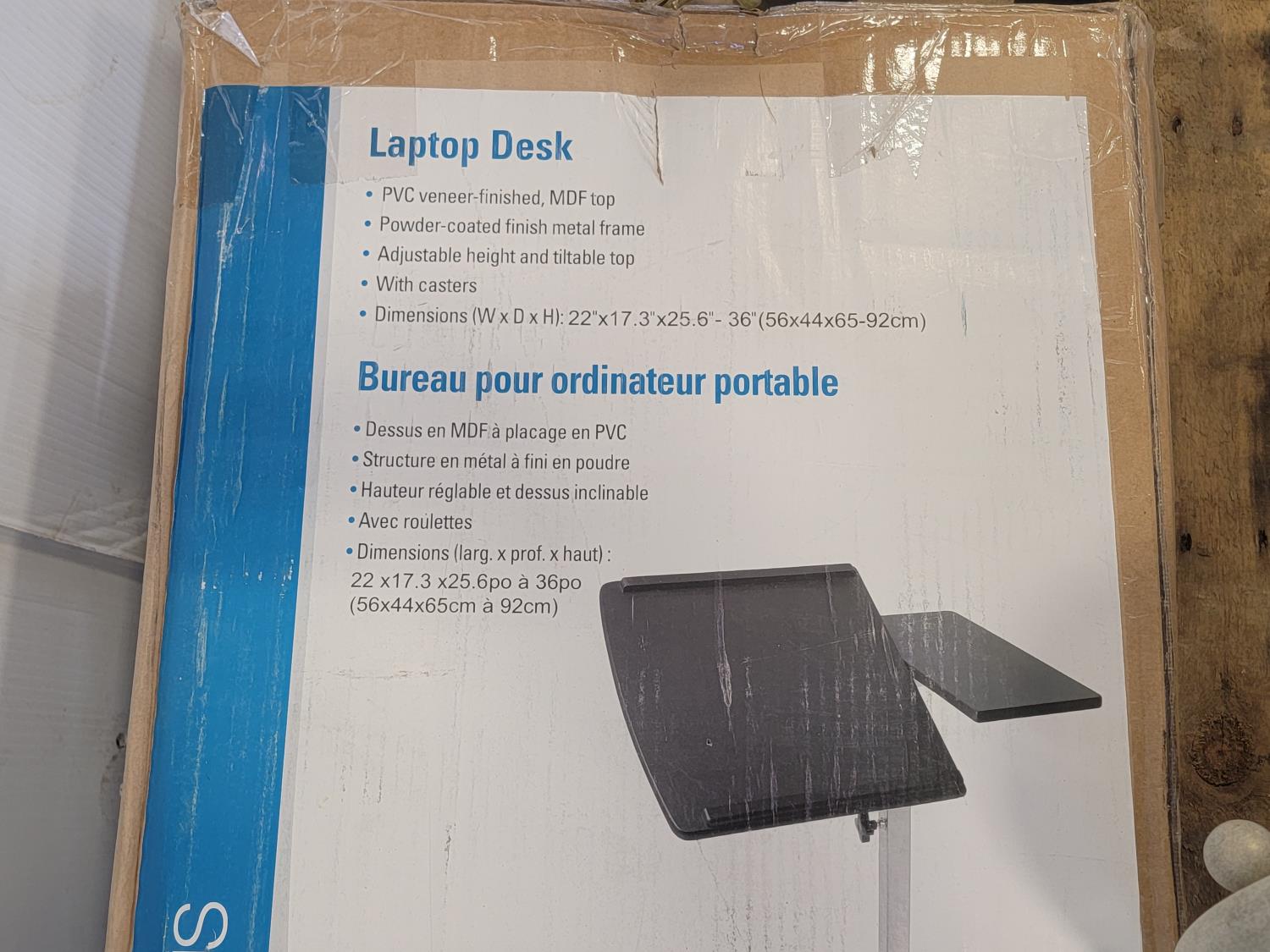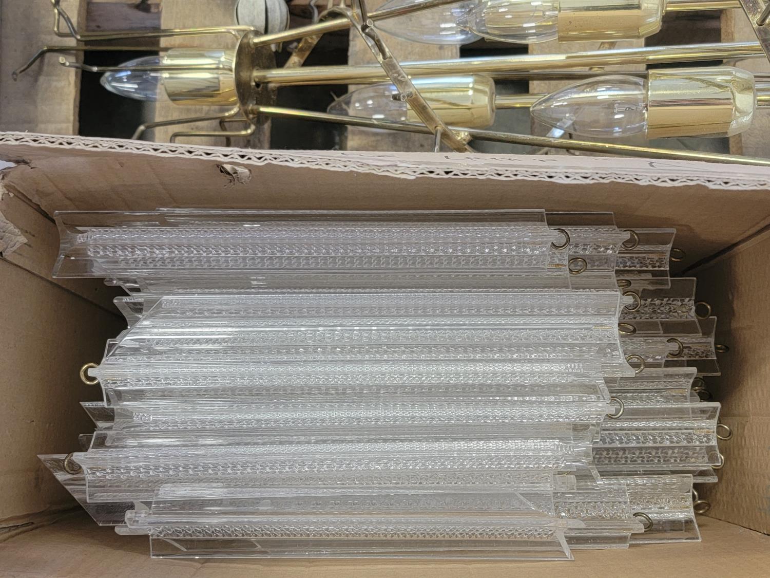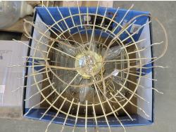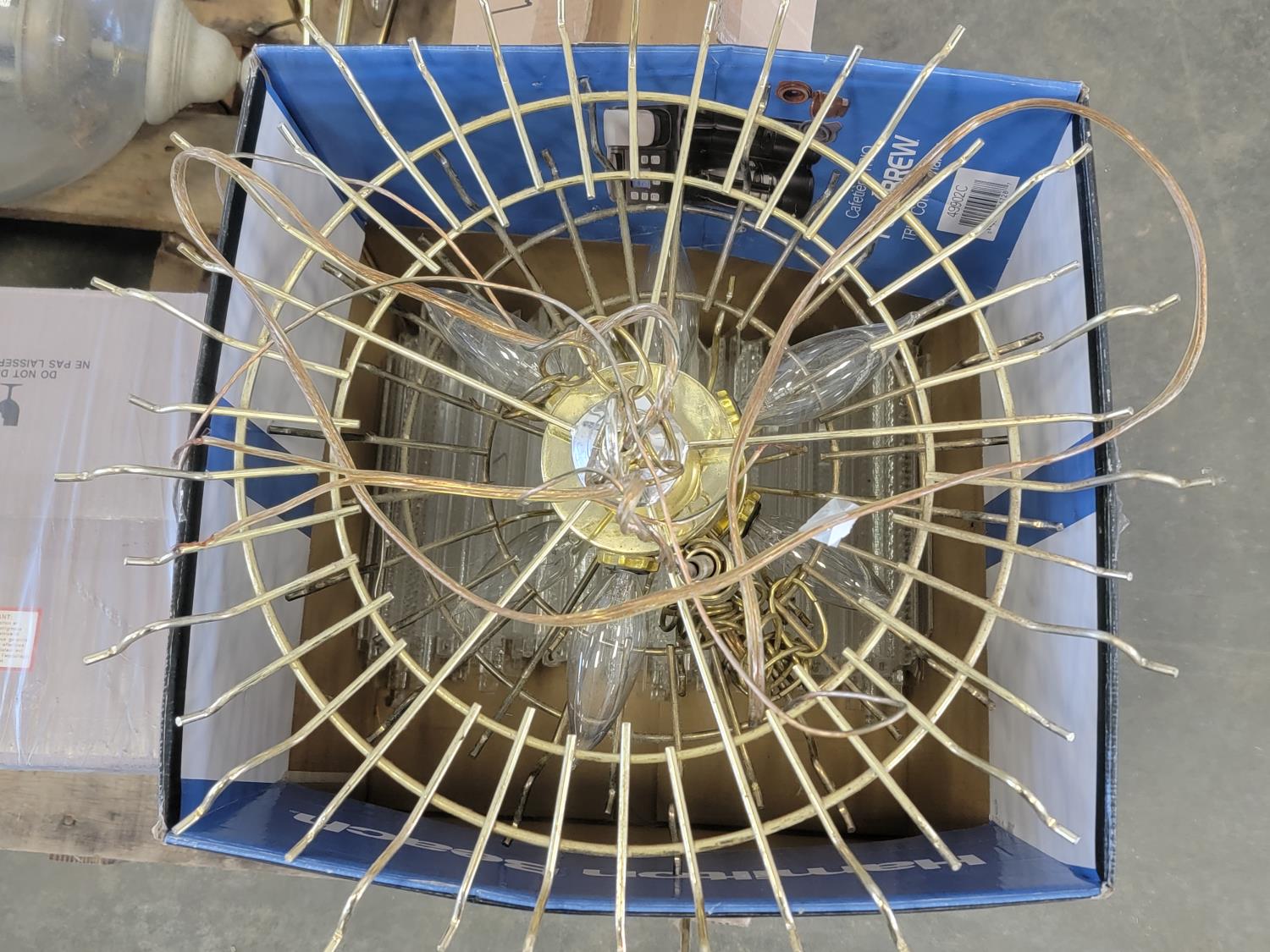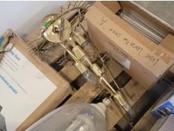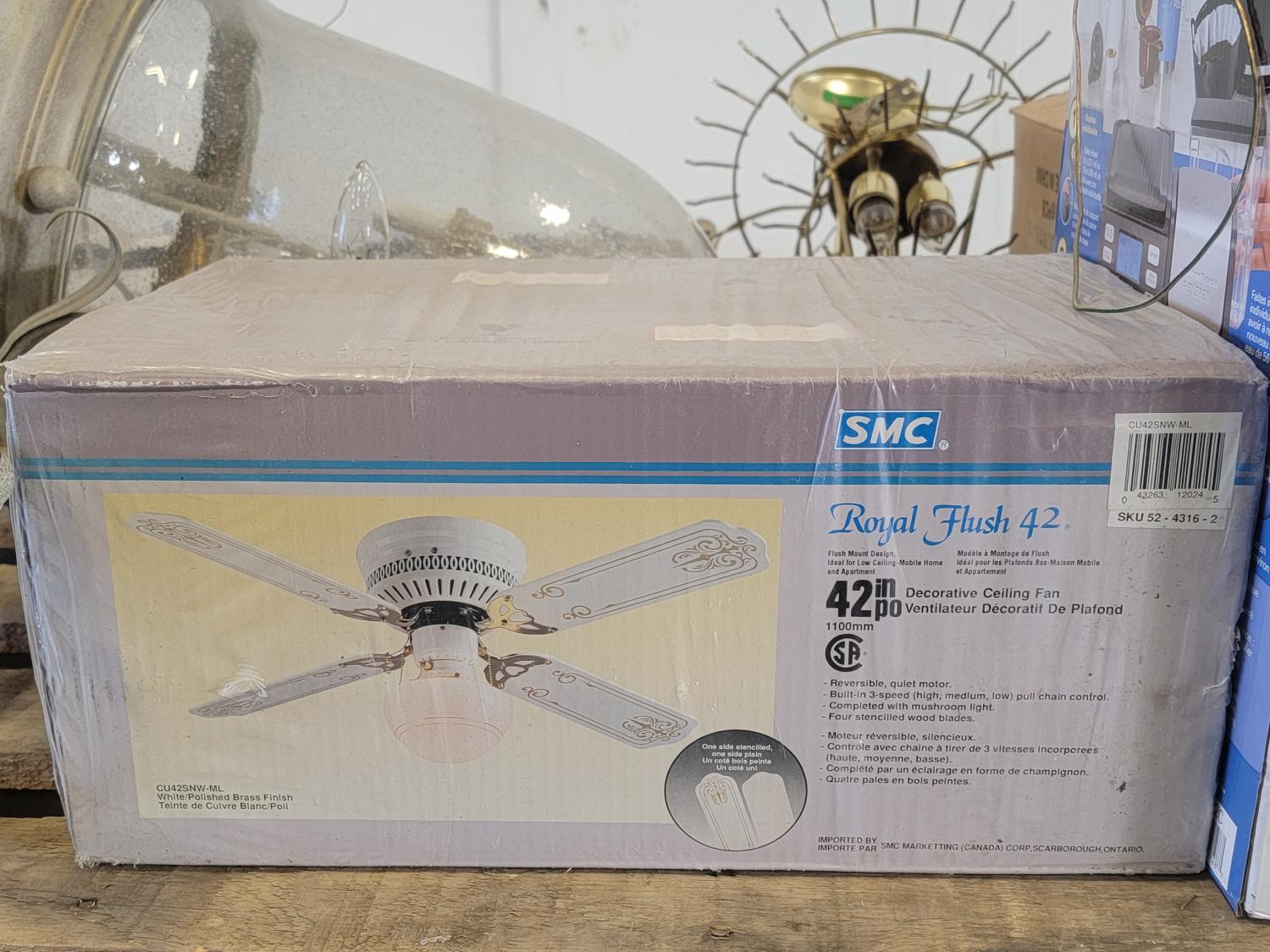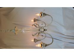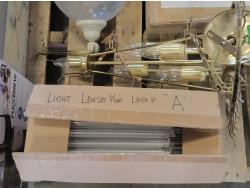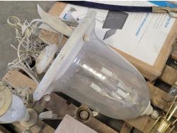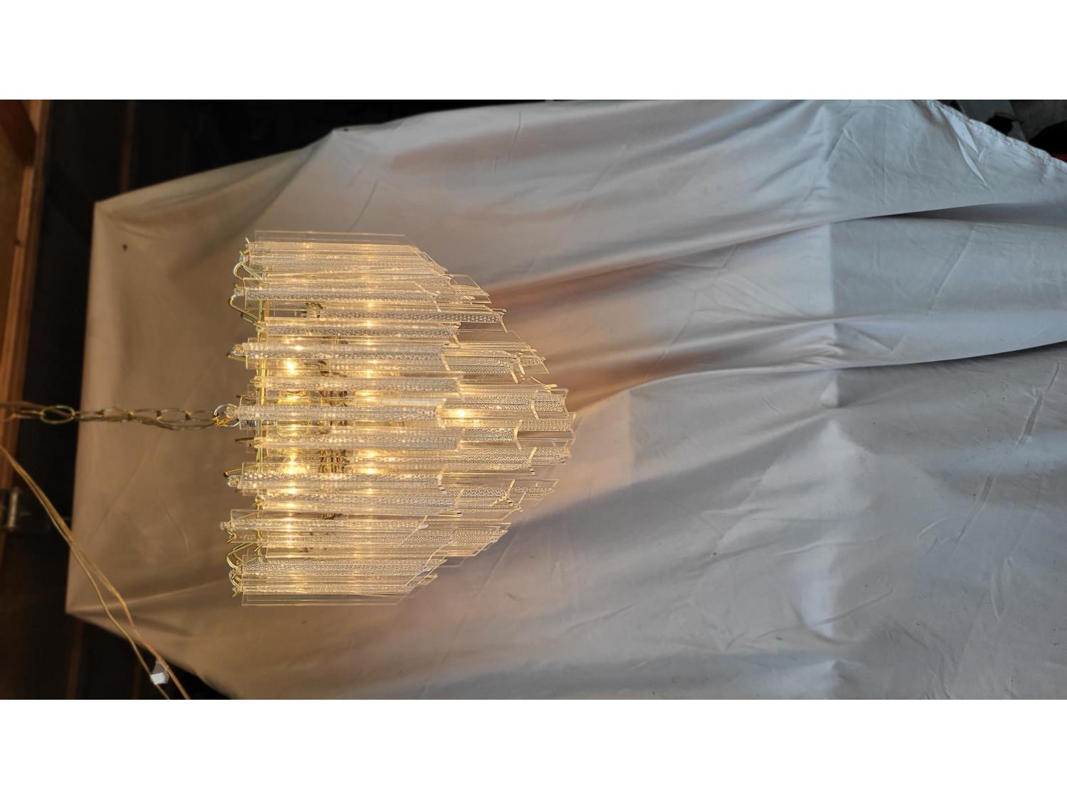(2) glass globe hanging lamps, imitation glass chandelier hanging lamp, cascading imitation glass chandelier hanging lamp, adjustable laptop desk 22 inch w x 17 inch d x 25-36 inch h (unused), 42 inch ceiling fan (unused), decorative sword
