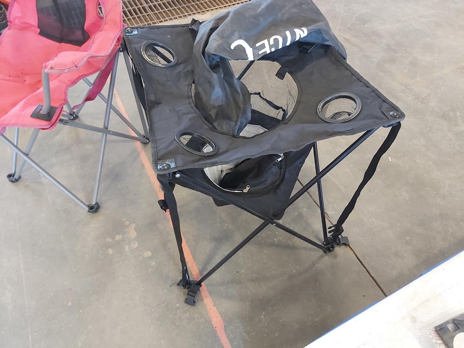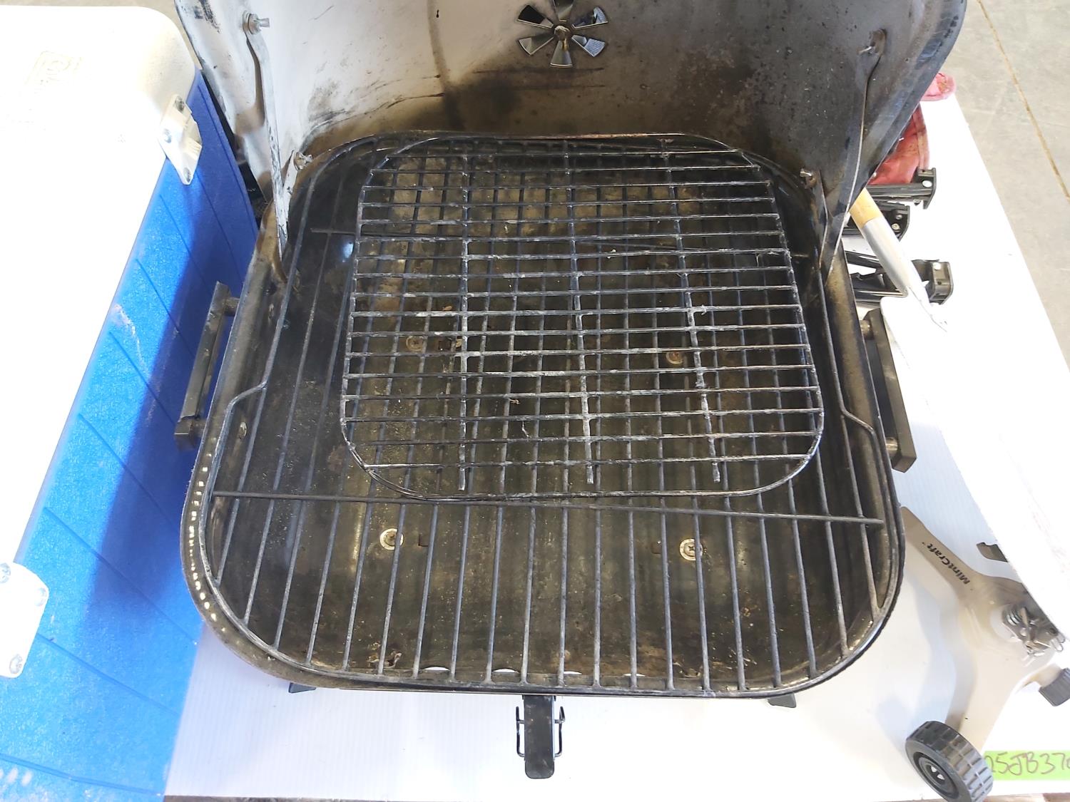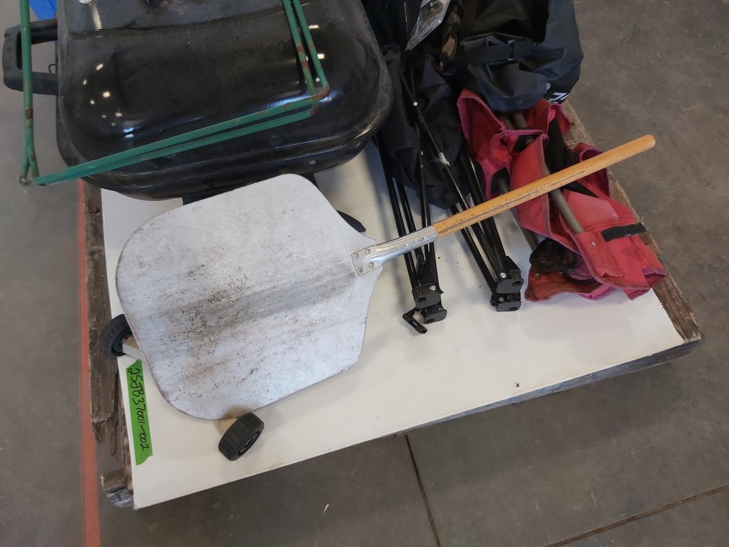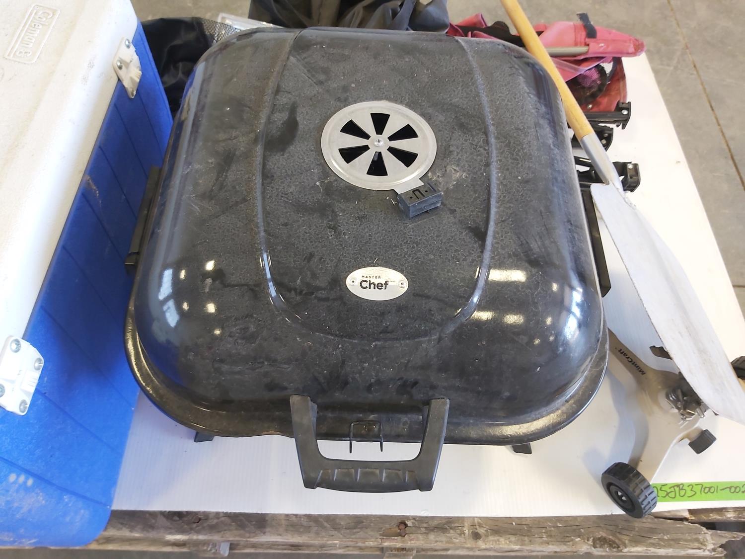 Coleman cooler, Master Chef tabletop BBQ, lawn sprinkler, camping folding chair and table, pizza paddle, (2) cell phone holders