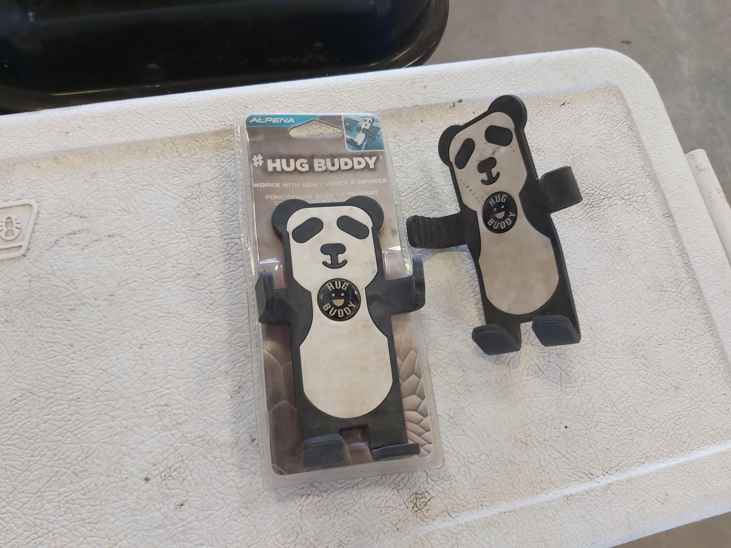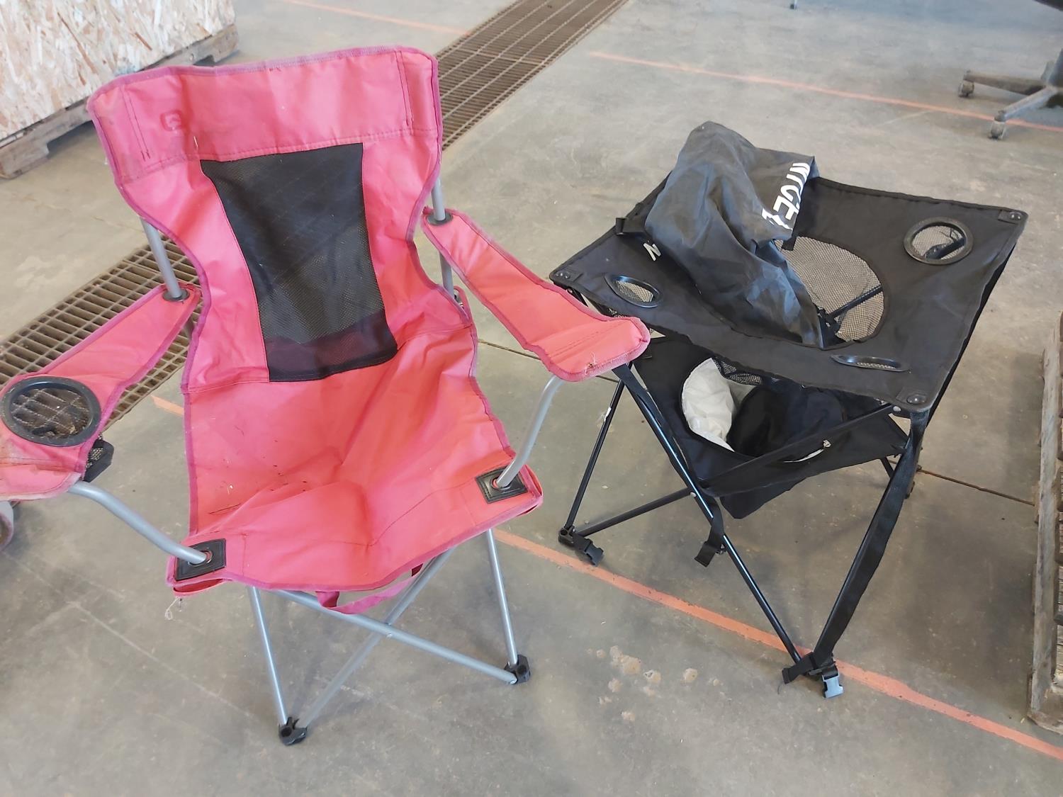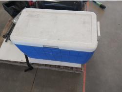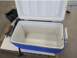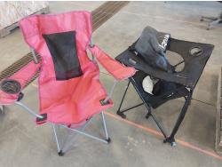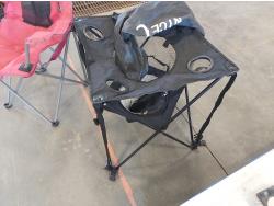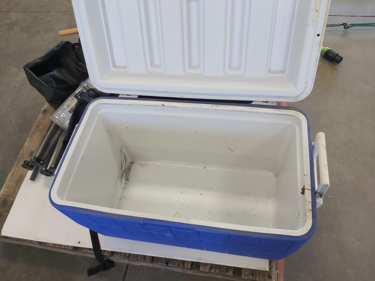 Coleman cooler, Master Chef tabletop BBQ, lawn sprinkler, camping folding chair and table, pizza paddle, (2) cell phone holders