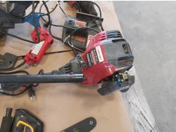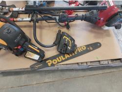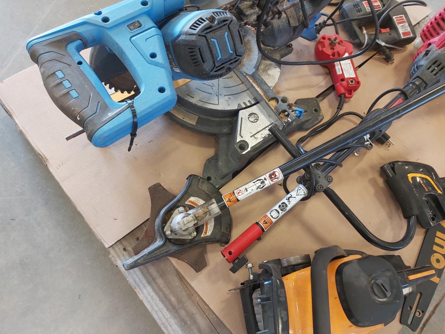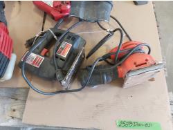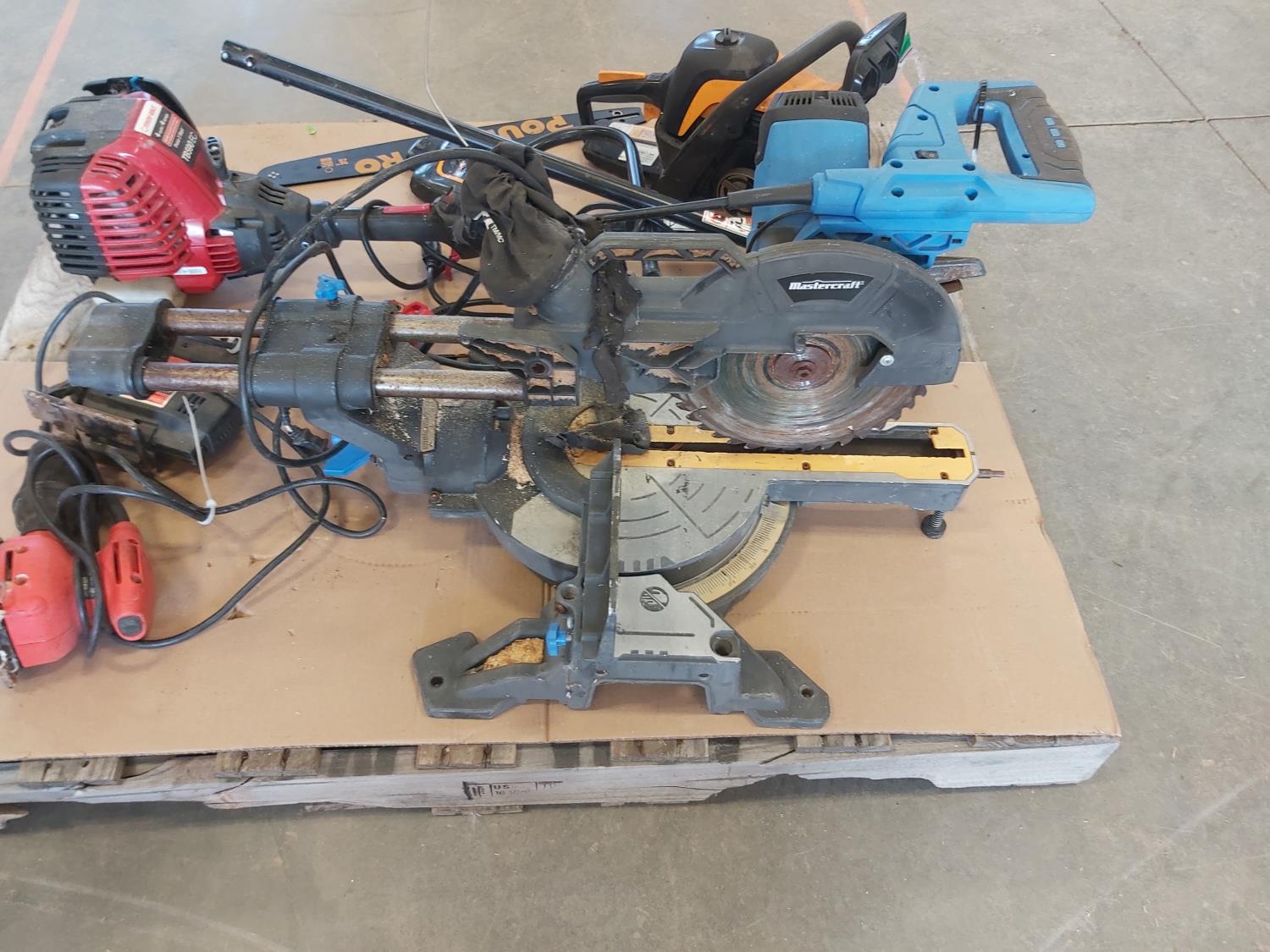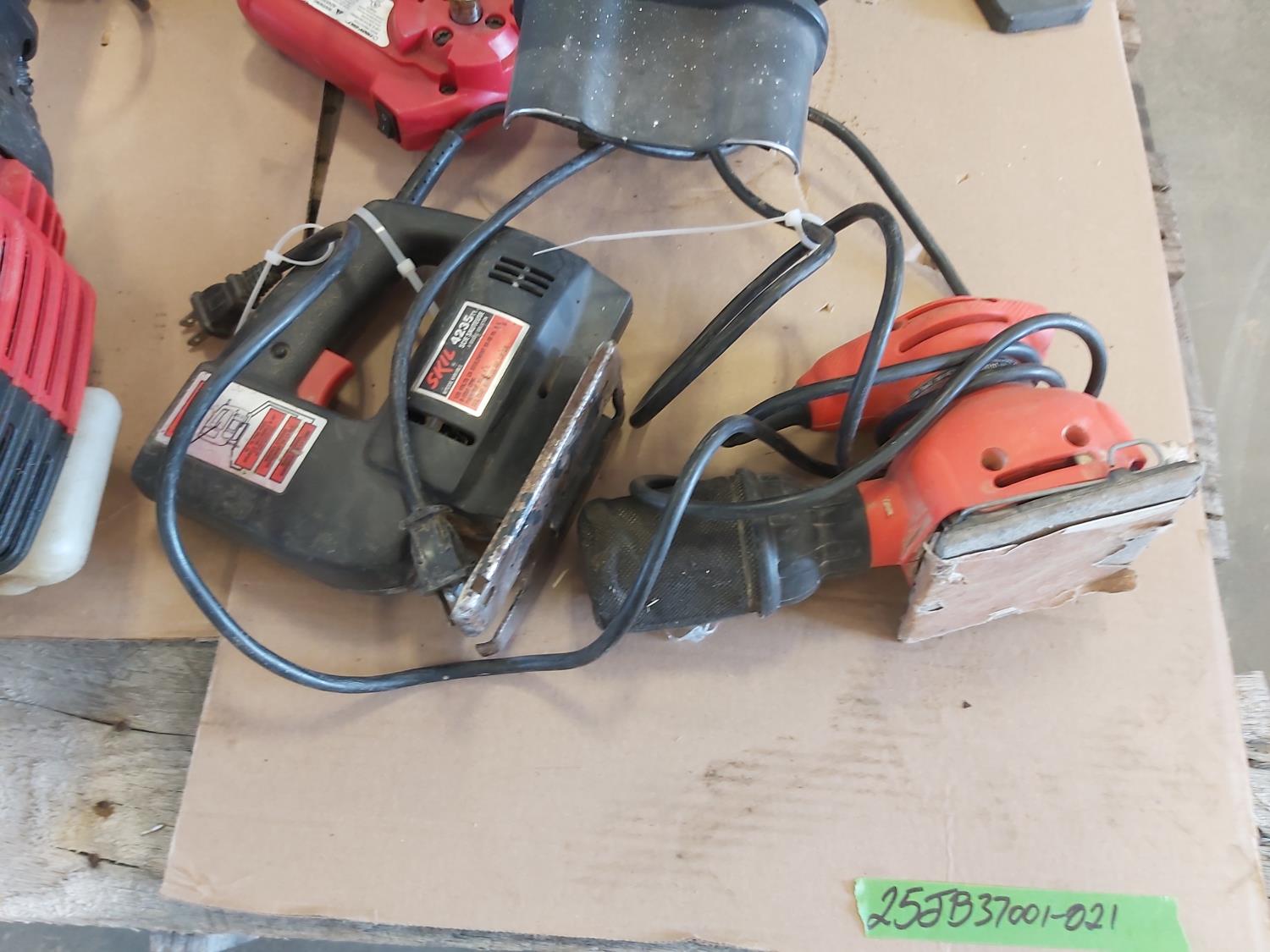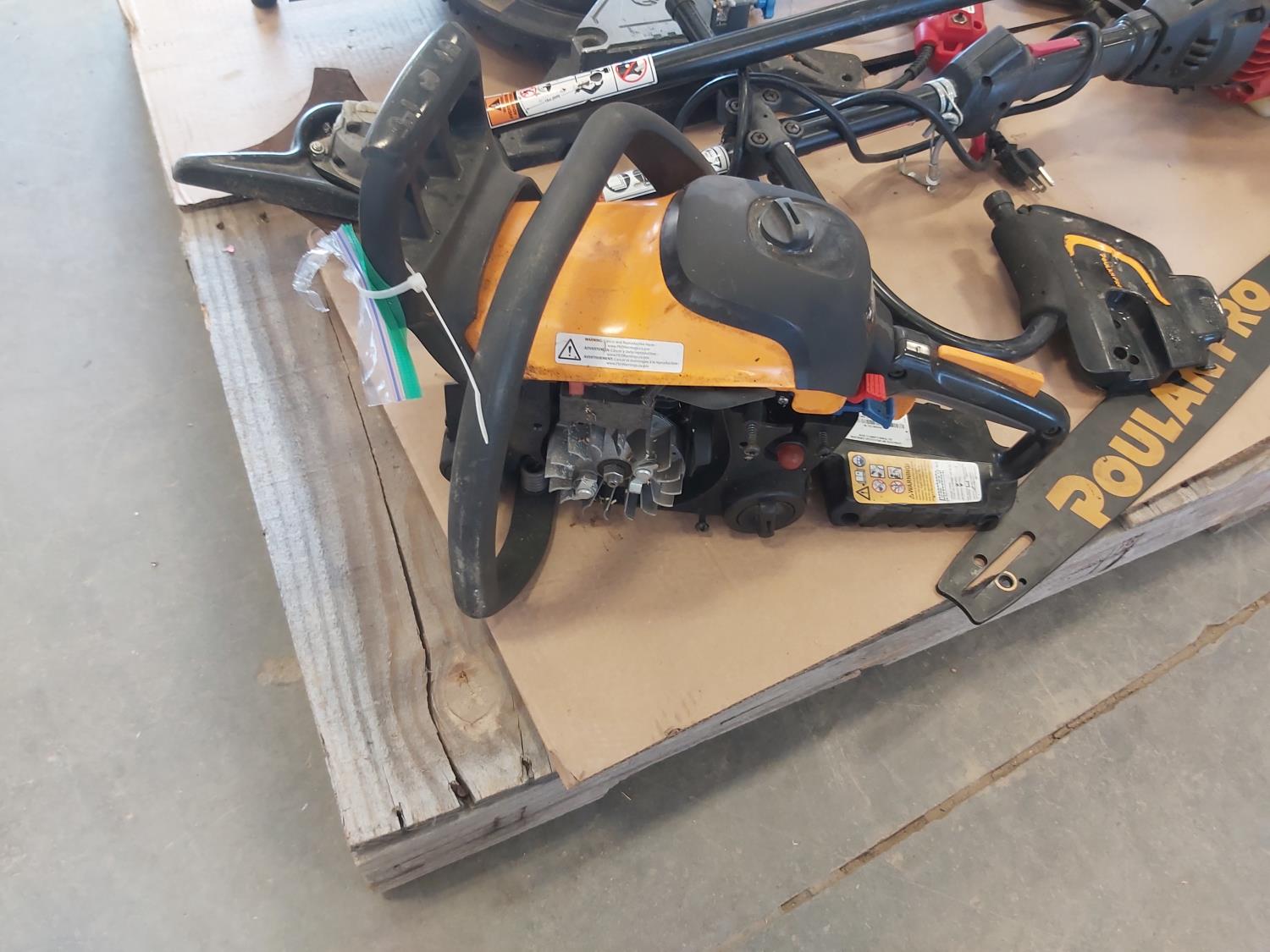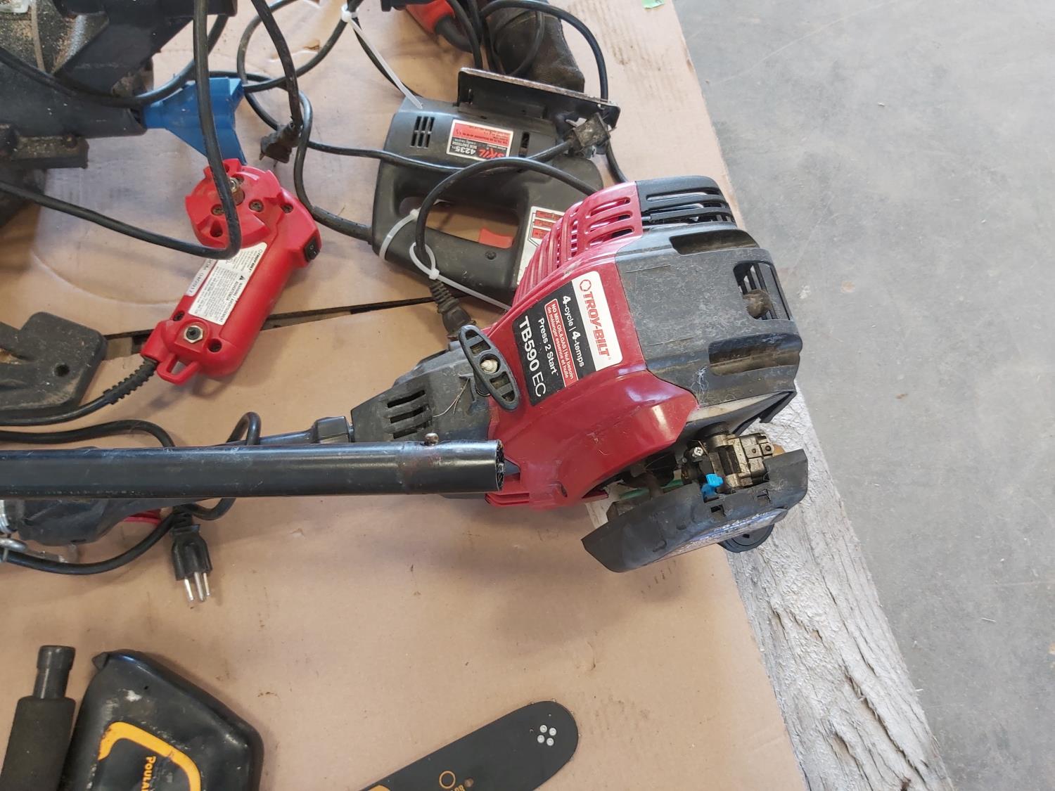 Poulan chainsaw (missing parts), Troy Bilt trimmer, Mastercraft saw, sander, jigsaw