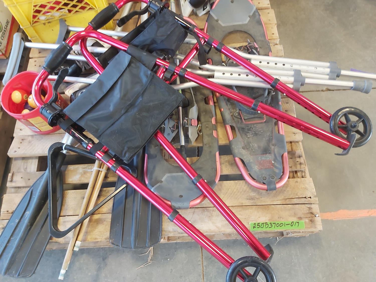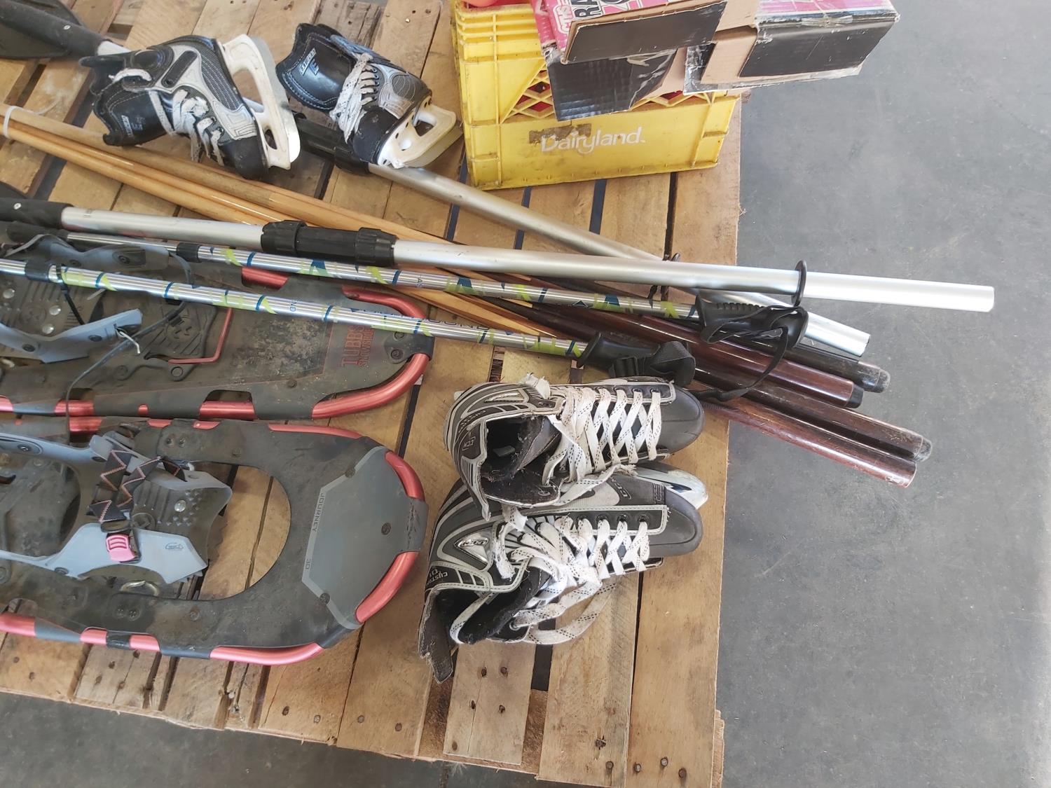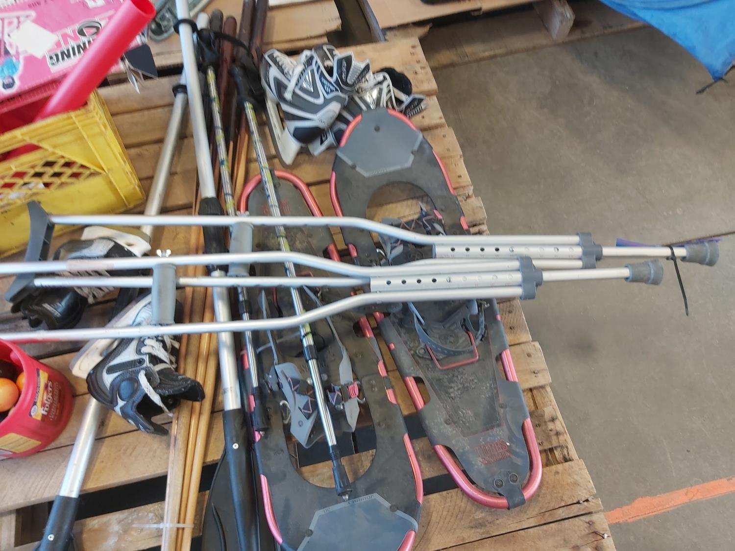 Snowshoes, paddles, (4) pool cues, (2) pairs of skates, skating aid, crutches, walker frame, pool balls