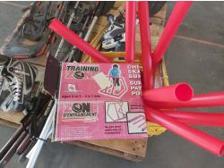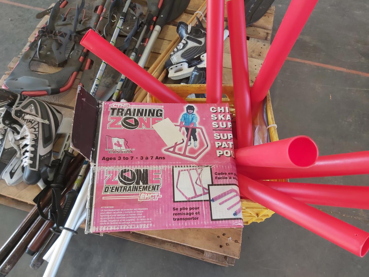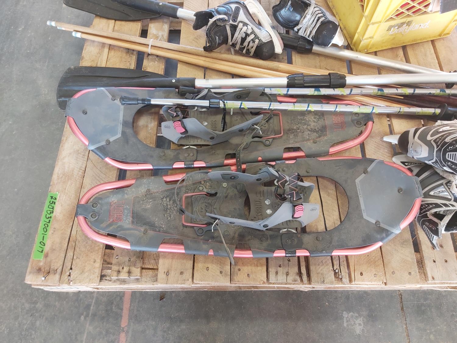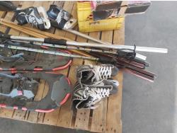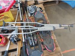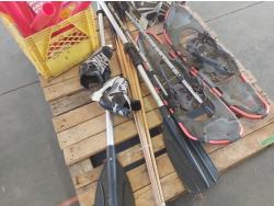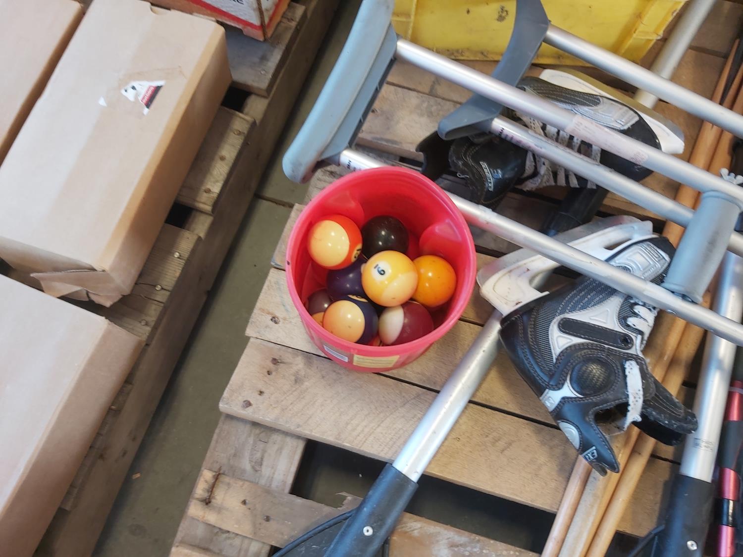 Snowshoes, paddles, (4) pool cues, (2) pairs of skates, skating aid, crutches, walker frame, pool balls