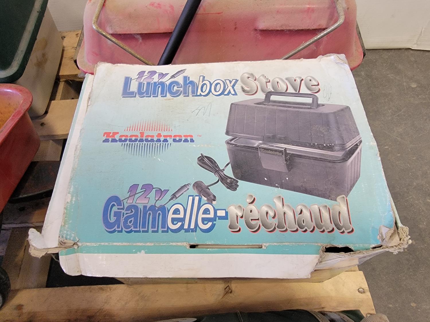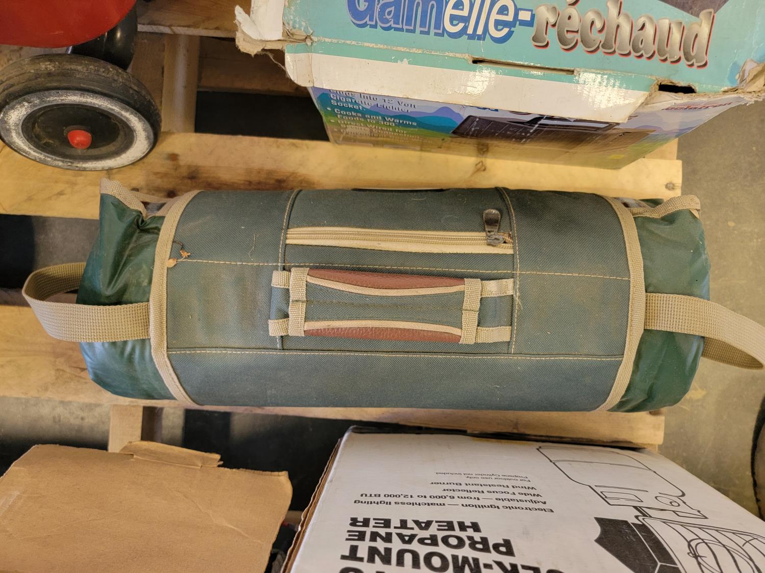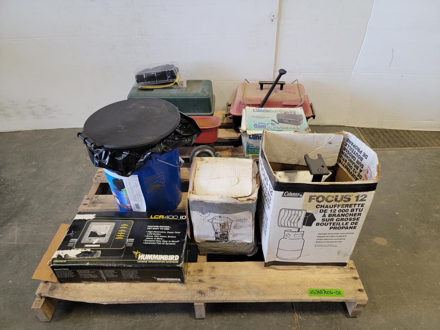 Humminbird fish finder, 12,000 BTU propane heater, propane lantern, Radio Flyer wagon, 12V lunch box stove, portable propane BBQ, tackle box