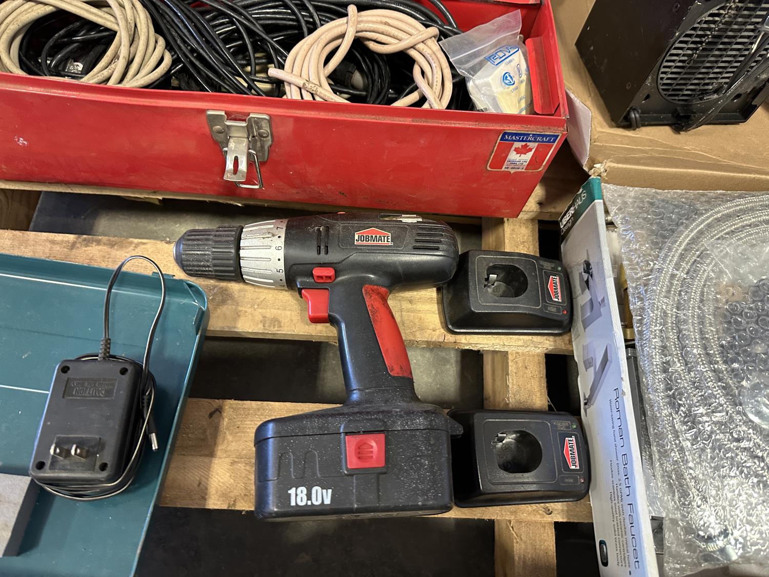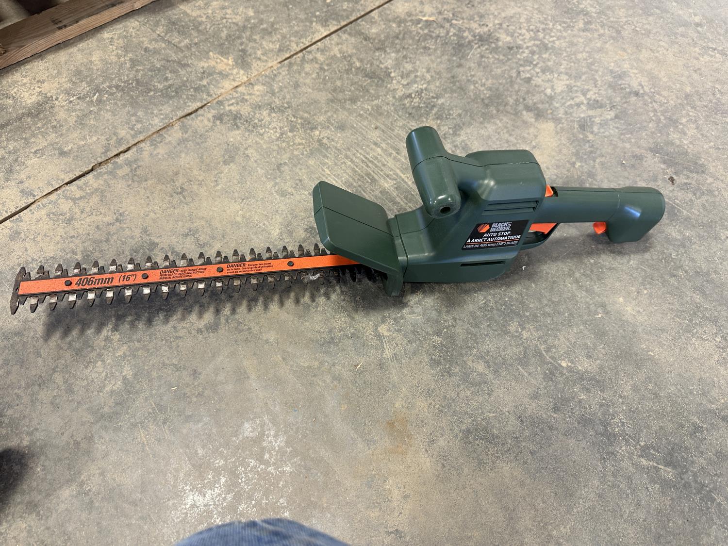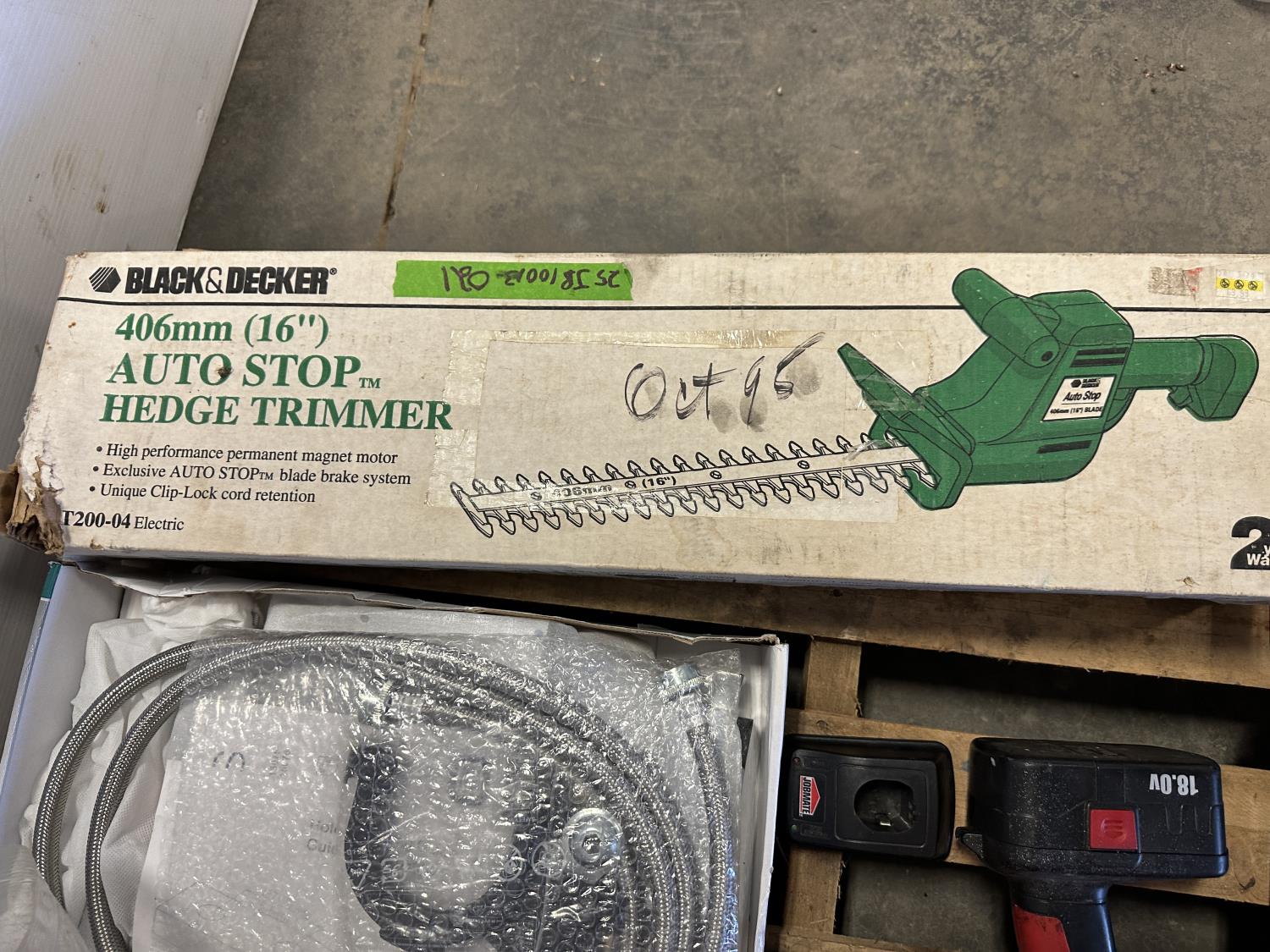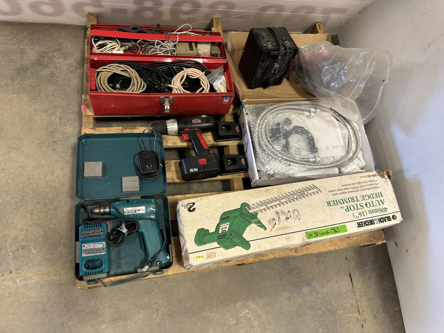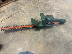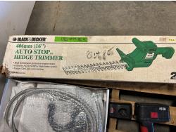 16 inch Black & Decker hedge trimmer, Roman Bath faucet (unused), respirator, mini heater, electrical cables, drills
