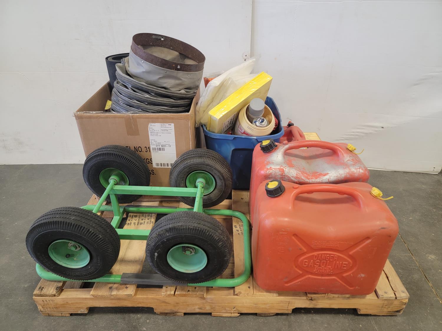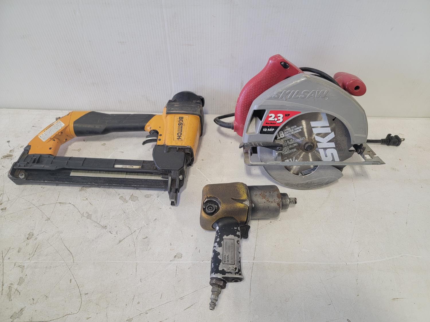 Jerry cans, gasket cutters, rubber matting, Bostitch nailer, 1/2 inch drive impact wrench, Skilsaw 7-/4 inch circular saw