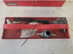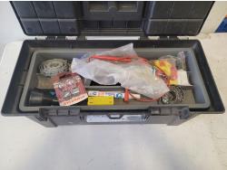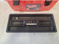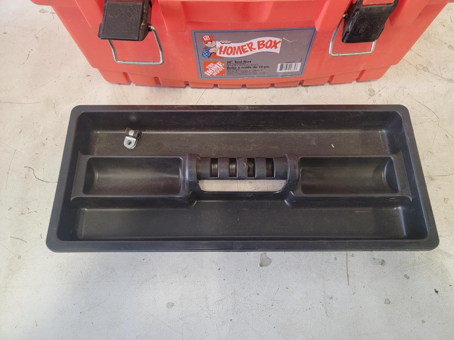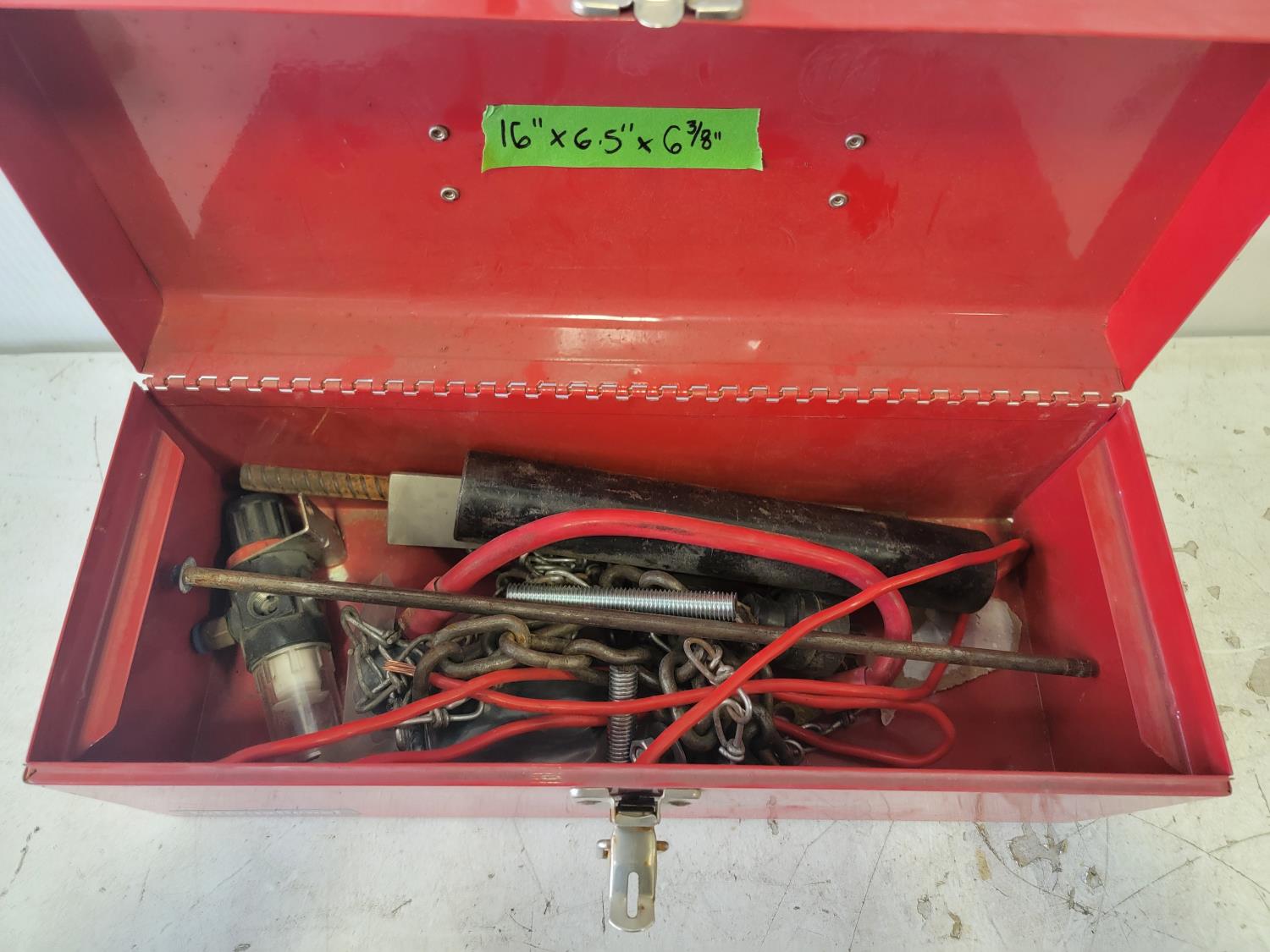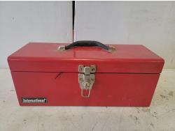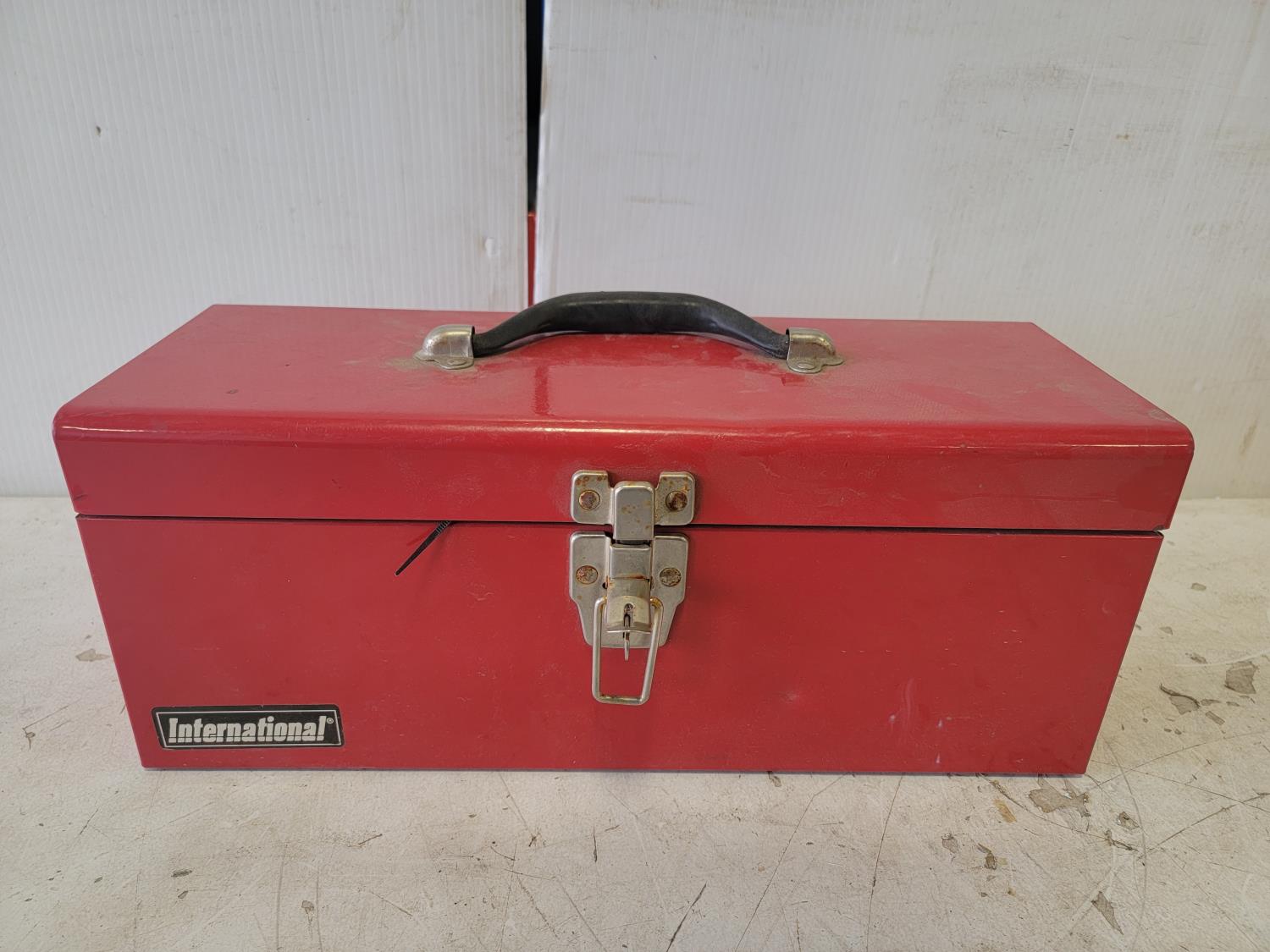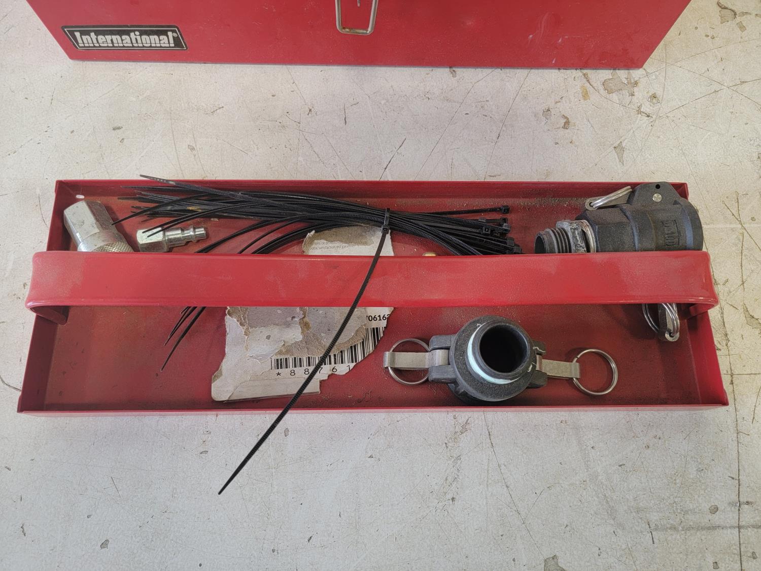 20 inch tool box with contents, folding chair, 19 inch tool box, International tool box, dust pan, hand tools, welding curtain, knee pads