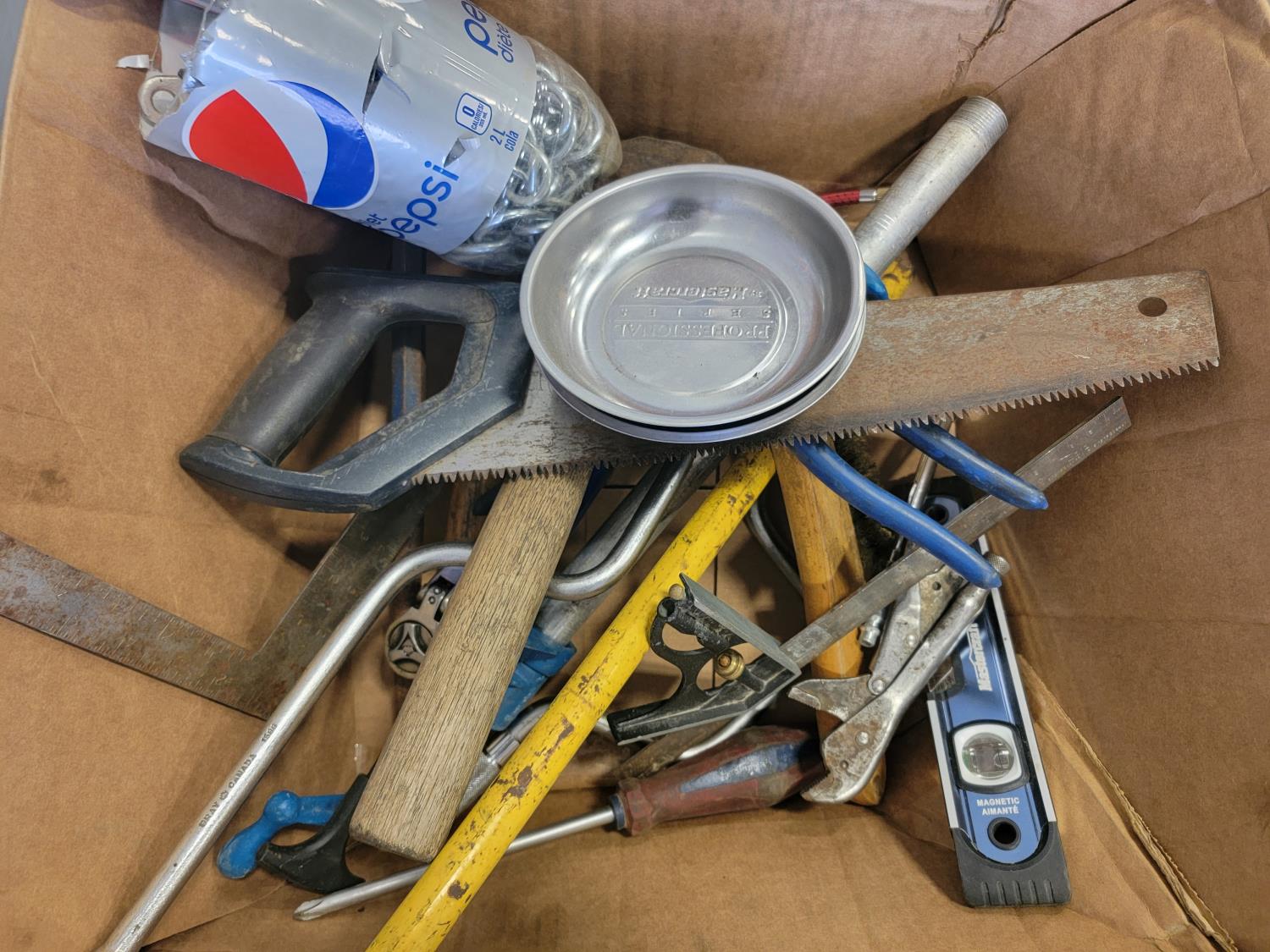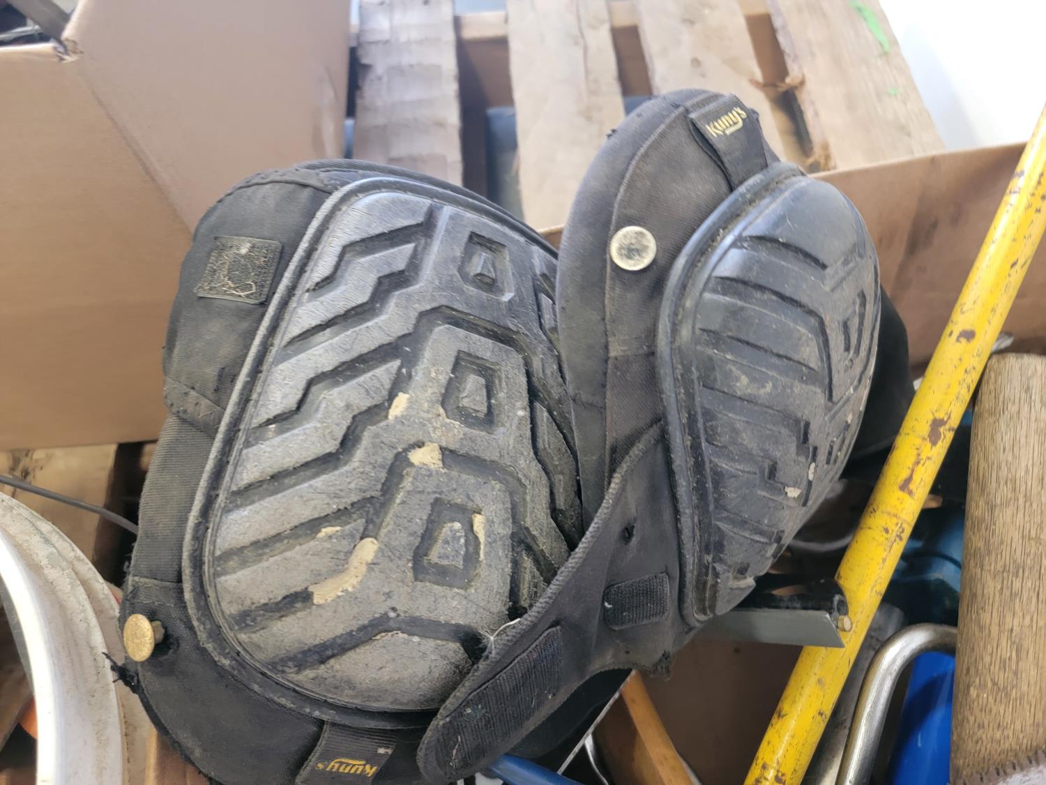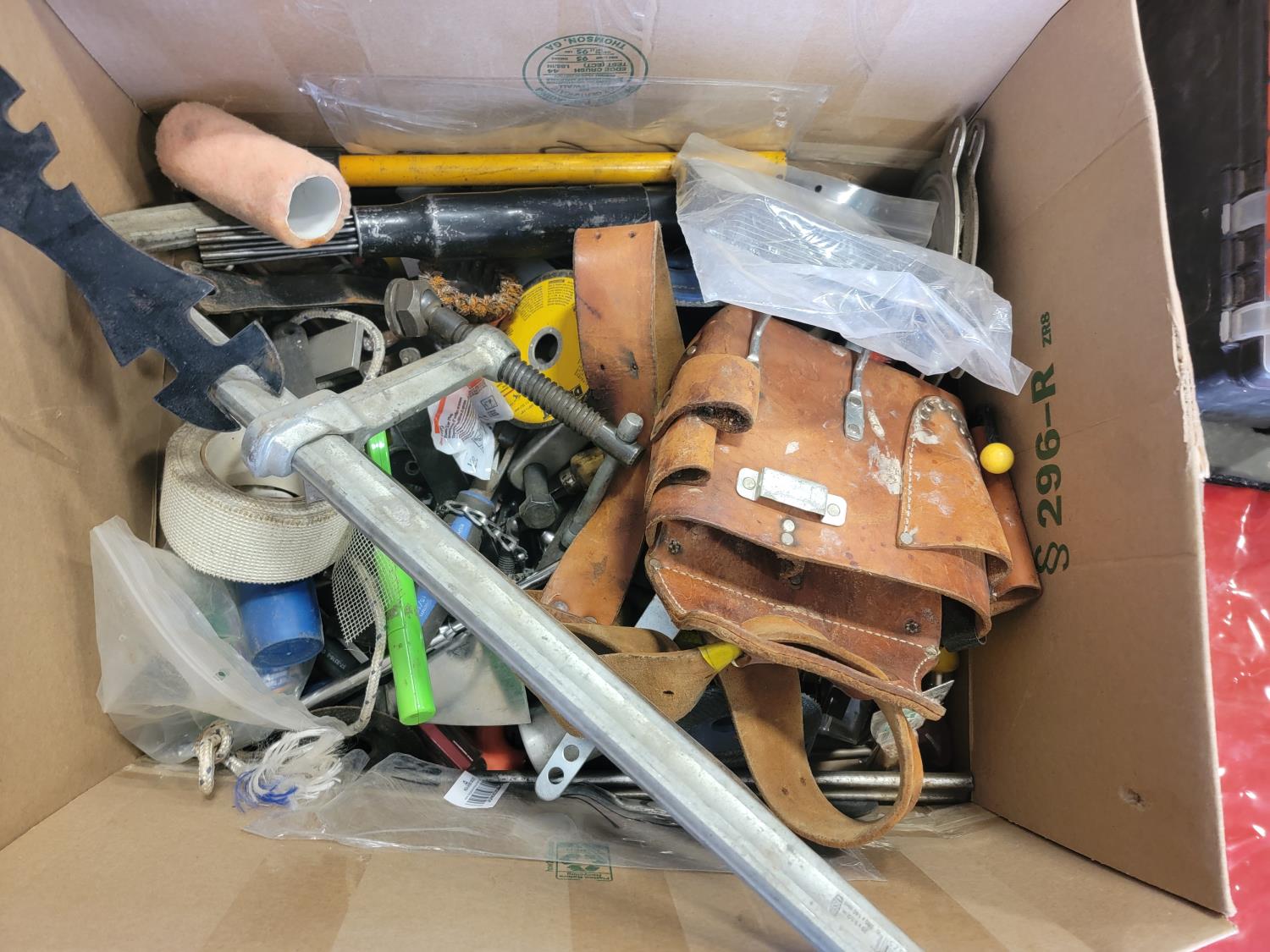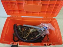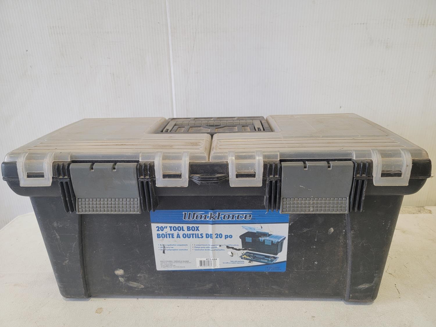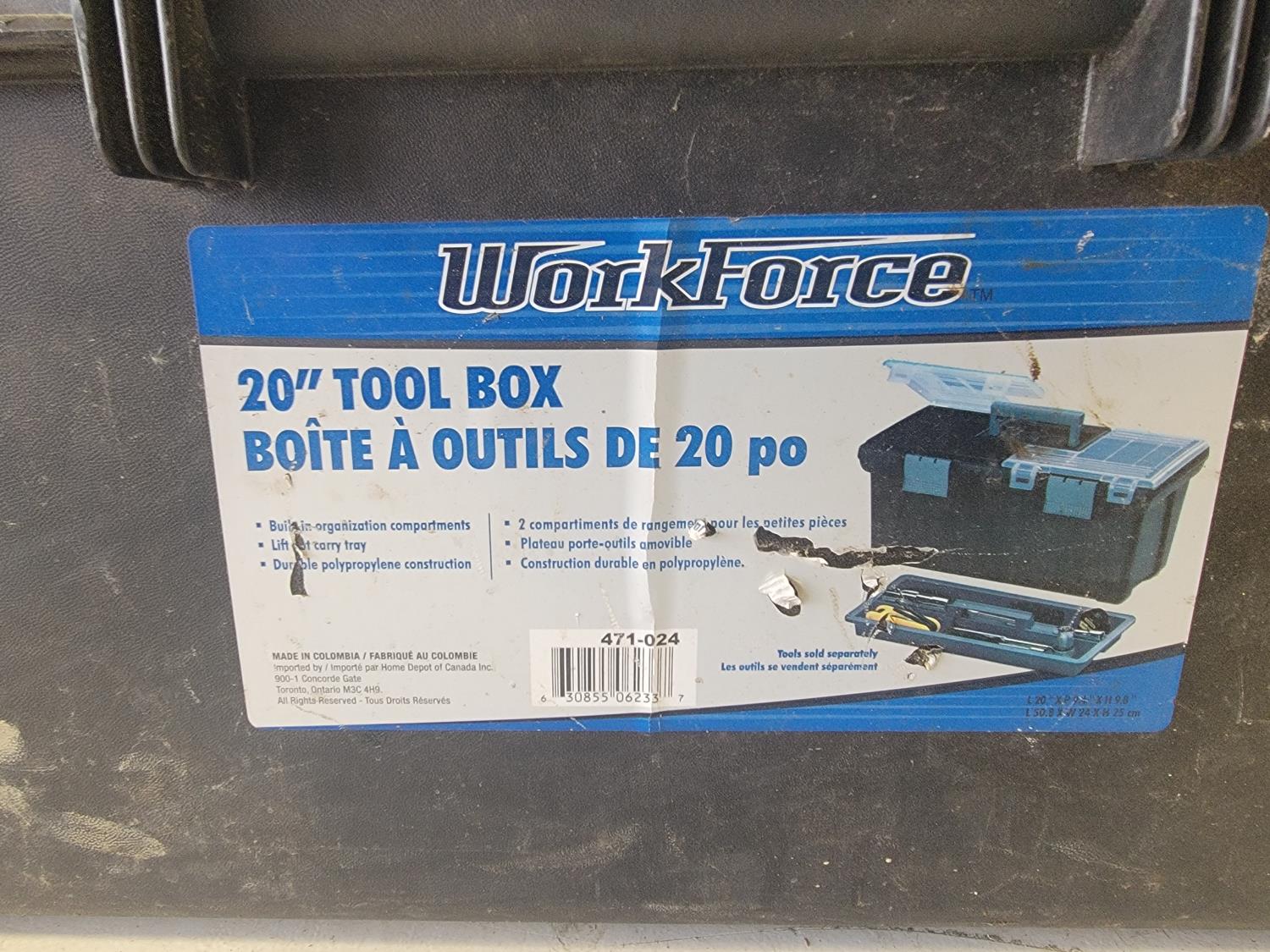 20 inch tool box with contents, folding chair, 19 inch tool box, International tool box, dust pan, hand tools, welding curtain, knee pads