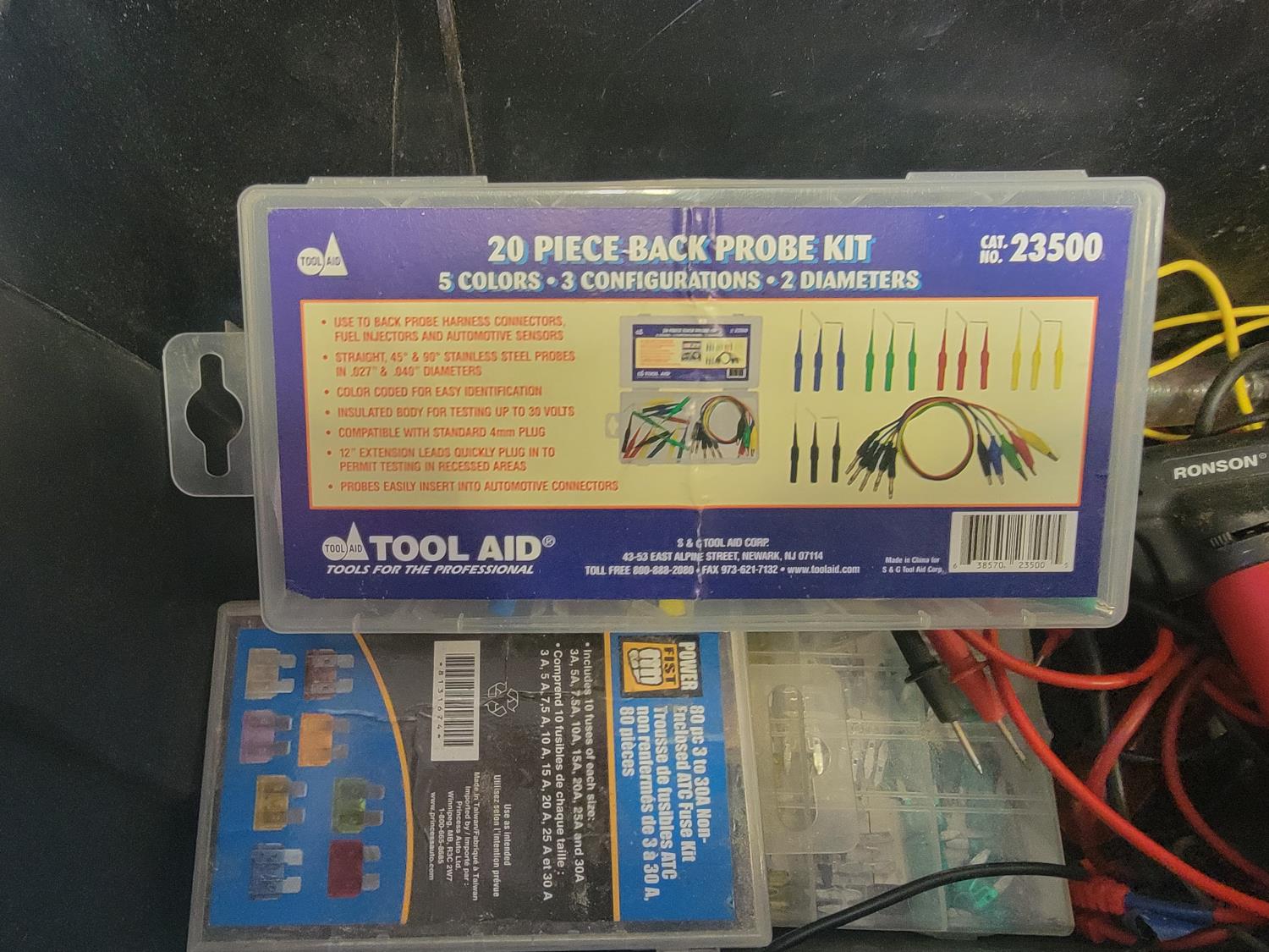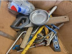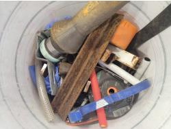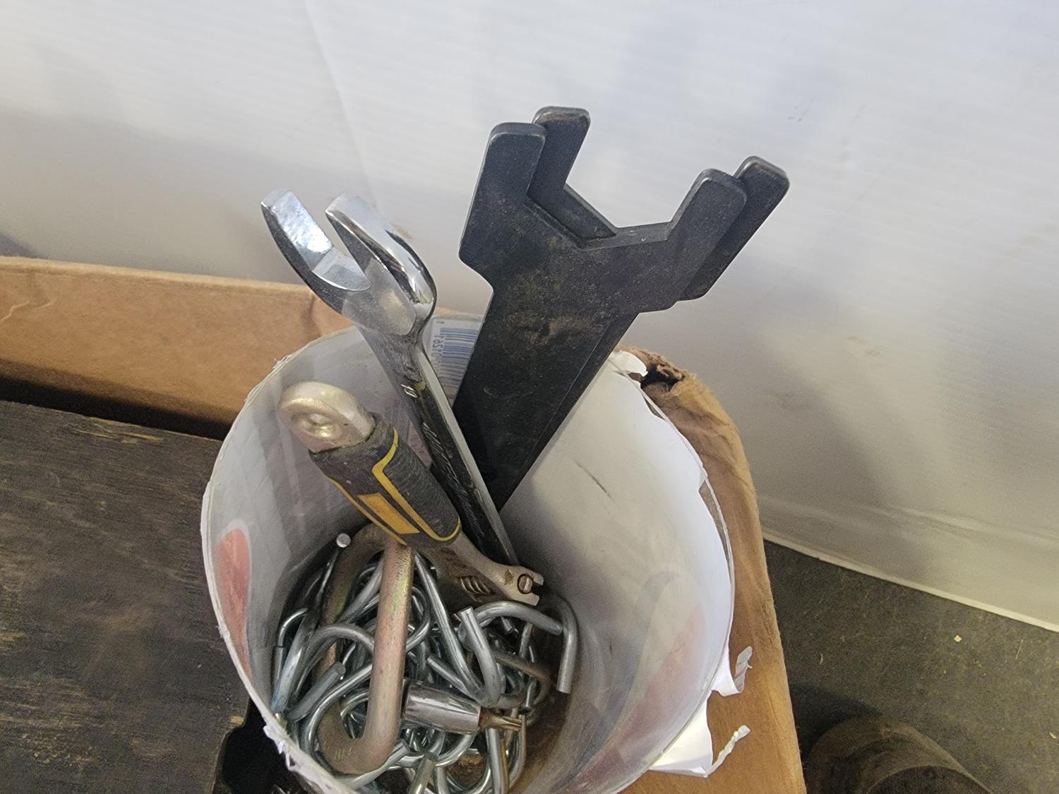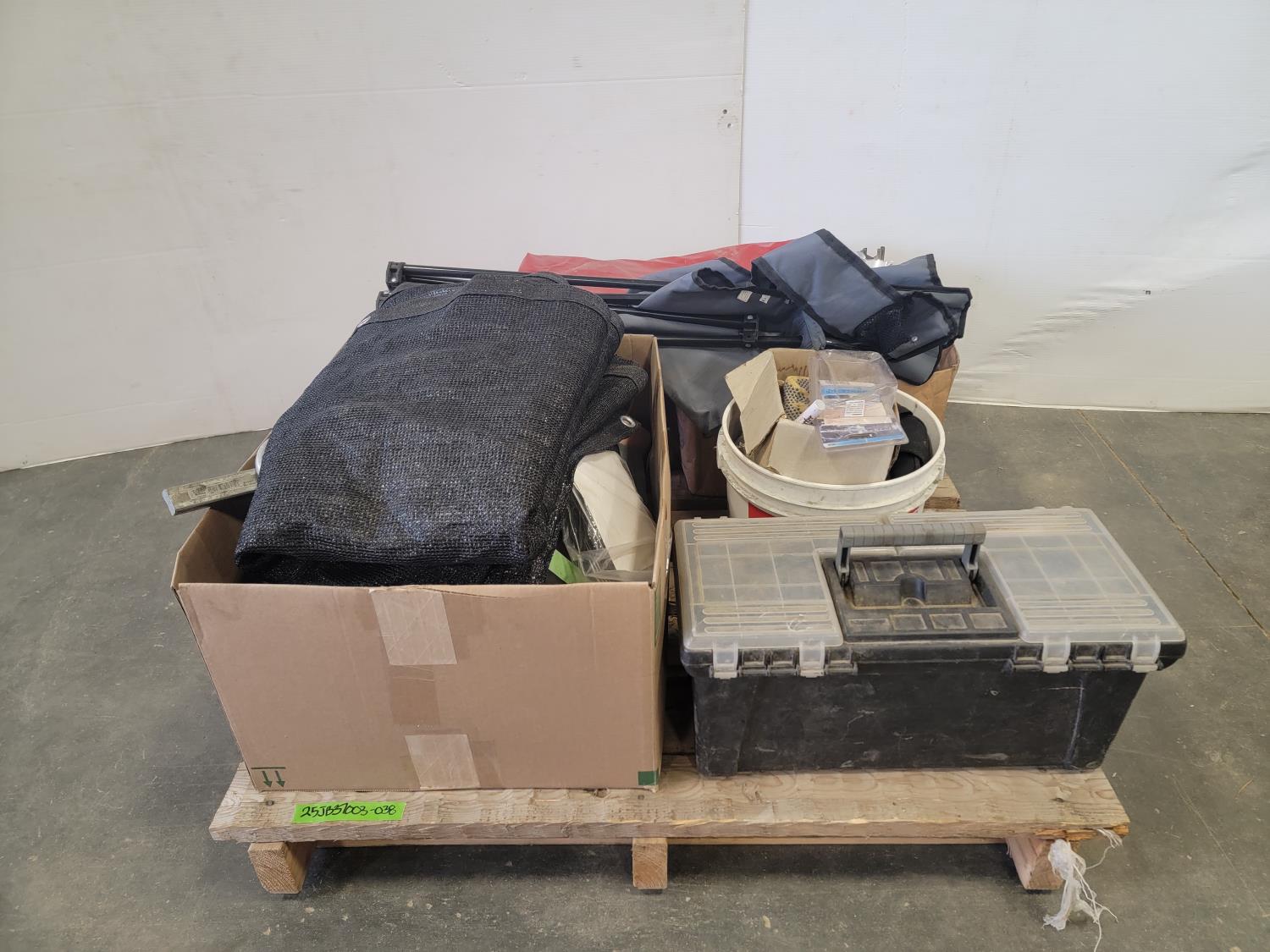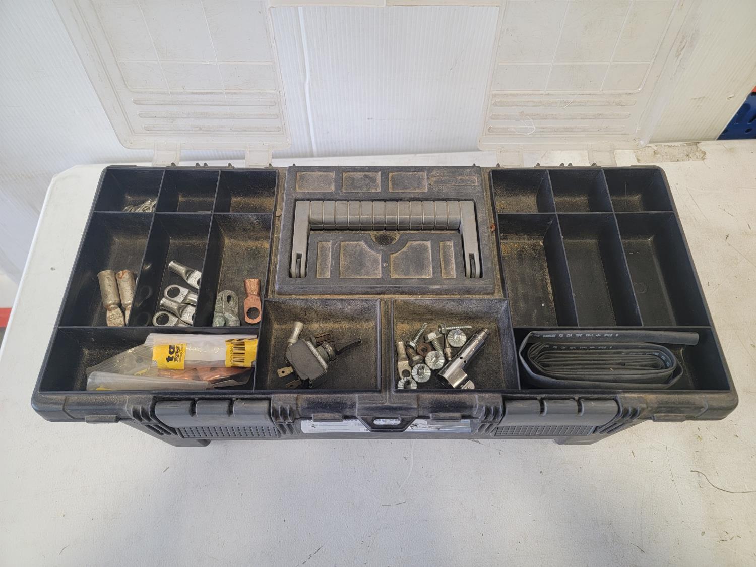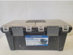 20 inch tool box with contents, folding chair, 19 inch tool box, International tool box, dust pan, hand tools, welding curtain, knee pads