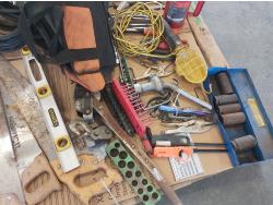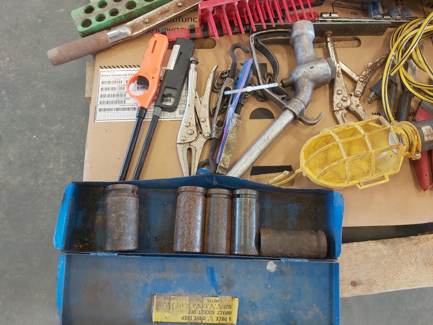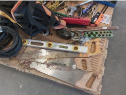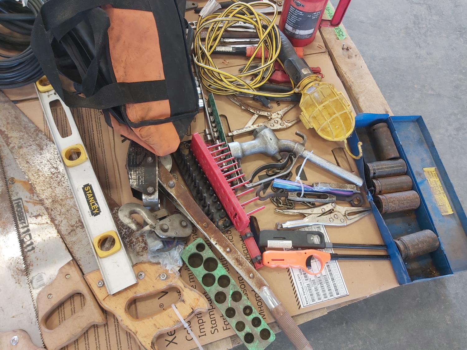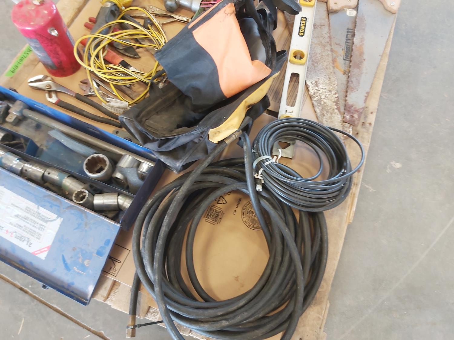Sockets, (2) small tool bags, work lamp, air hose, (3) hand saws, come-along, vise grips, level