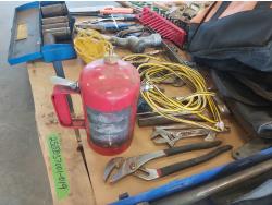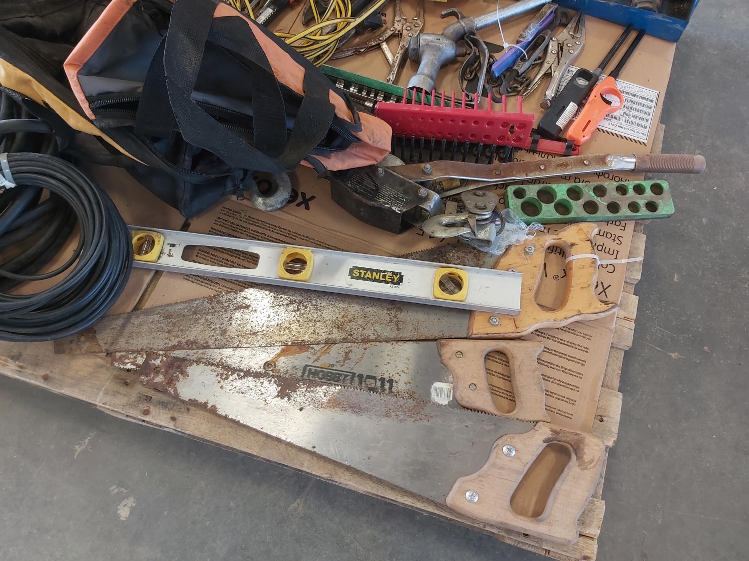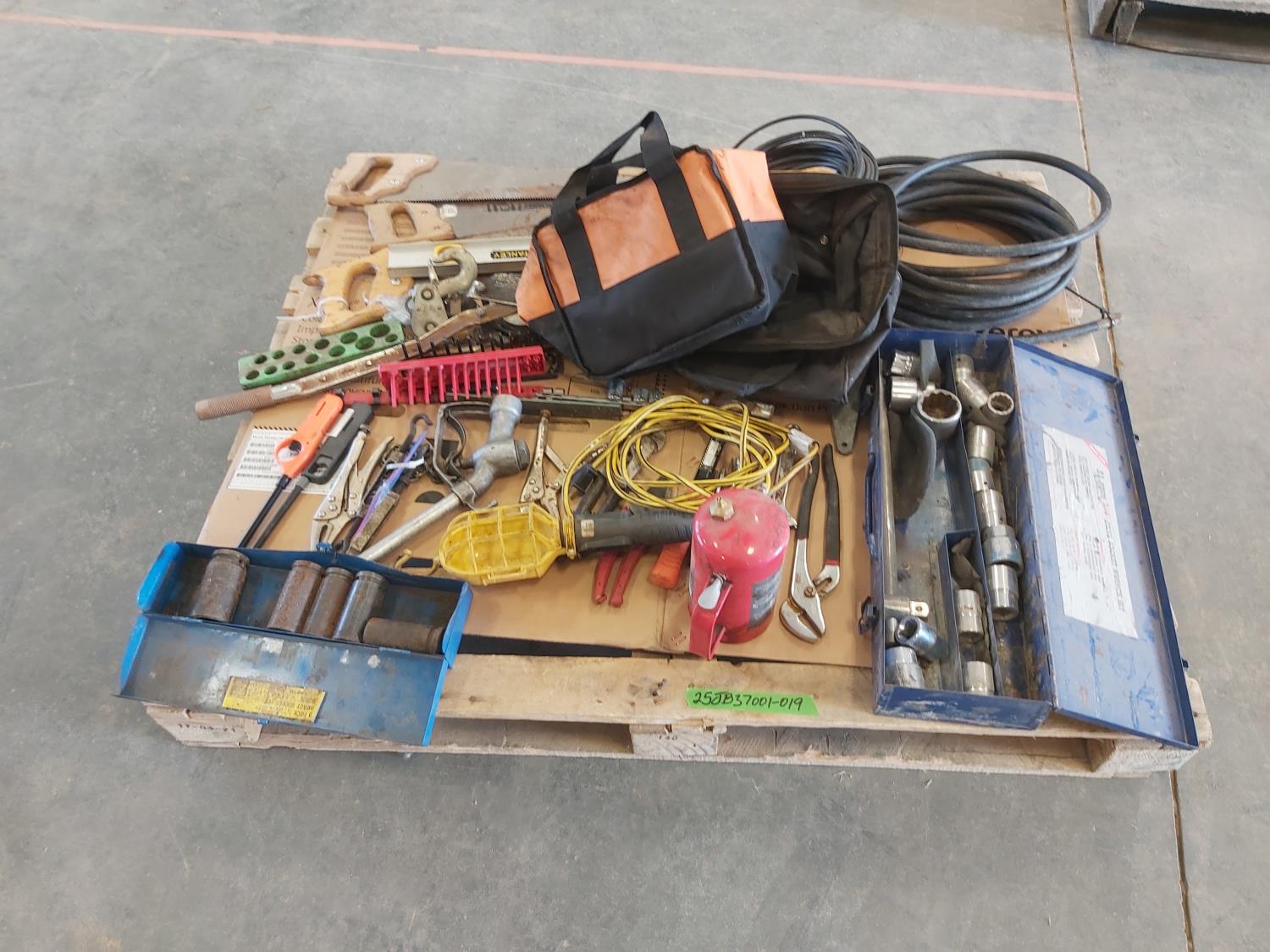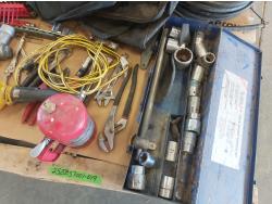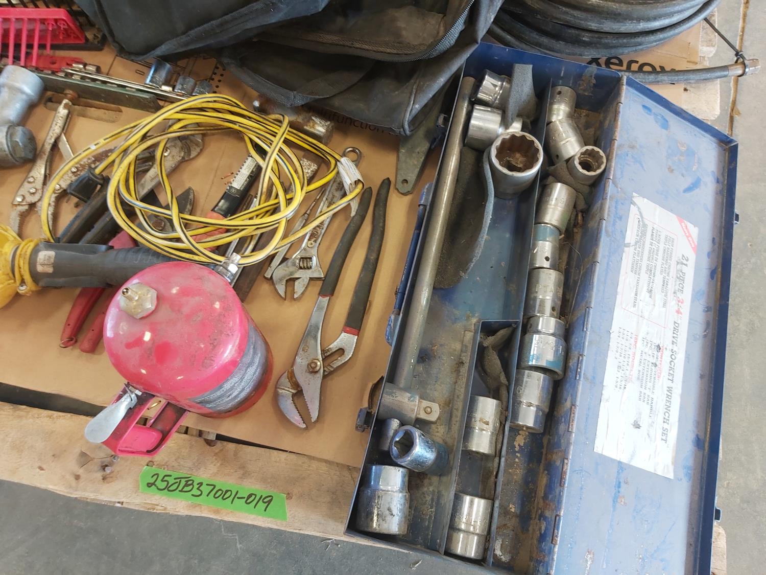 Sockets, (2) small tool bags, work lamp, air hose, (3) hand saws, come-along, vise grips, level