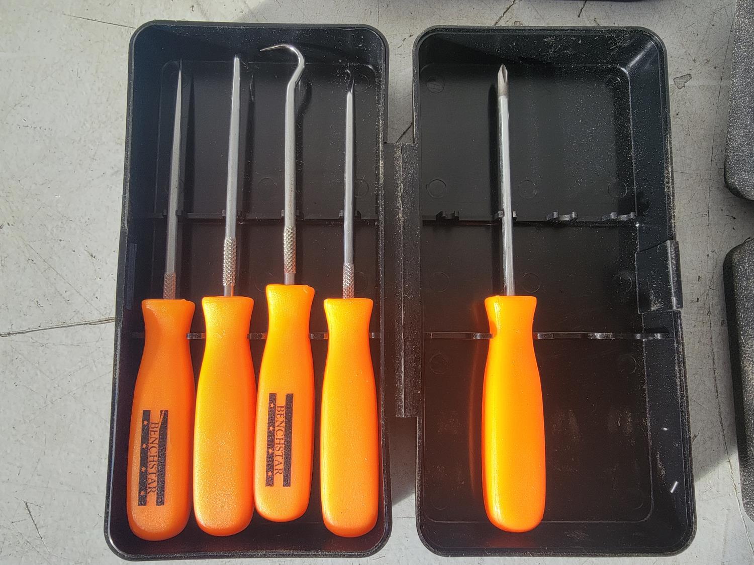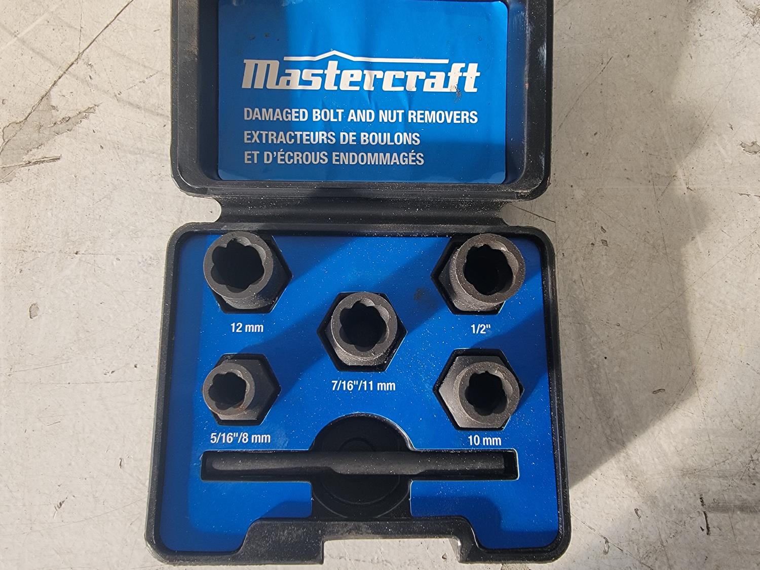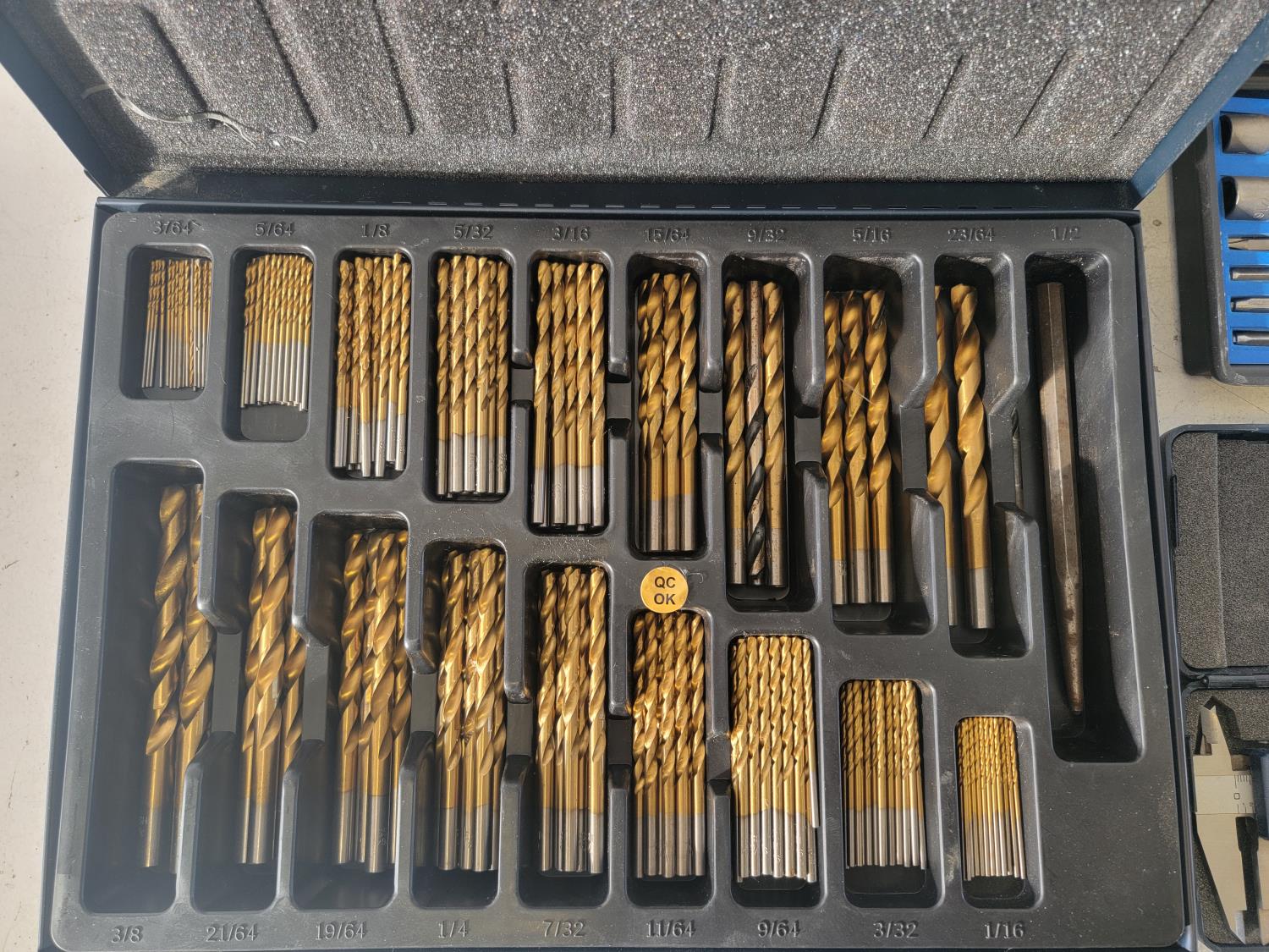 Drill bit set, Mastercraft bolt and nut remover kit, Powerfist 12 piece hollow punch set, Mastercraft digital caliper, bit kit, files, Maximum infrared thermometer