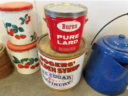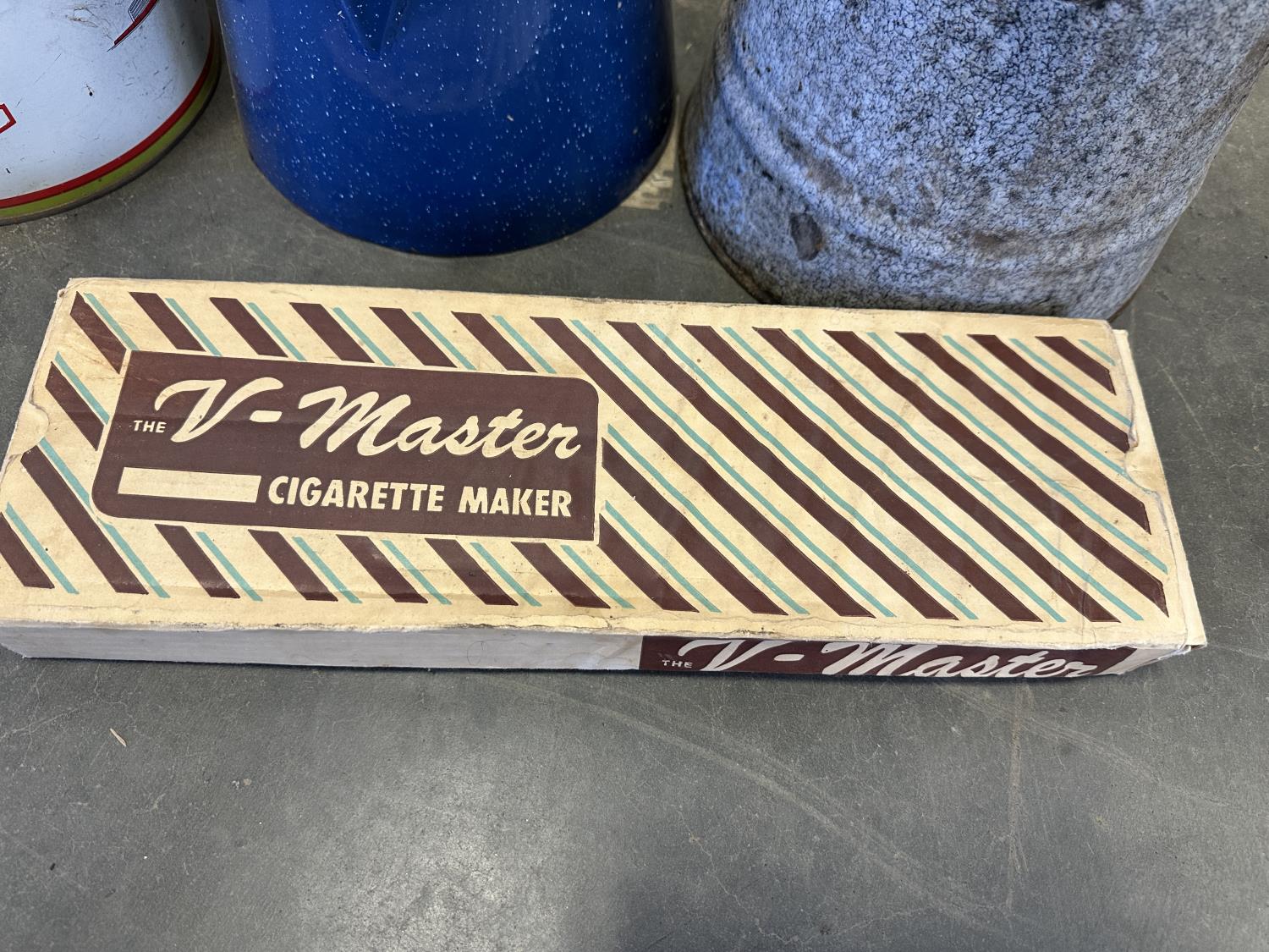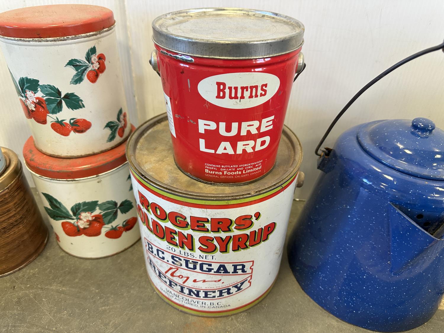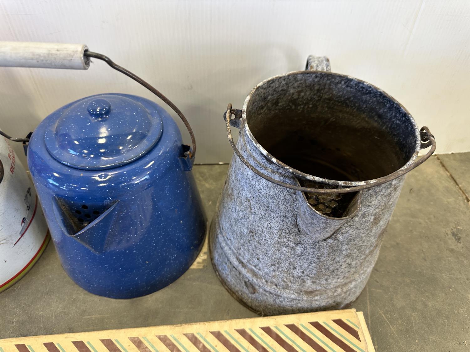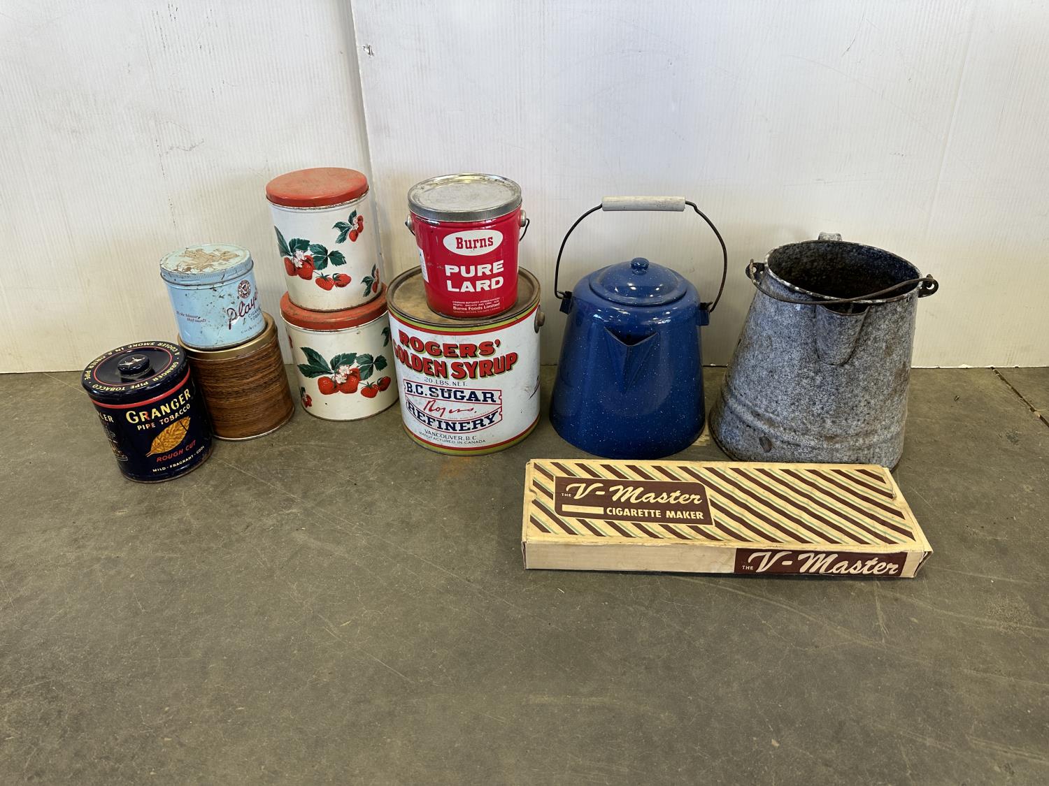 5229 Qty of Vintage Tins, Enamel Kettles and Cigarette Maker