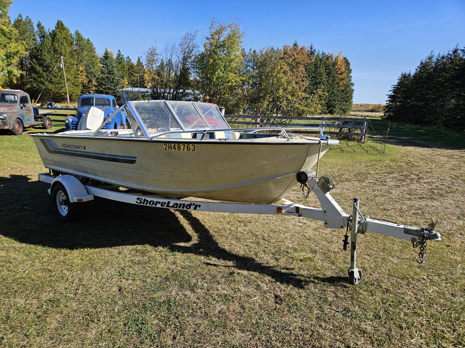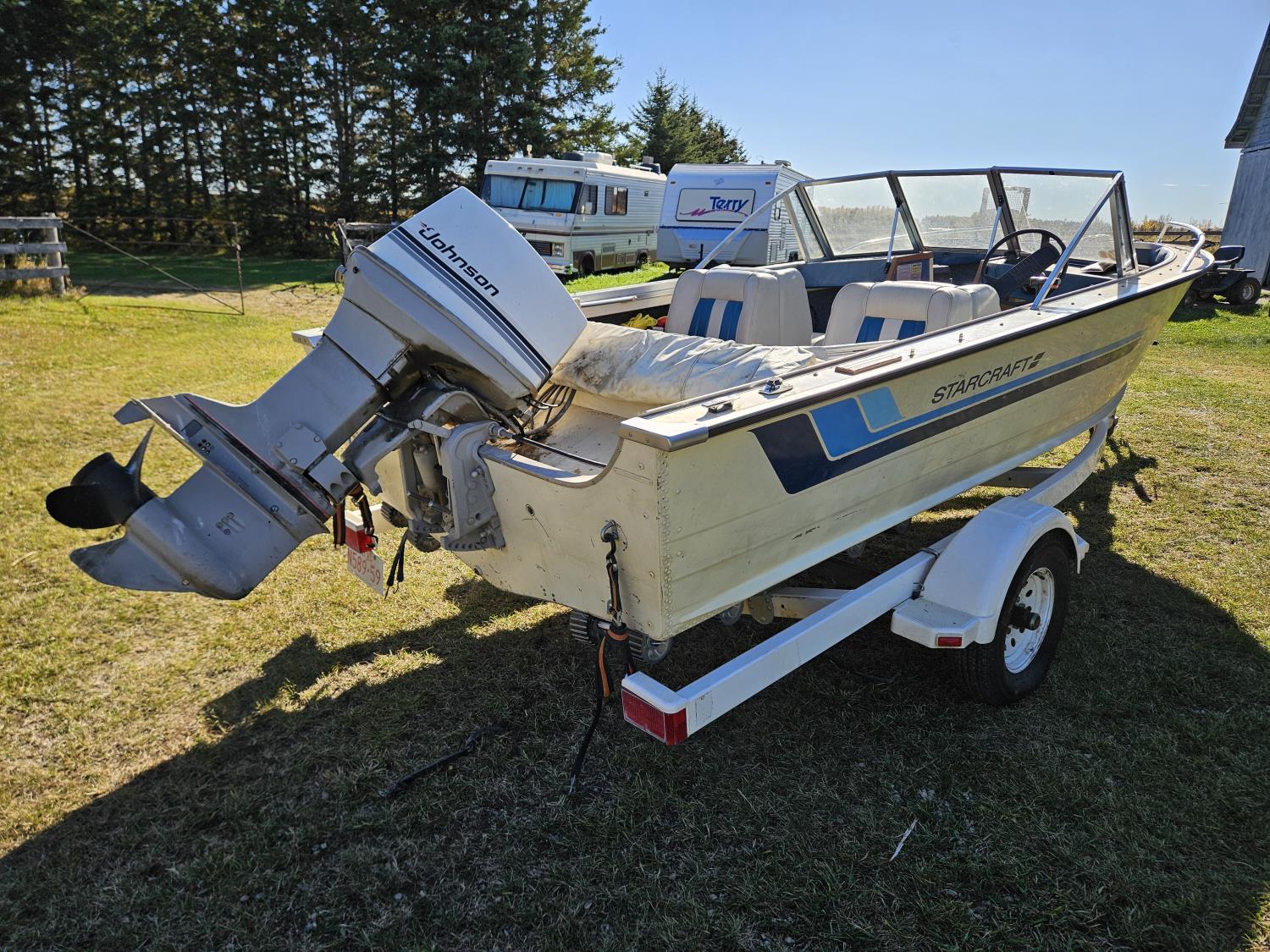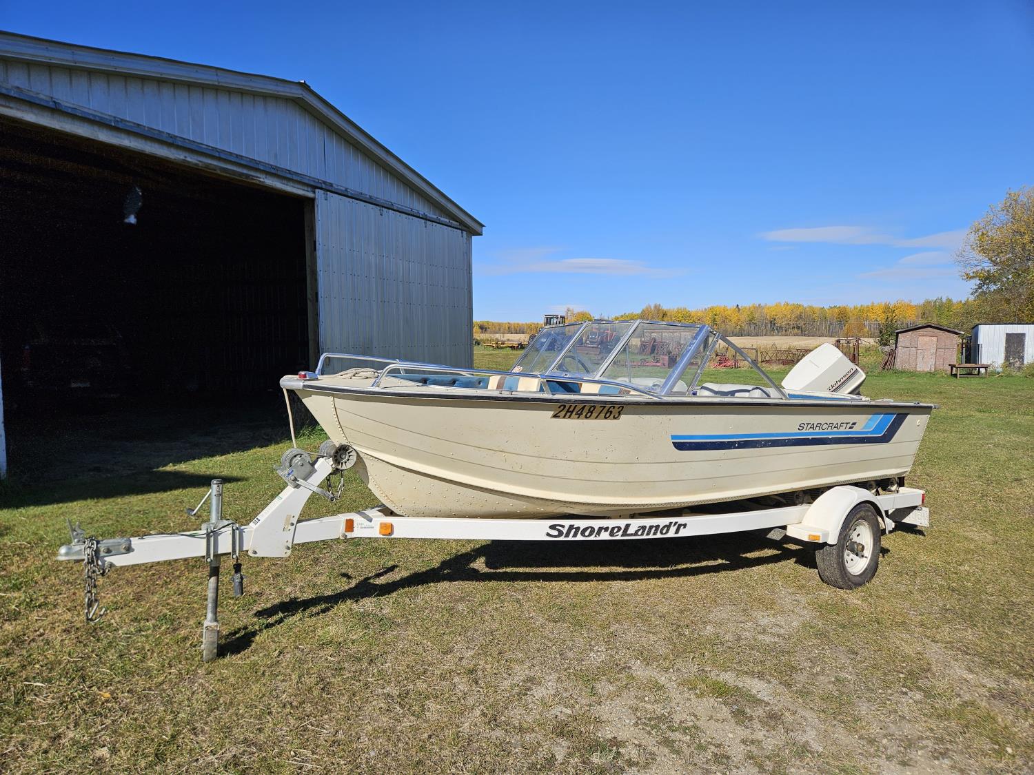 Johnson 70 HP outboard motor, seats 6, life jackets, 2 steel fuel tanks, Minn Kota trolling motor, cover, 1996 ShoreLand'r S/A trailer, 175/80R13 tires, stored indoors, ran when parked