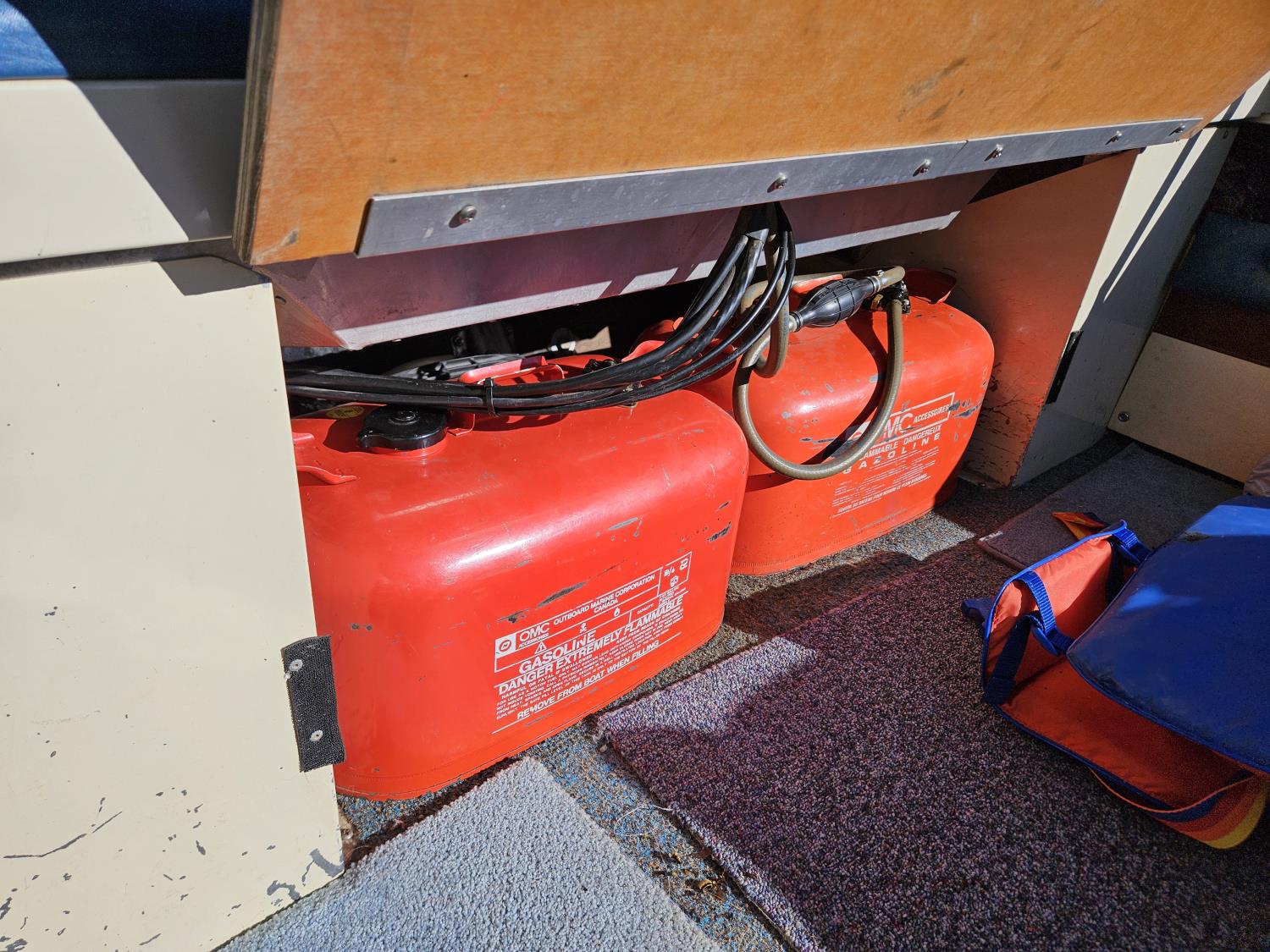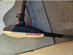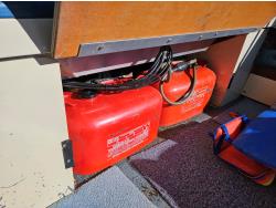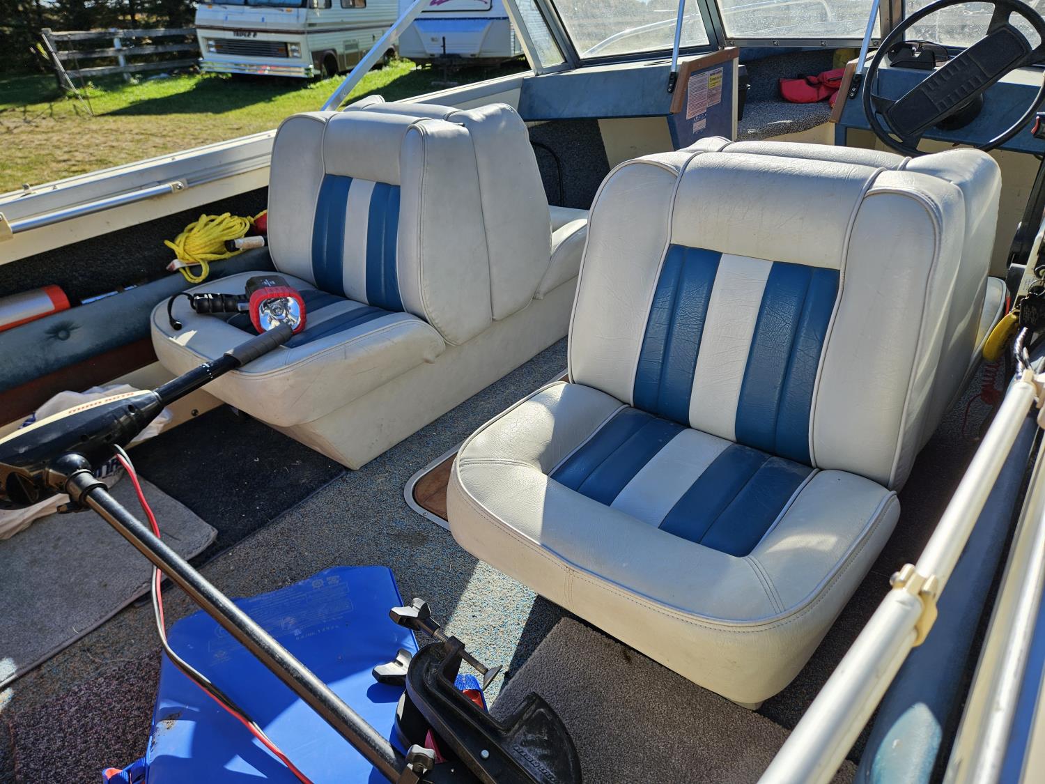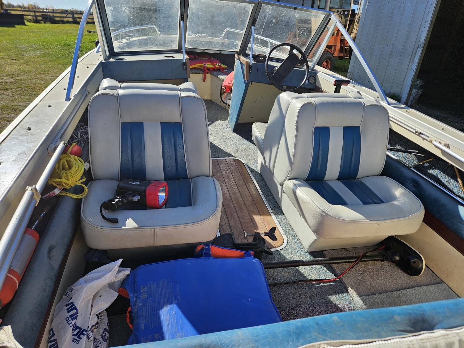 Johnson 70 HP outboard motor, seats 6, life jackets, 2 steel fuel tanks, Minn Kota trolling motor, cover, 1996 ShoreLand'r S/A trailer, 175/80R13 tires, stored indoors, ran when parked