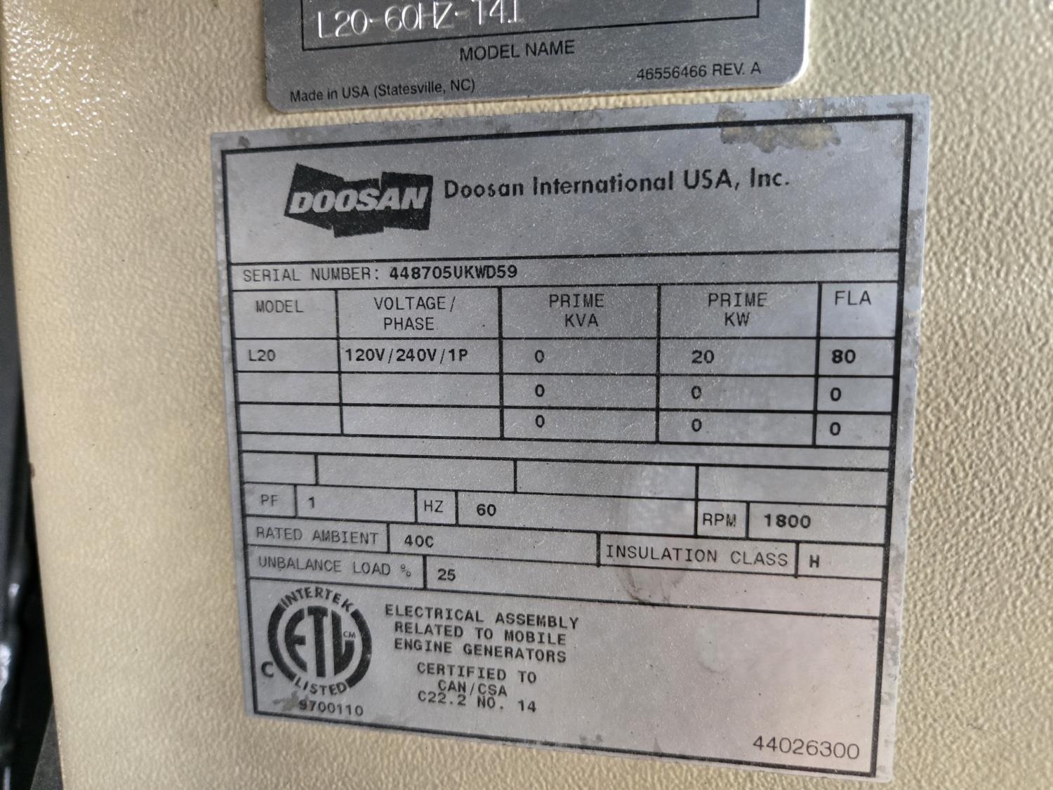84 2013 Doosan L20-60HZ-T4I 20 Kw Light Tower
