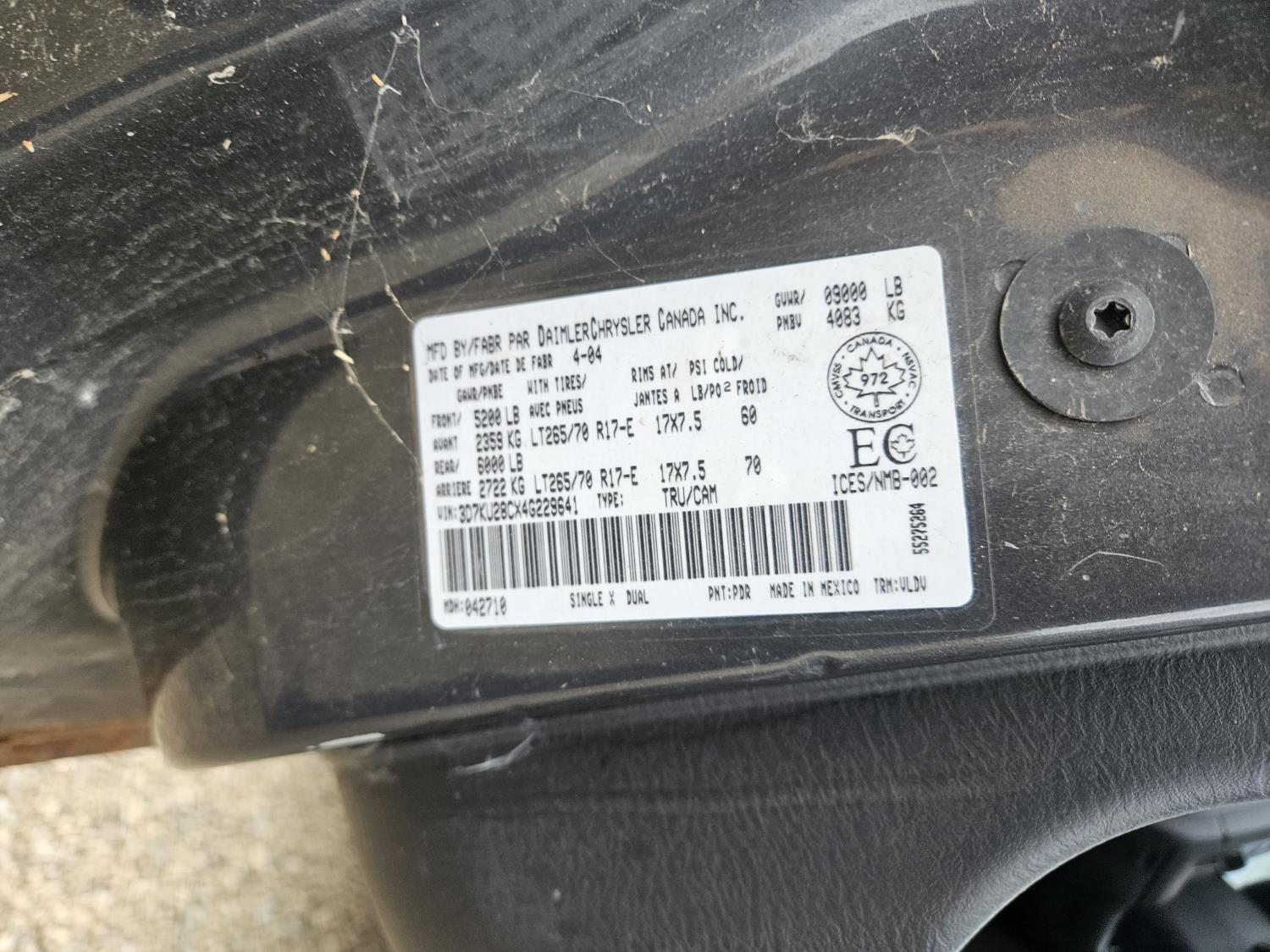 685 2004 Dodge 2500 Laramie 4X4 Crew Cab Pickup Truck (Inoperable)
