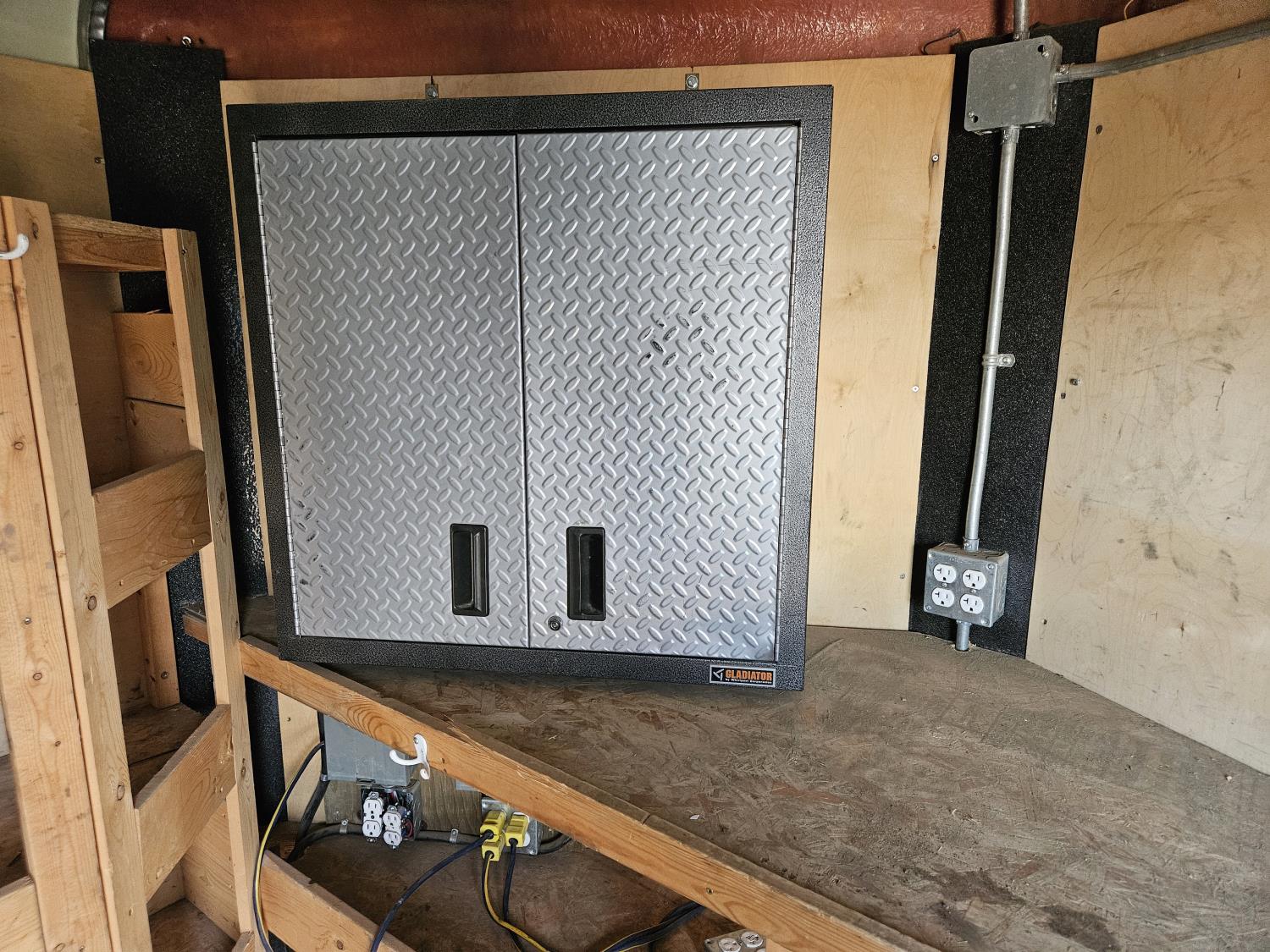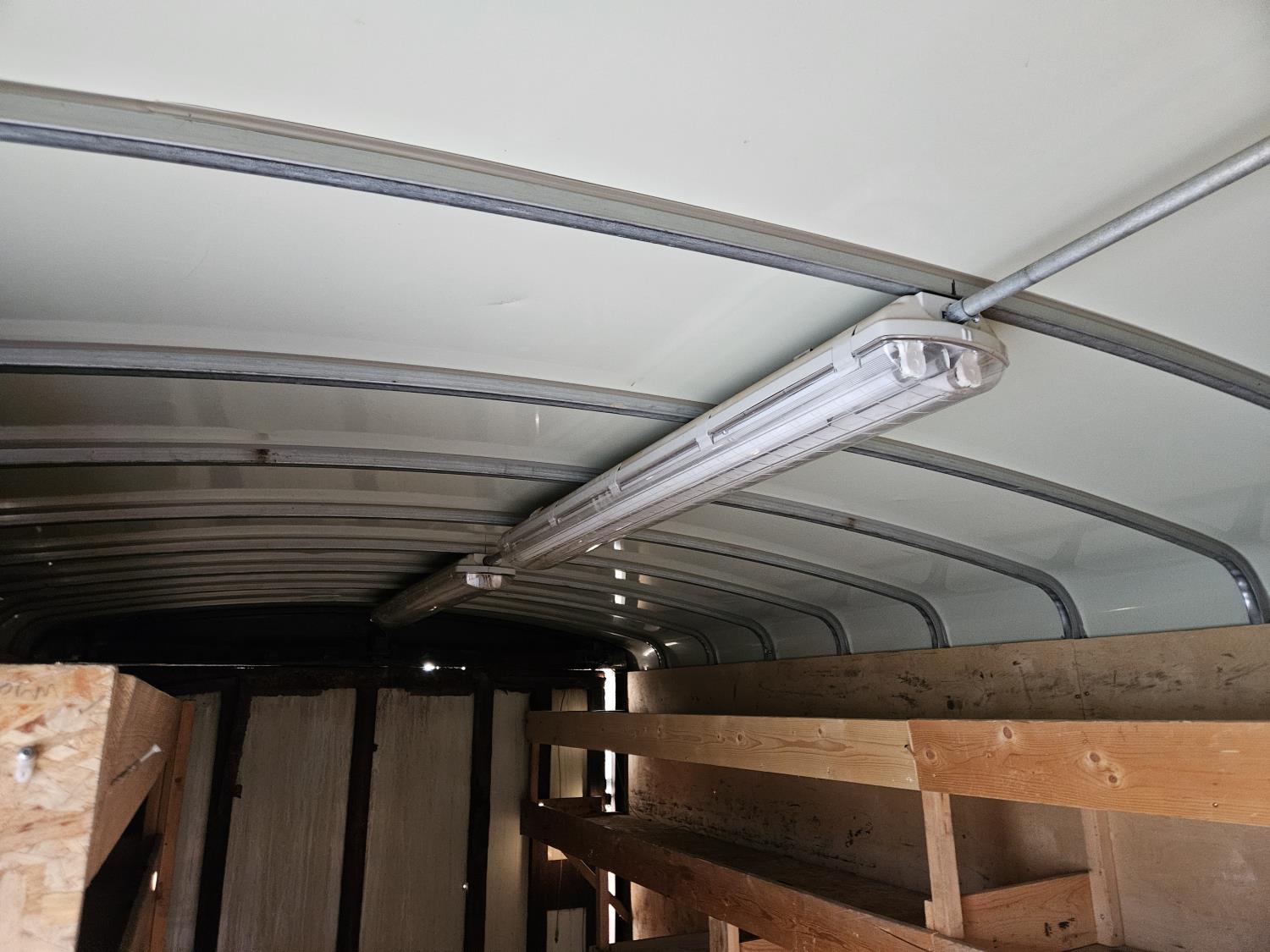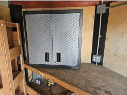 7 inch interior width, ball hitch, side door, fold down door, electric brakes, spring suspension, shelving, LED interior lighting, electric space heater, 7000 lb axles, 235/80R16 tires