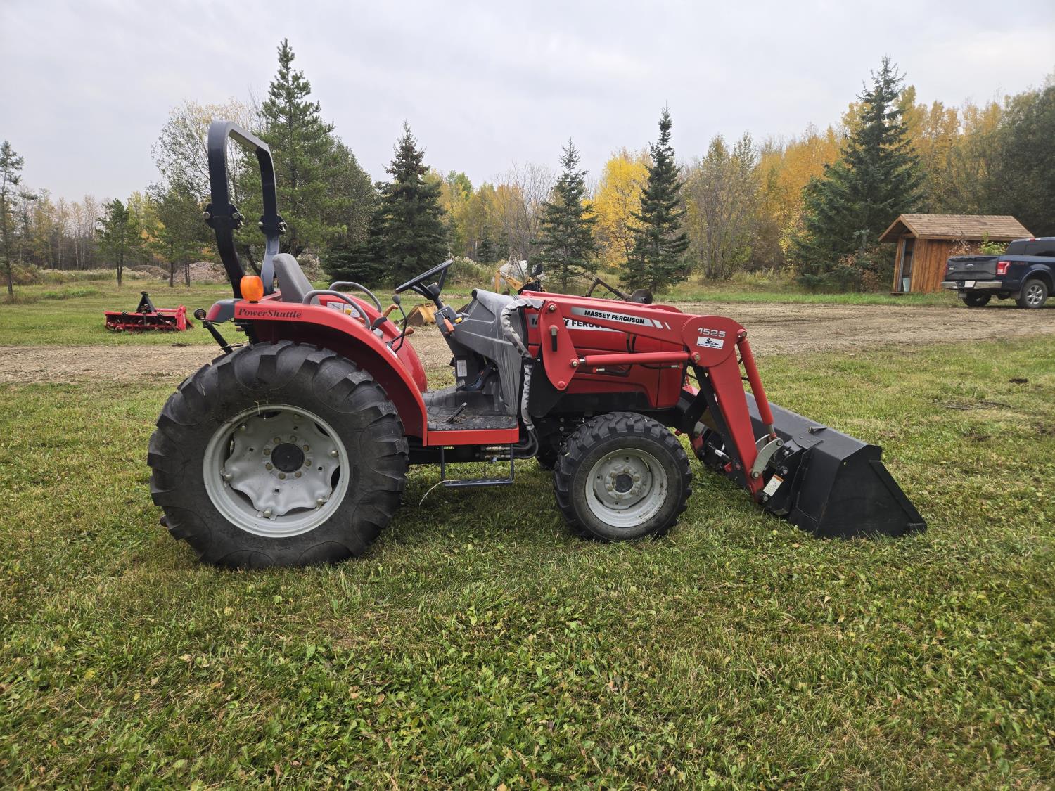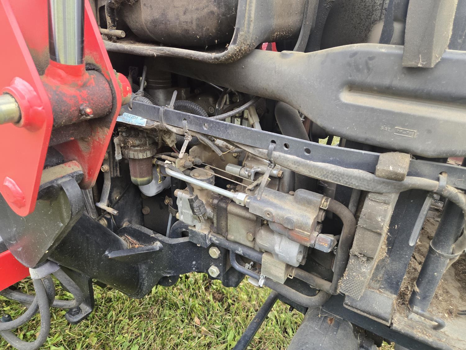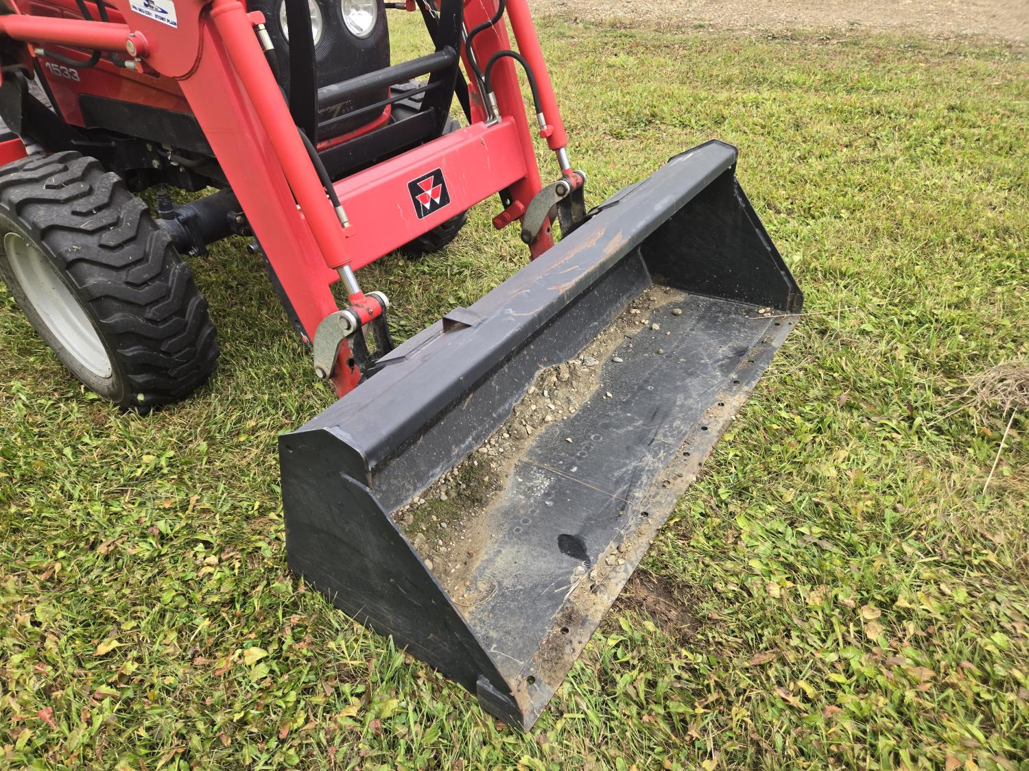 Massey Ferguson 1525 loader, Q/A, 66 inch bucket, Iseki 1.5 L 3 cylinder 33 HP, engine, 26 PTO HP, 12 speed manual transmission, shuttle shift, rear differential lock, joystick, 540 PTO, 3 point hitch, 10-16.5 front tires, 14.9-24 rear tires