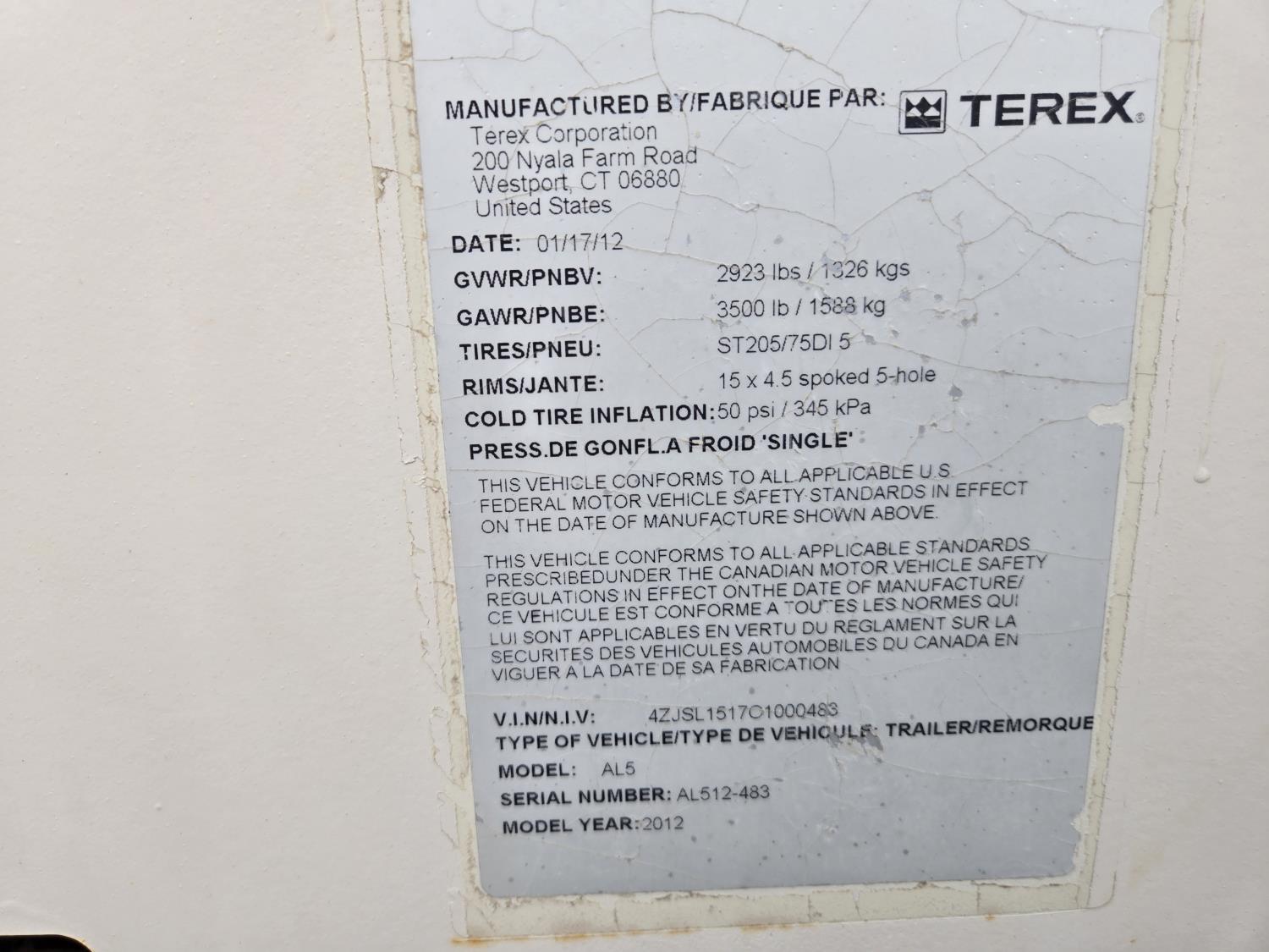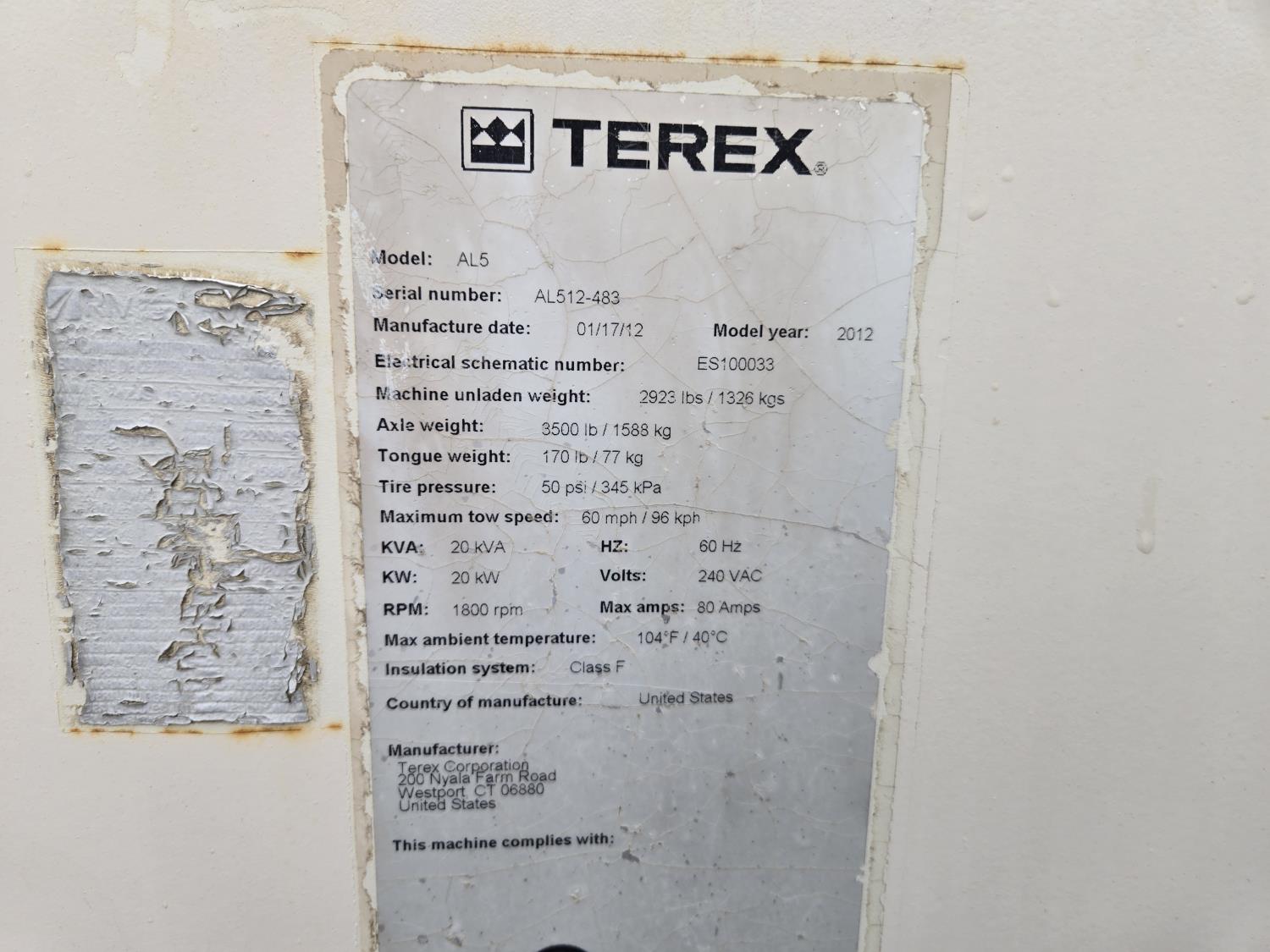 103 2012 Terex AL5 20 Kw Towable Light Tower
