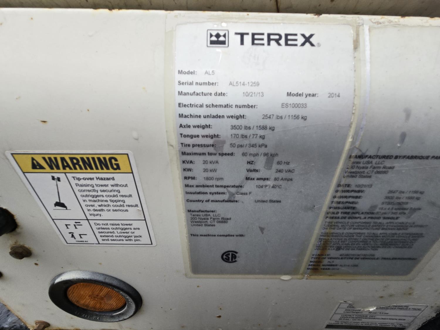 89 2014 Terex AL5 20 Kw Towable Light Tower