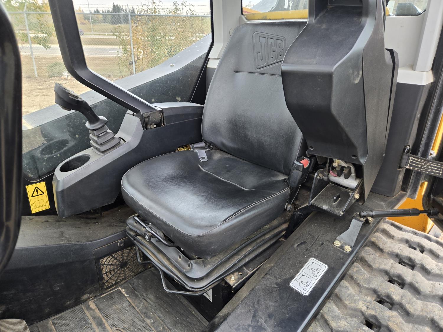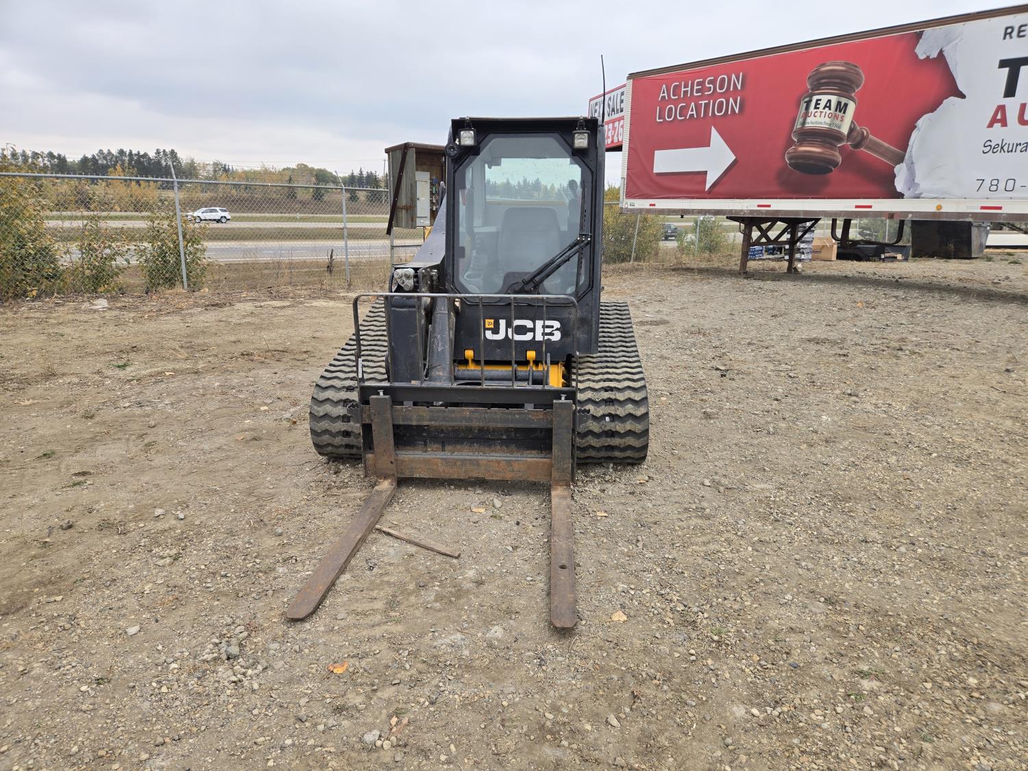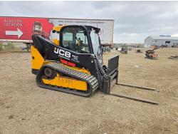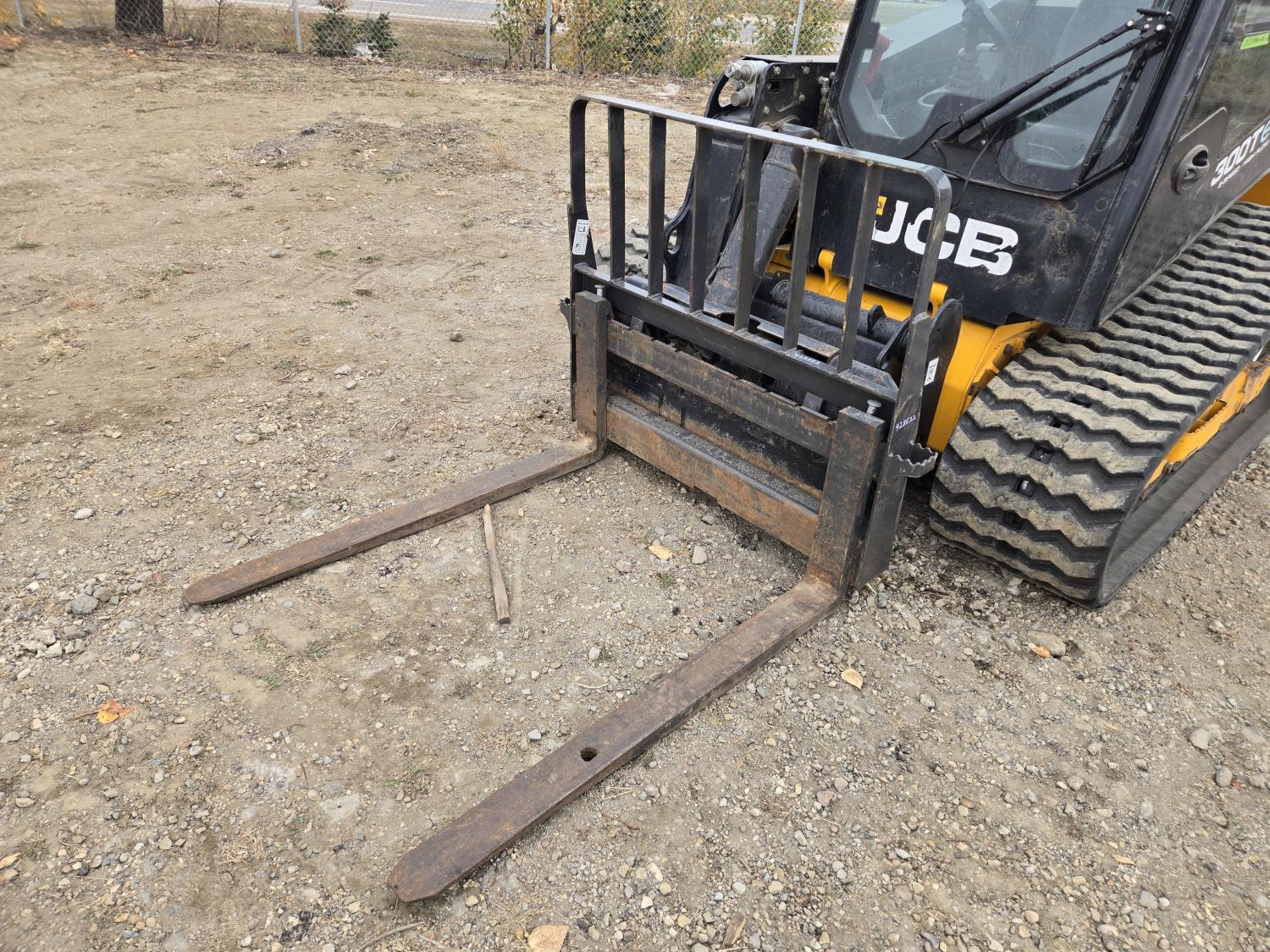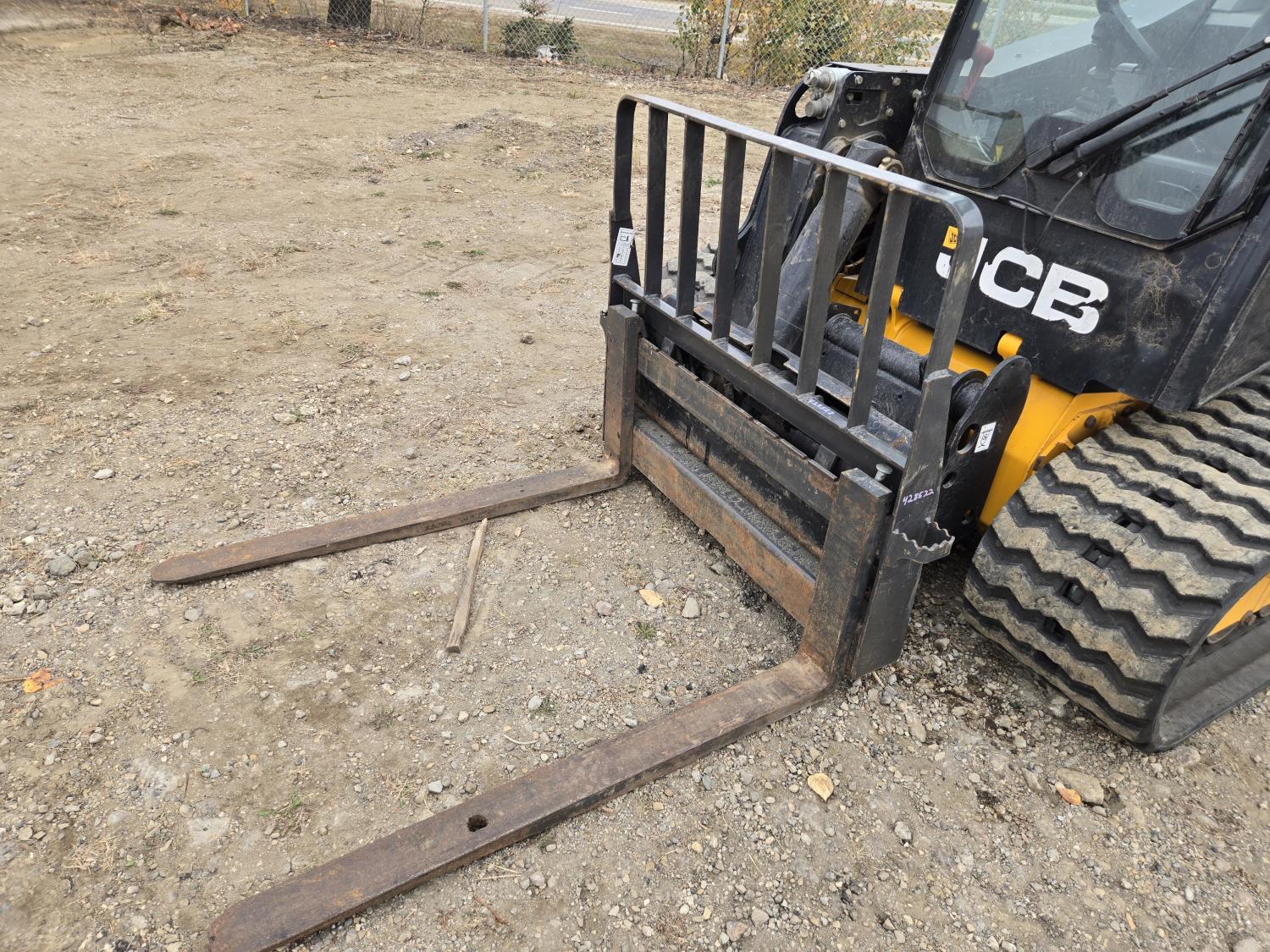 Enclosed cab, A/C, air ride seat, heated seat, control pattern change, rear view cameras, diesel engine, 2 speed transmission, 48 inch pallet forks, electric Q/C coupler, 1 auxiliary hydraulics, high flow hydraulics, counter weight, 18 inch rubber tracks