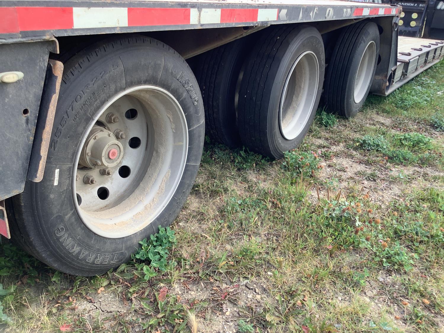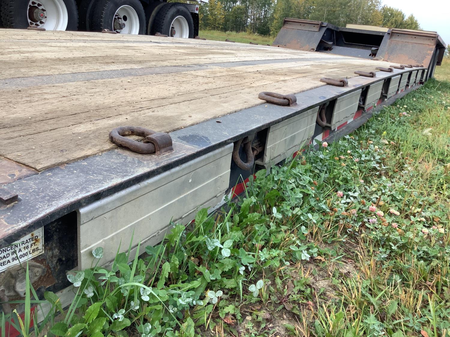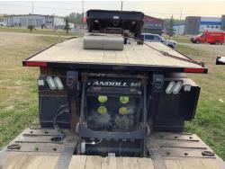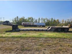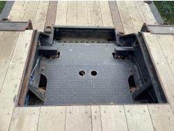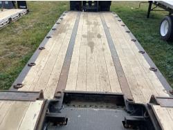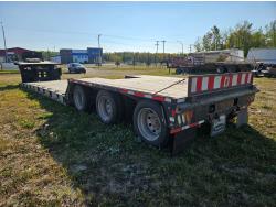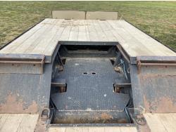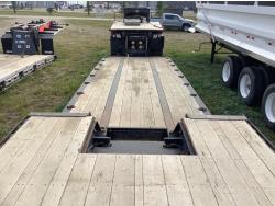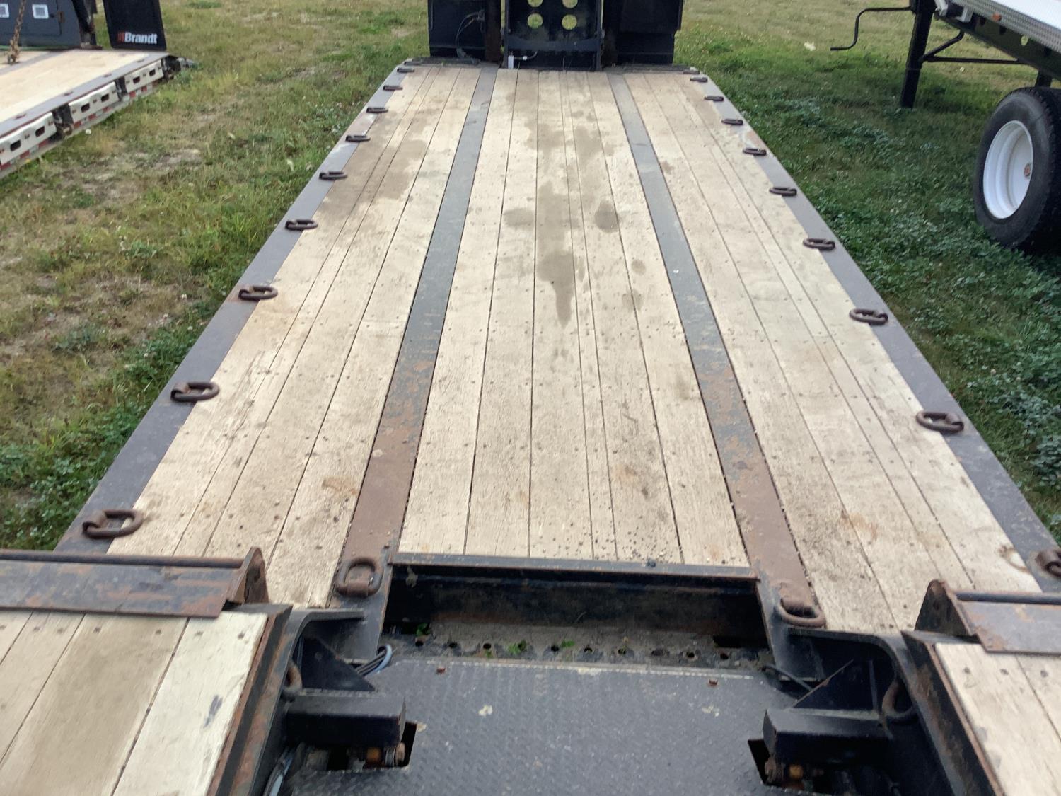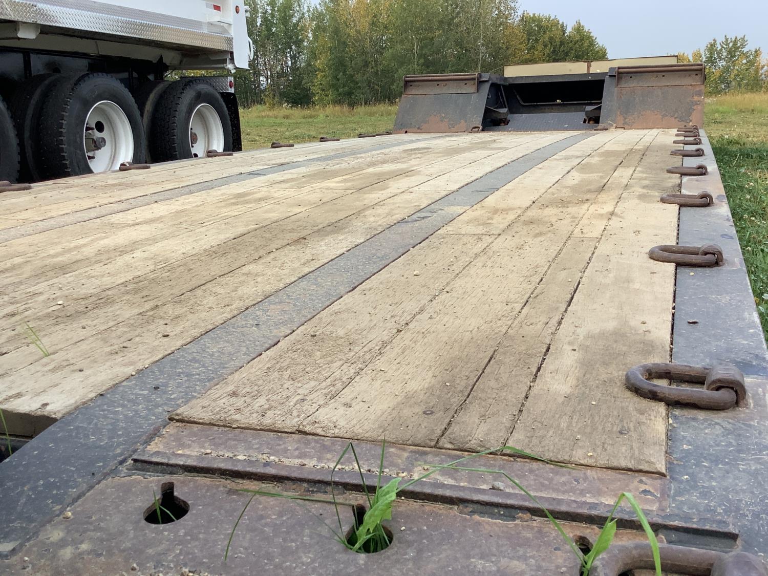 10 ft wide, 9 ft top deck, 26 ft main deck, with aluminum pull out extension to 15 ft, 13 ft rear deck, air ride suspension, wide load and rear strobe lights, removable aluminum ramps for rear deck loading, flip neck extension for tandem jeep, front mount Warn 20XL hydraulic winch, D ring tie downs, hydraulic neck stinger arm, all aluminum rims, 255/70R22.5 tires