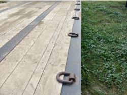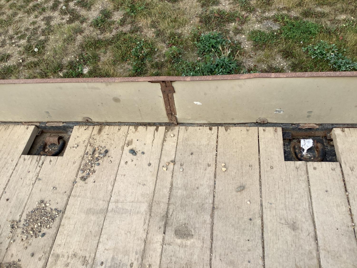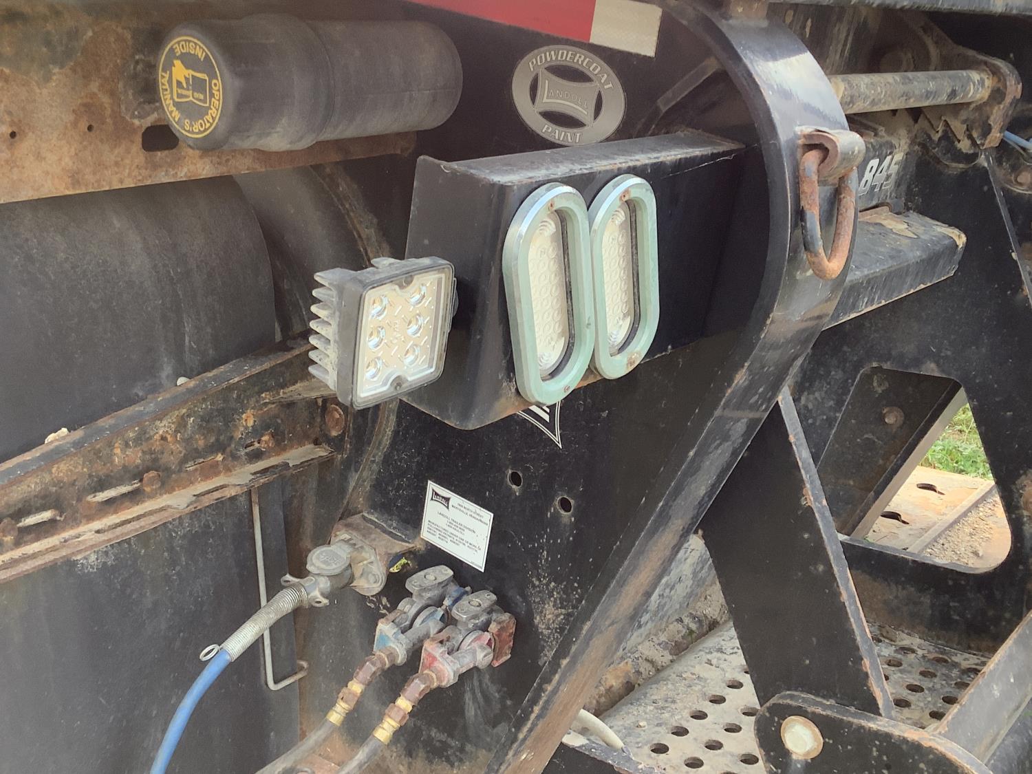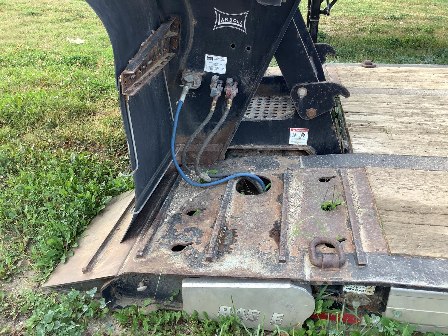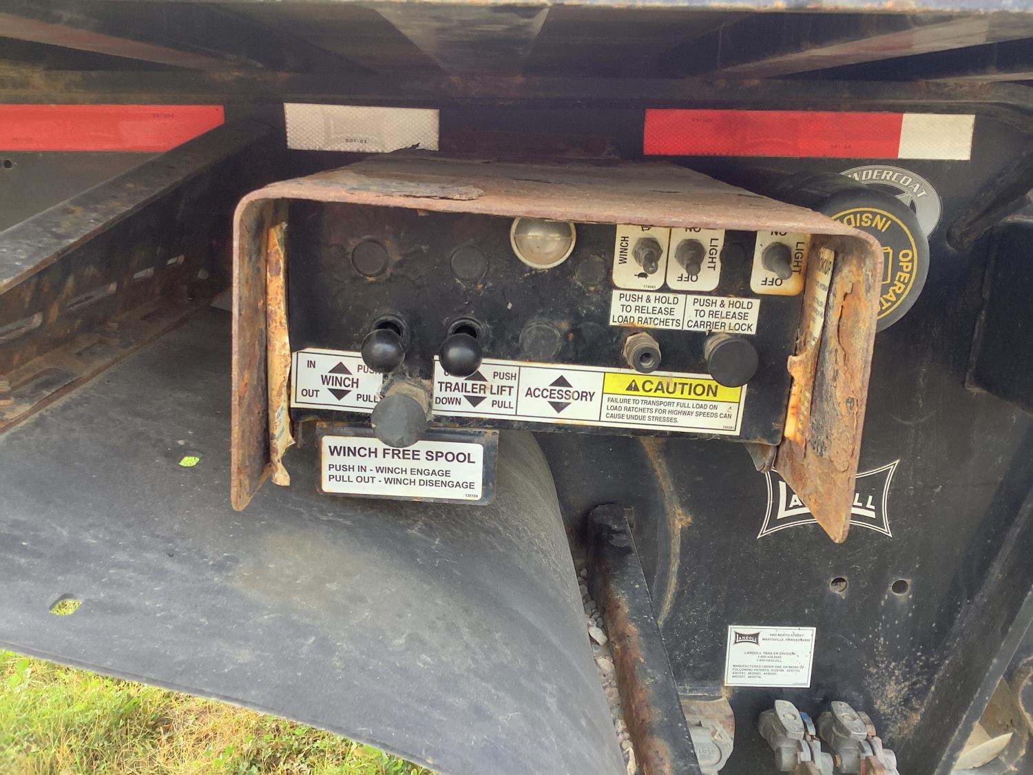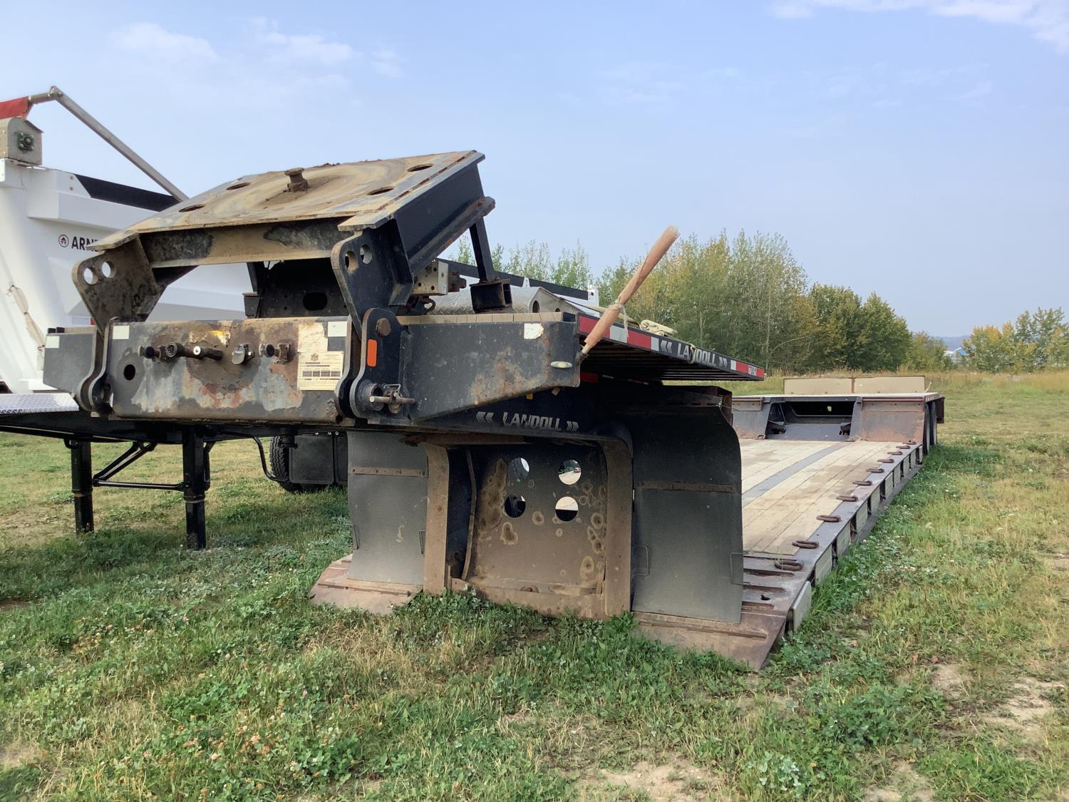 10 ft wide, 9 ft top deck, 26 ft main deck, with aluminum pull out extension to 15 ft, 13 ft rear deck, air ride suspension, wide load and rear strobe lights, removable aluminum ramps for rear deck loading, flip neck extension for tandem jeep, front mount Warn 20XL hydraulic winch, D ring tie downs, hydraulic neck stinger arm, all aluminum rims, 255/70R22.5 tires