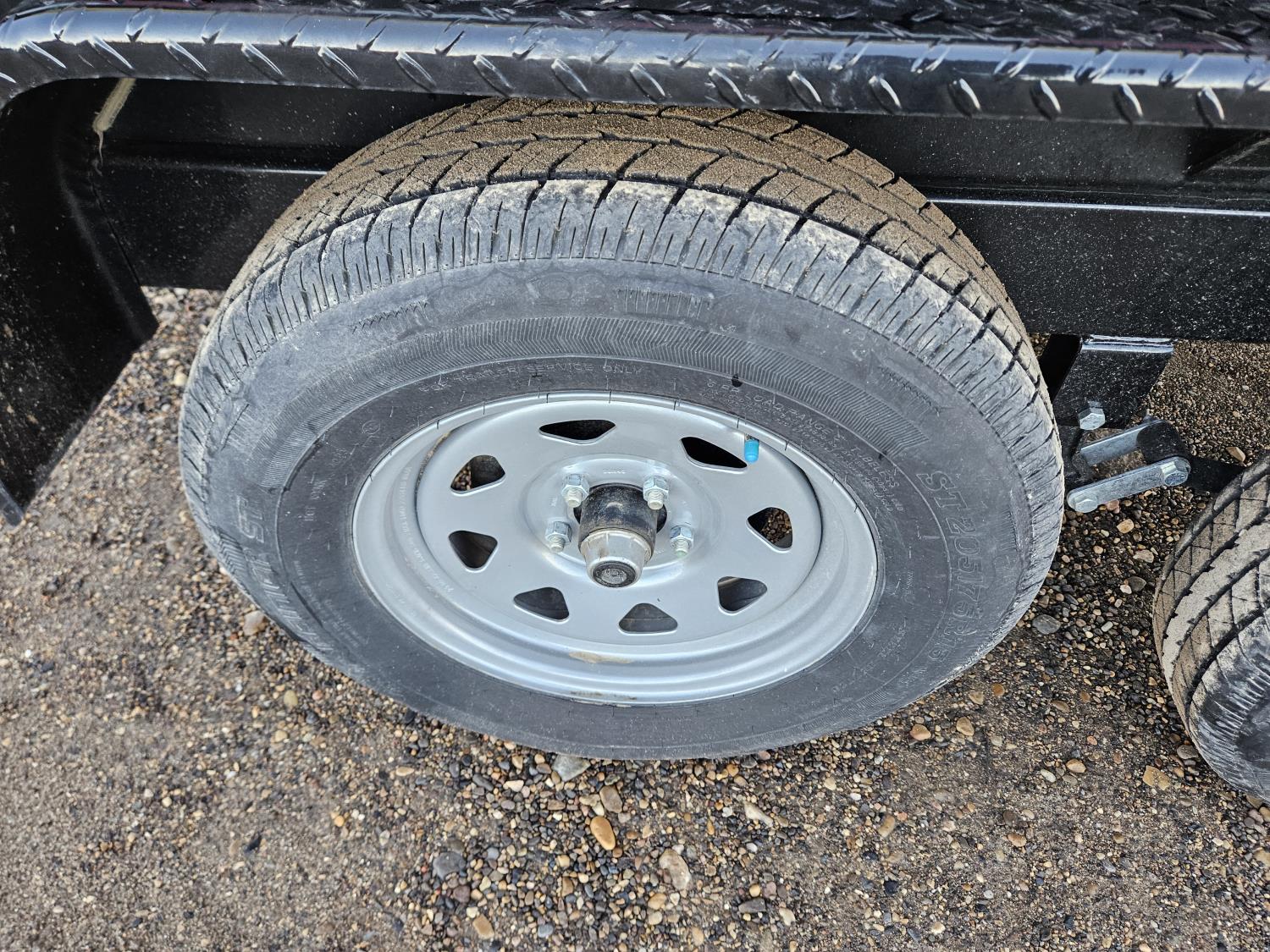 Ball hitch, 62 inch box width, 26 inch side wall height, roll tarp, corded lift remote, electric brakes, spring suspension, 3,500 lb axles, tie down d rings, 205/75R15 tires