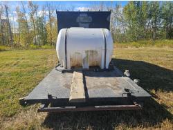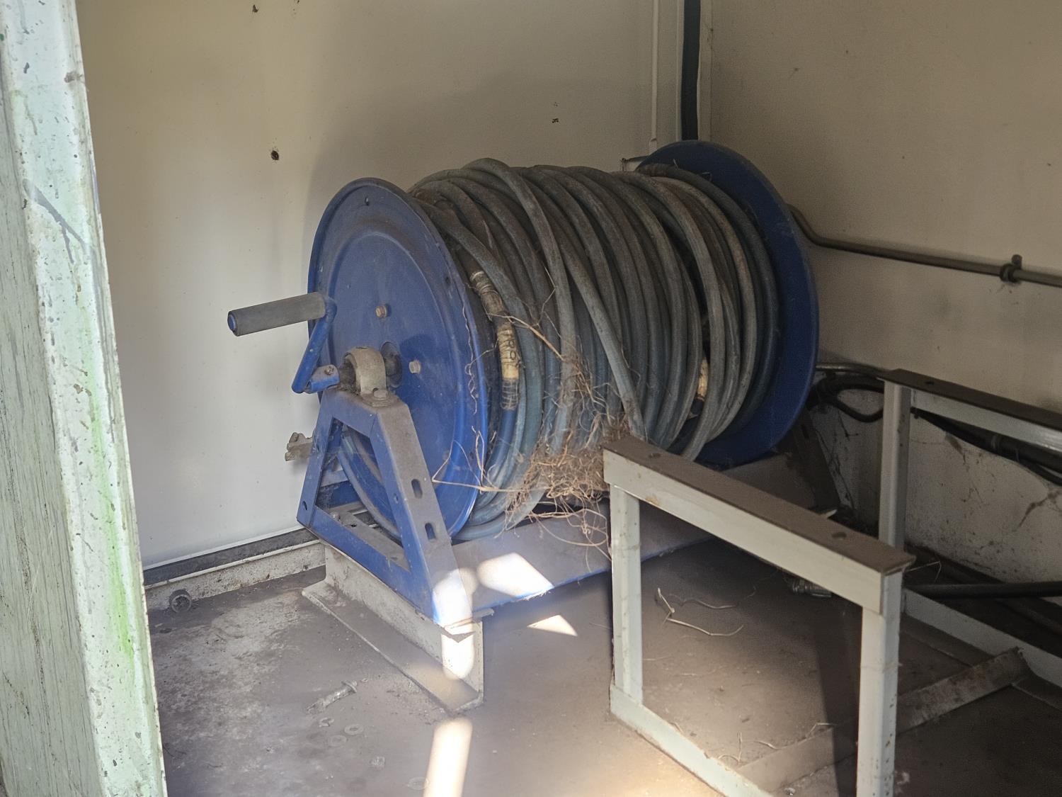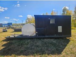 8 ft x 12 ft metal clad building, Honda 11 HP gas engine, pump, hose and reel, 72 inch x 57 inch x 60 inch poly tank, tool boxes, air compressor (no motor)